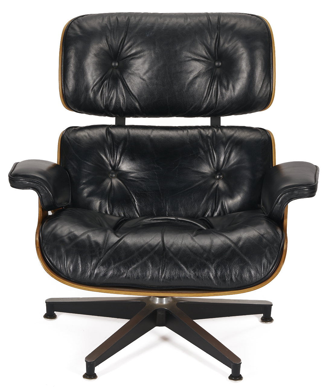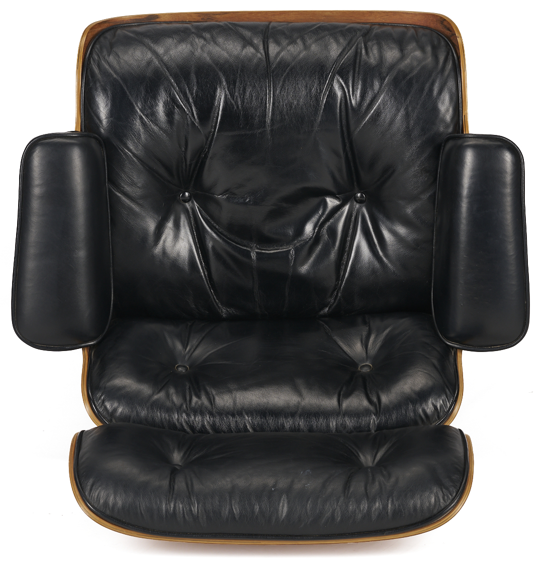 Eames No. 670 & 671 lounge chair and ottoman, made by Herman Miller and designed in 1956 by Charles Eames (American, 1907-1978) and Ray Eames (American, 1912-1988). Rosewood veneer shells with black leather cushions and cast aluminum bases. Early Herman Miller Black Strip labels to the undersides of the chair and ottoman, indicating manufacture between 1970 – 1984. Chair measures 31 1/4 in. H x 32 1/2 in. W x 28 in. D. Ottoman measures: 17 in. H x 25 1/2 in. W x 22 in. D. Note: Lot retains the original 1972 sales receipt.