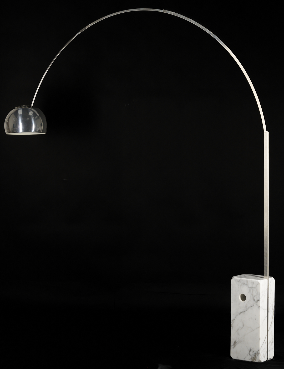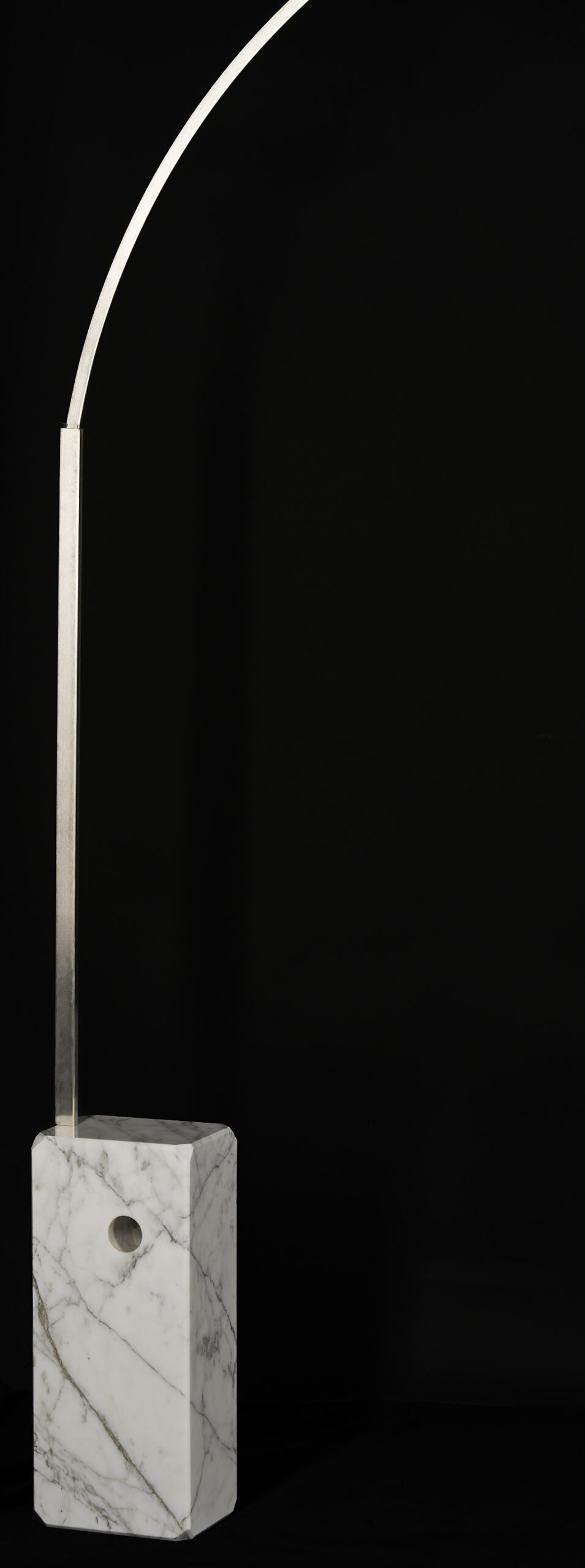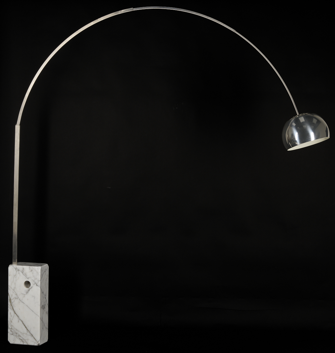 Mid-century modern Italian Arco floor lamp designed by Achille (1918-2002) and Pier Giacomo (1913-1968) Castiglioni, featuring a long and arched chrome metal arm and a rounded chrome metal shade set on a large rectangular marble base with notched corners. Signed FLOS MADE IN ITALY. 98 1/2 in. H x 13 in. D x 78 1/2 in. W. Italy, 20th century.