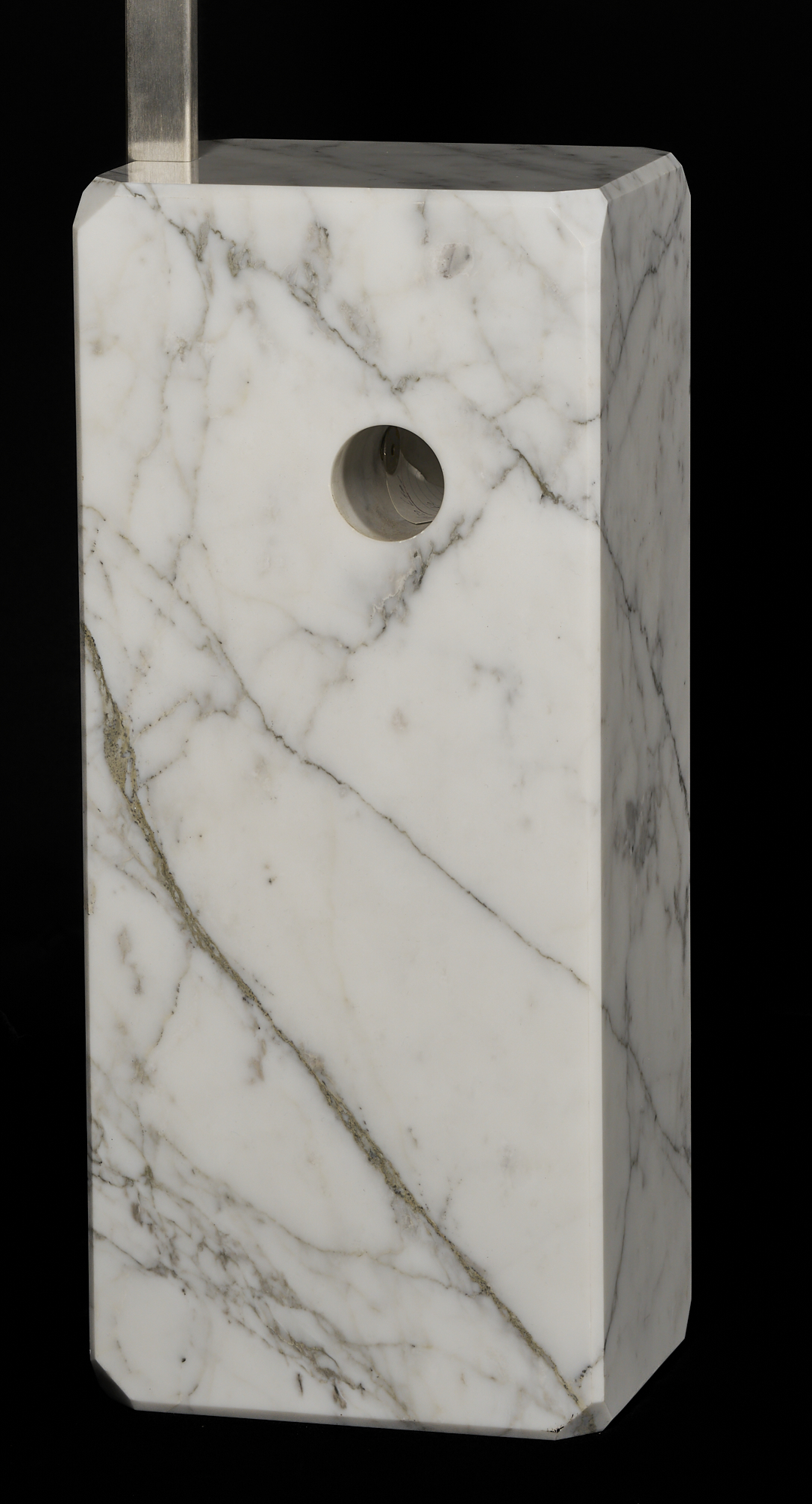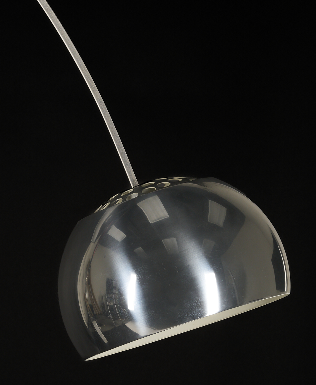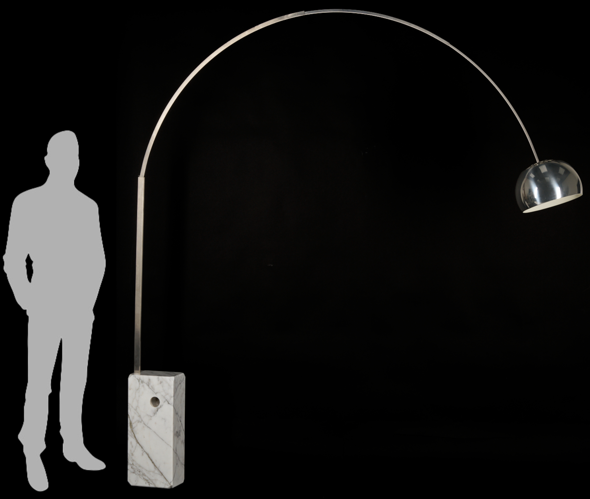 Mid-century modern Italian Arco floor lamp designed by Achille (1918-2002) and Pier Giacomo (1913-1968) Castiglioni, featuring a long and arched chrome metal arm and a rounded chrome metal shade set on a large rectangular marble base with notched corners. Signed FLOS MADE IN ITALY. 98 1/2 in. H x 13 in. D x 78 1/2 in. W. Italy, 20th century.