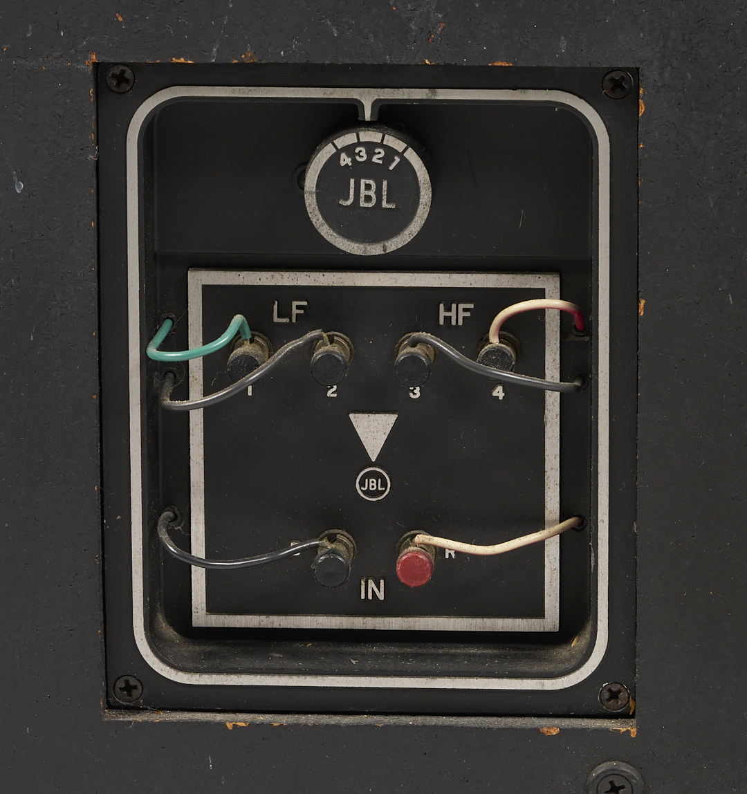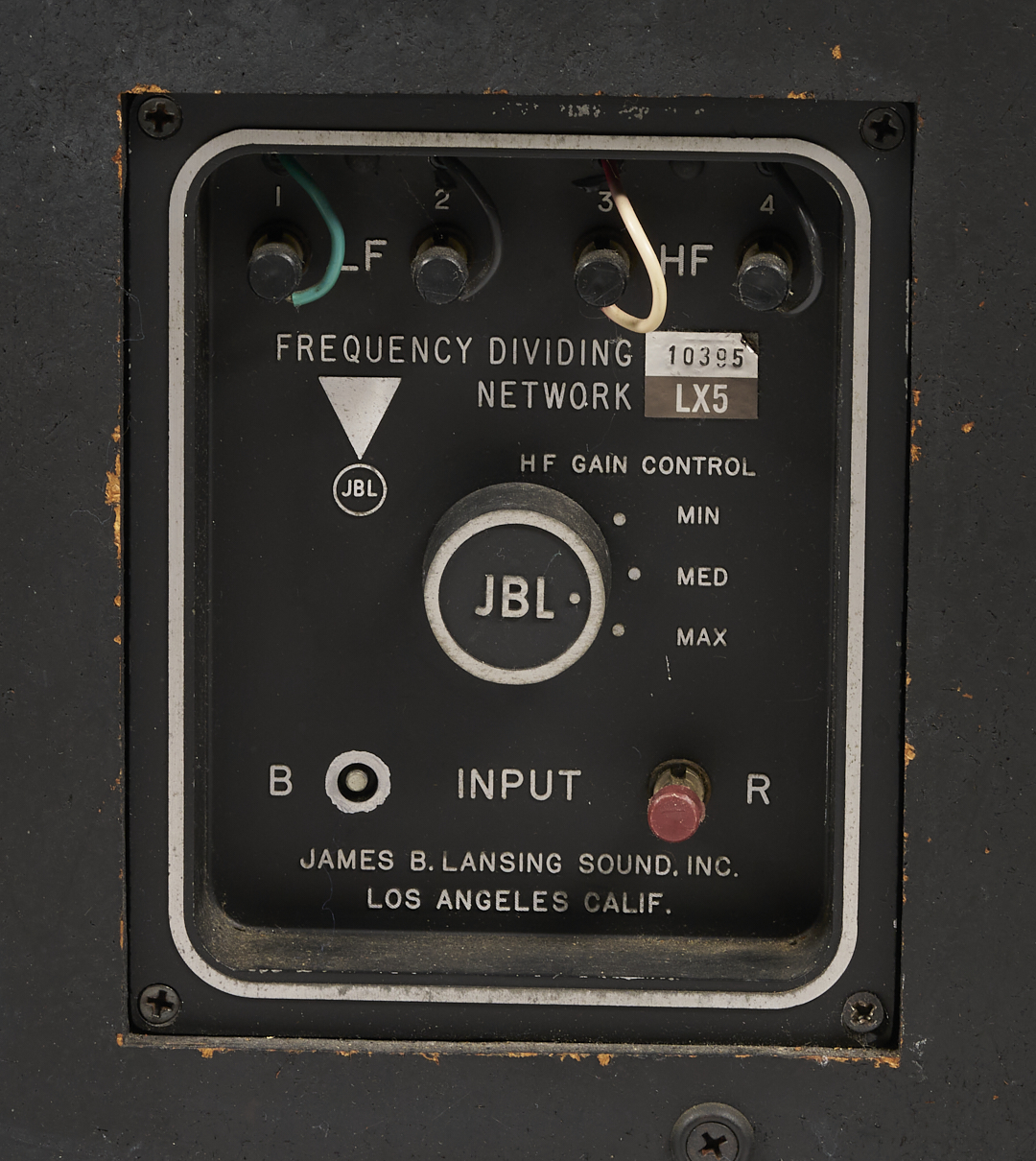 CONDITION: Scattered water spotting to the top; two 1 in. dark spots, possibly cigarette burns; One push-button terminal post missing (right side). One “JBL” crossover knob missing (left side). Manuals with handwriting. Unit operational at time of consignment, although would benefit from servicing.