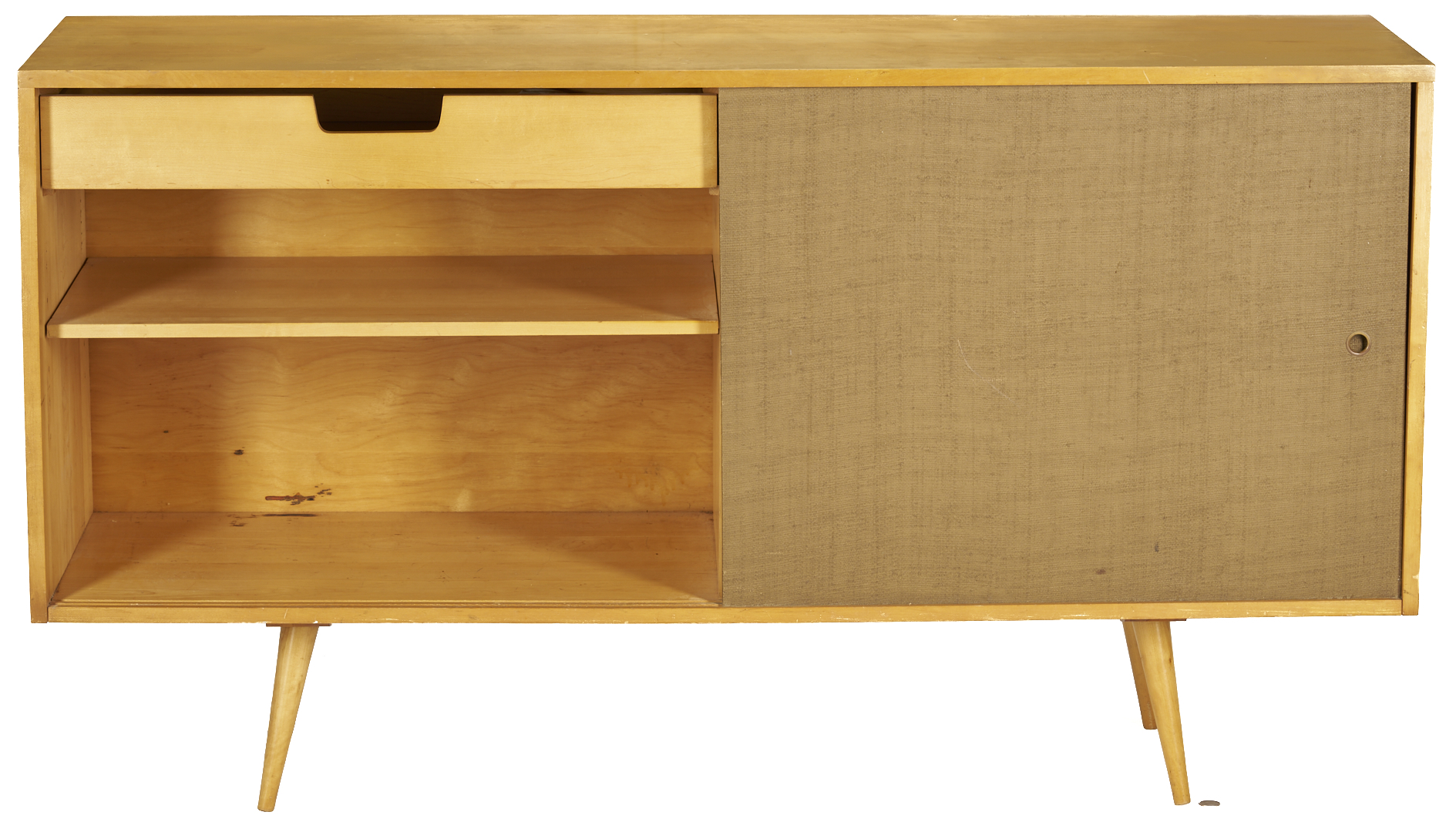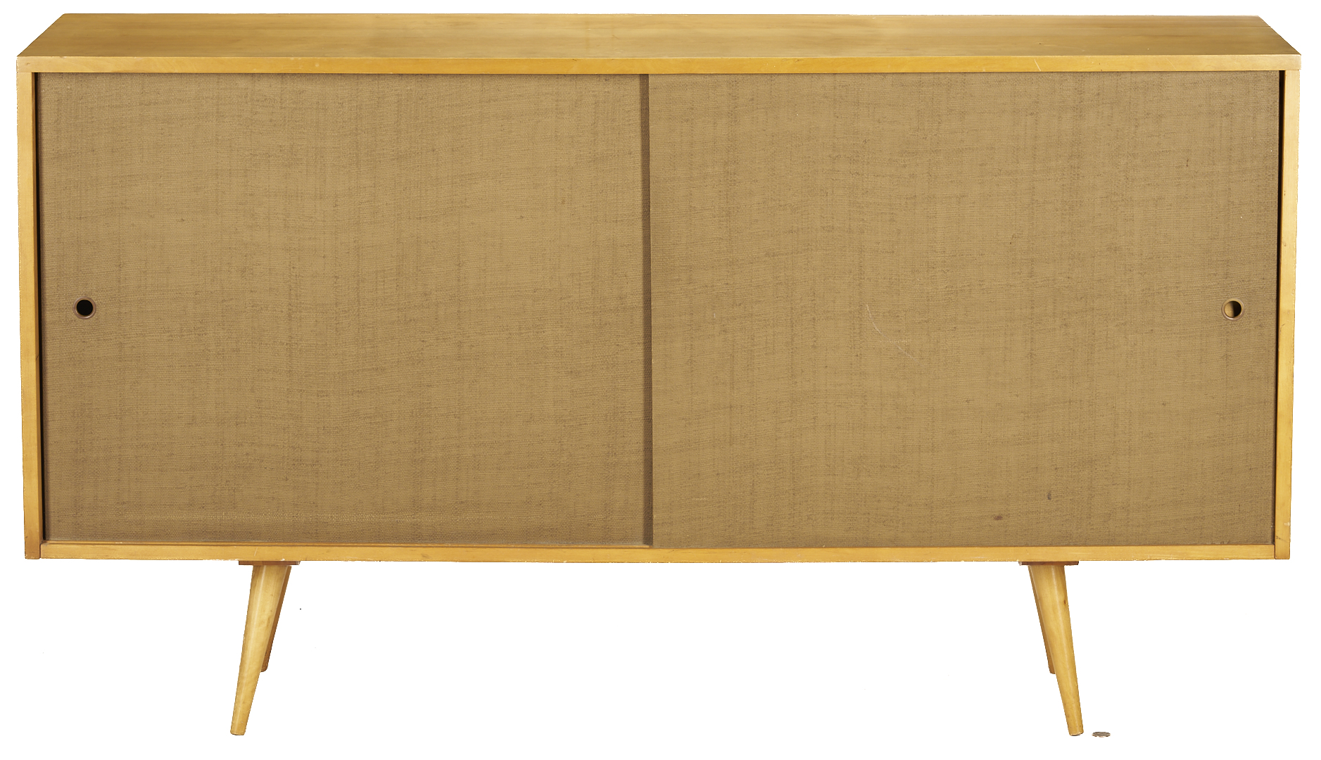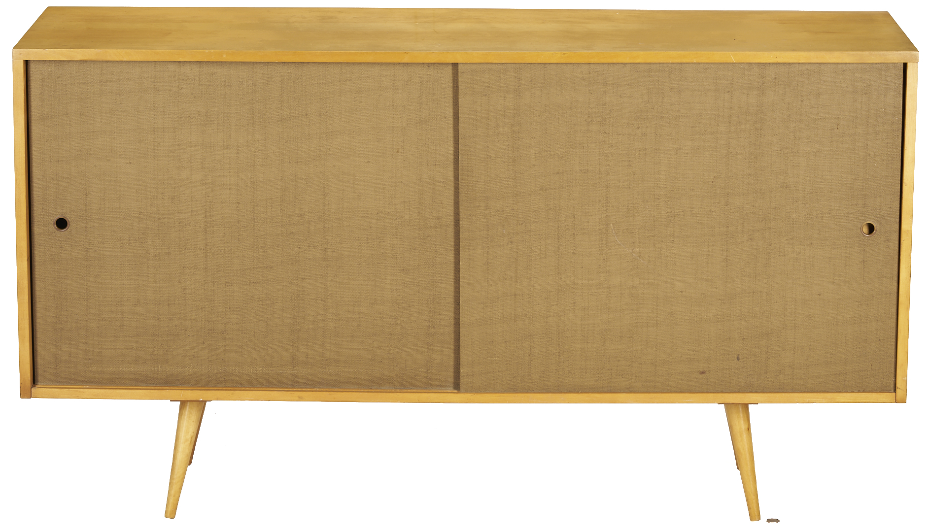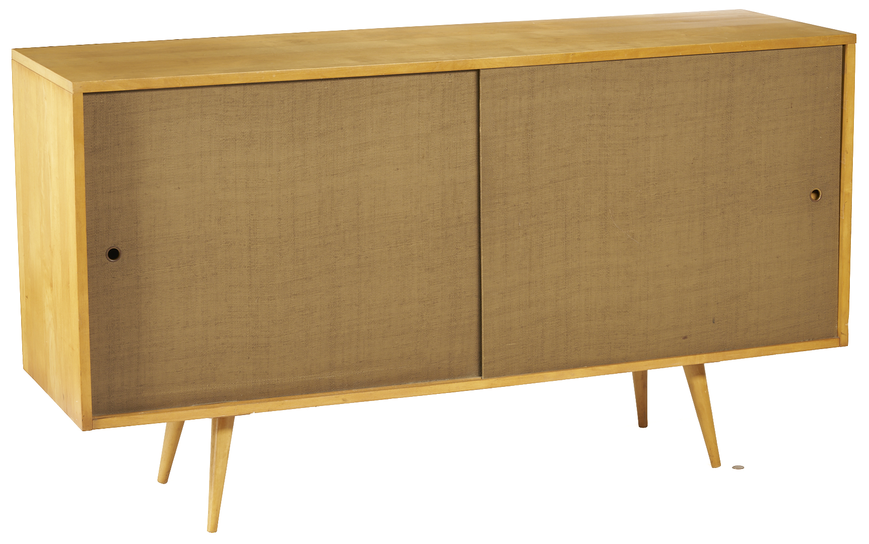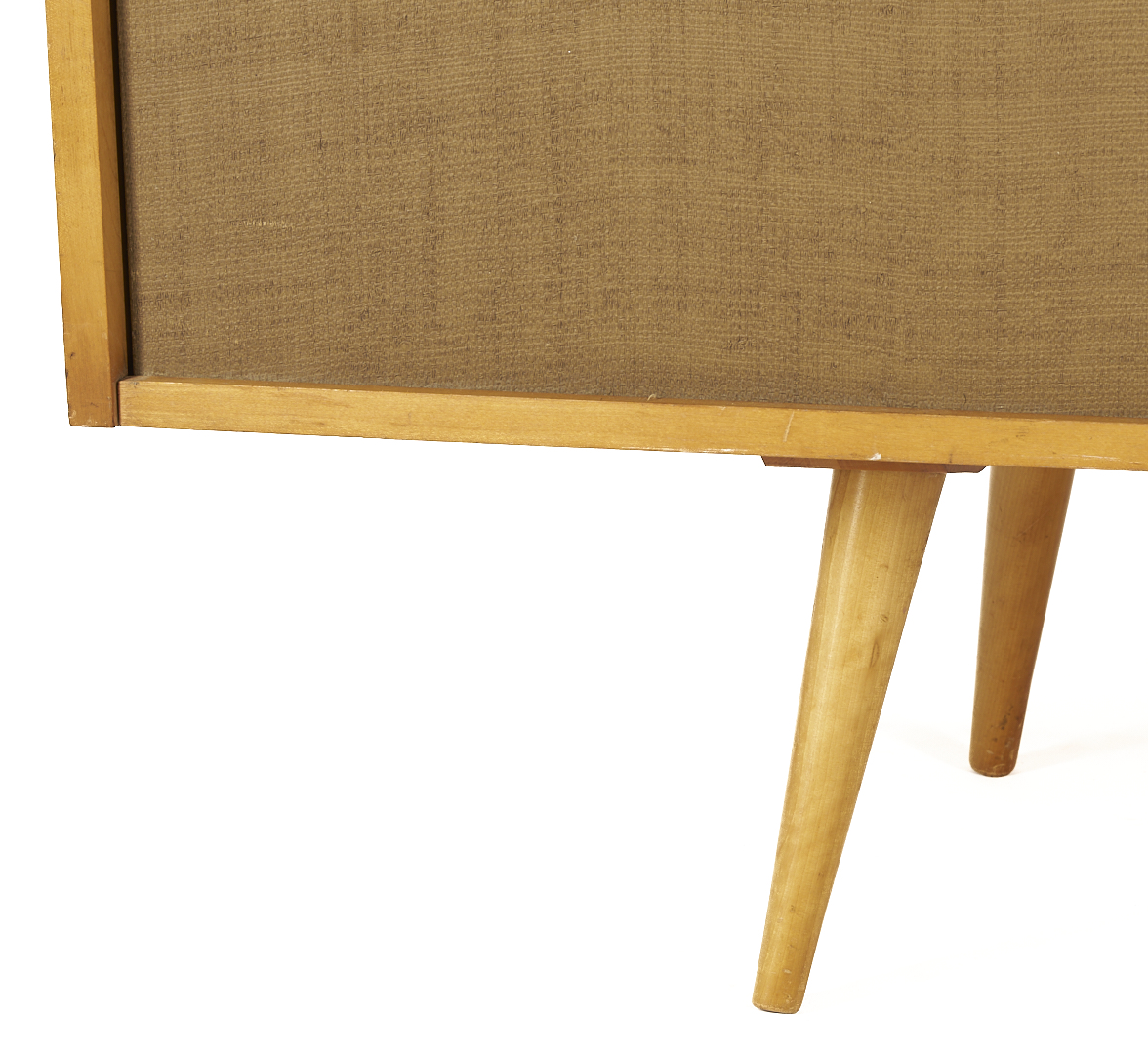 Paul McCobb (American 1917-1969) designed cabinet from the Mid-Century Modern Planner Group by Winchendon. Rectangular form with two grasscloth-covered sliding doors revealing a fitted interior including shelves and pullout drawers, all on tall splayed turned feet. Paul McCobb brand to the lower drawer on the right. 33 1/4 in. H x 60 in. W x 18 1/4 in. D. Circa 1950s.