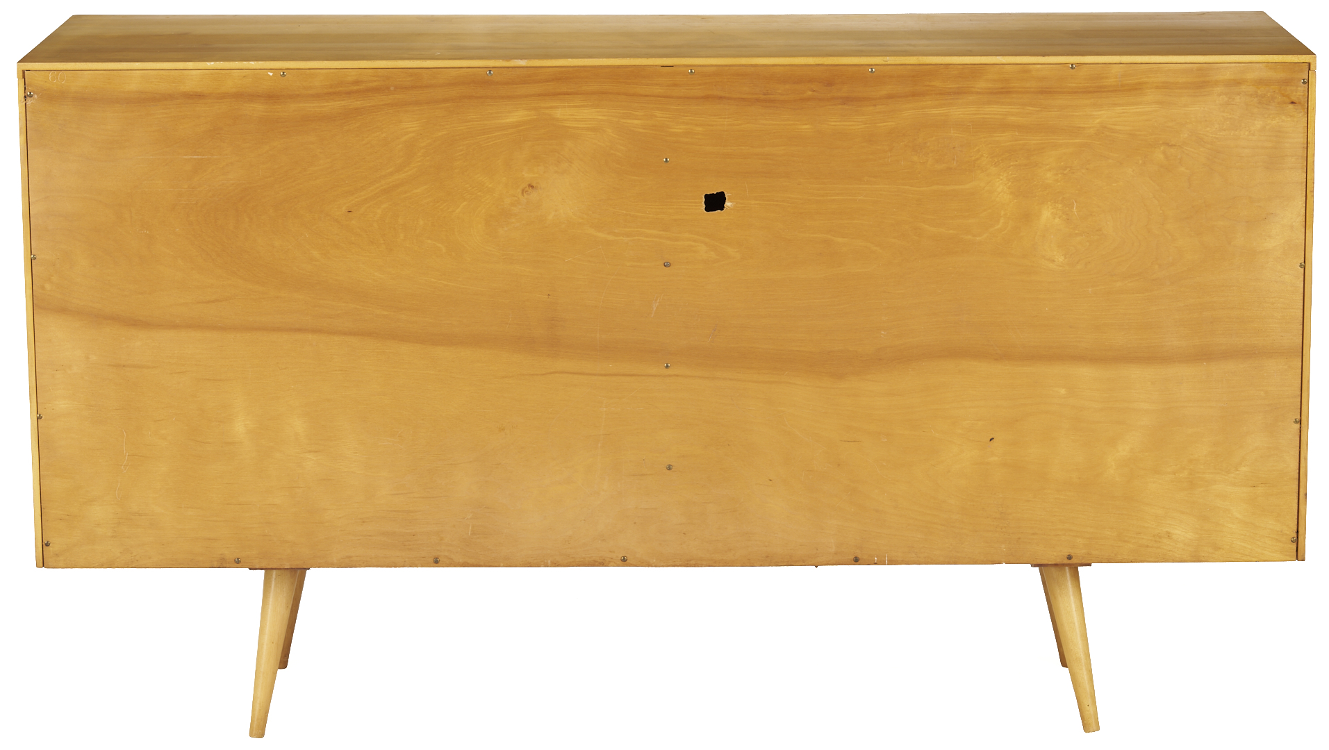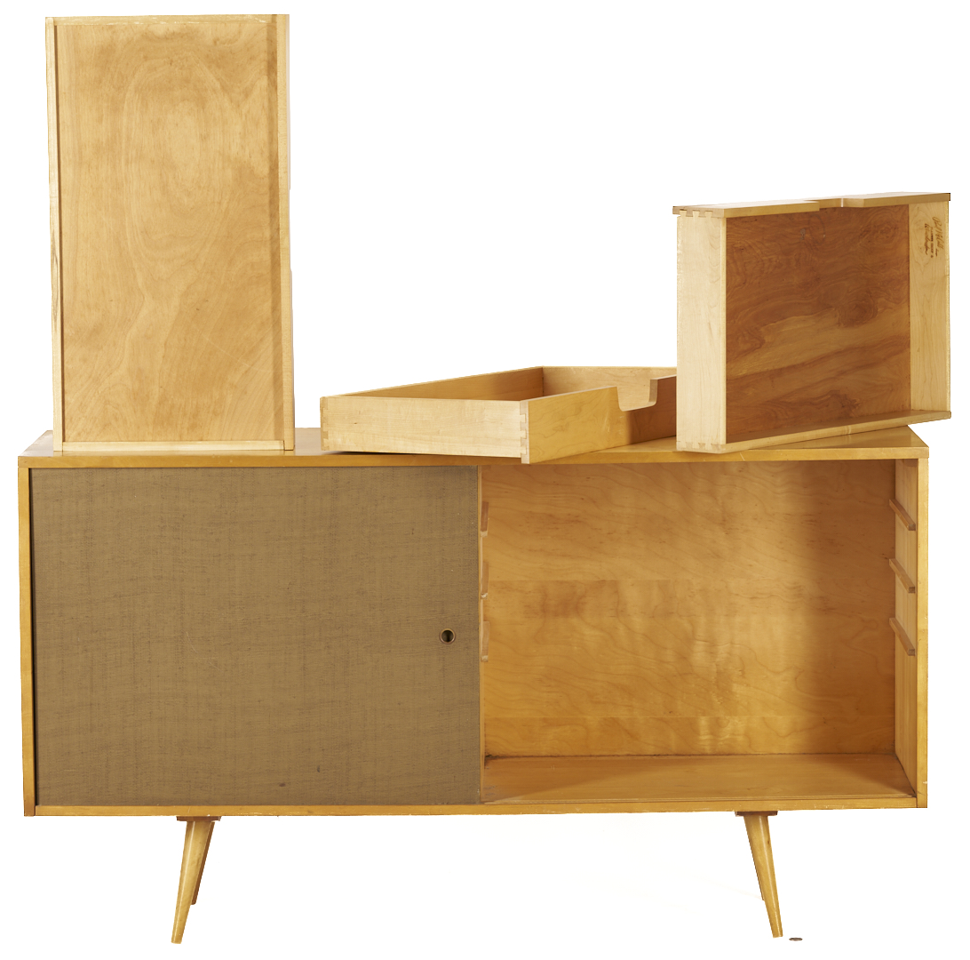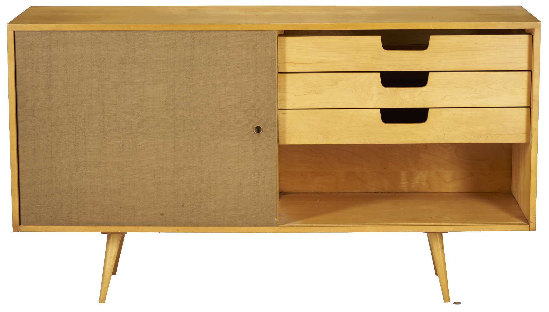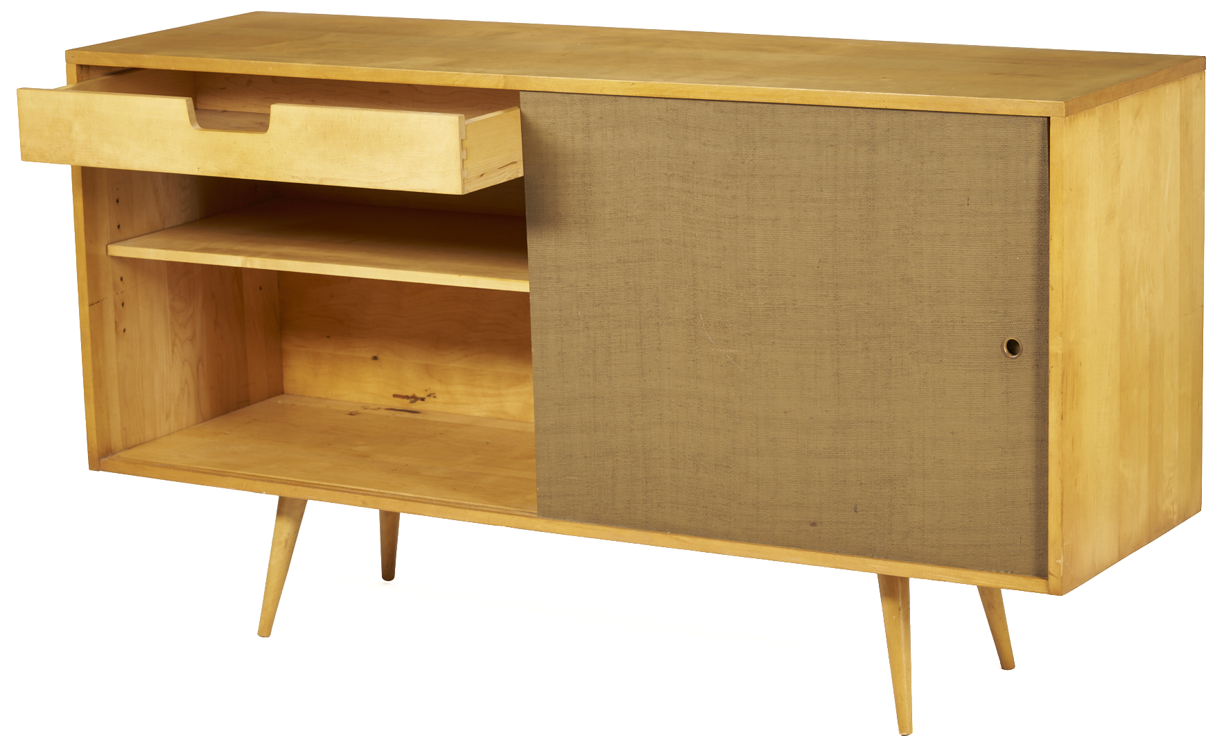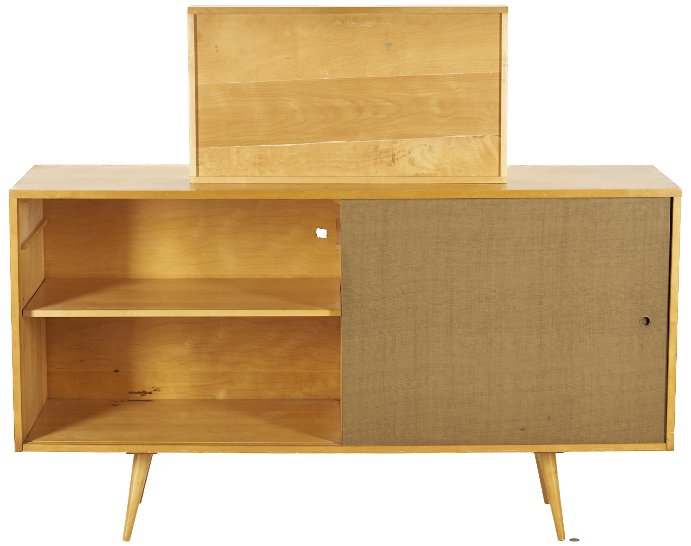 Paul McCobb (American 1917-1969) designed cabinet from the Mid-Century Modern Planner Group by Winchendon. Rectangular form with two grasscloth-covered sliding doors revealing a fitted interior including shelves and pullout drawers, all on tall splayed turned feet. Paul McCobb brand to the lower drawer on the right. 33 1/4 in. H x 60 in. W x 18 1/4 in. D. Circa 1950s.