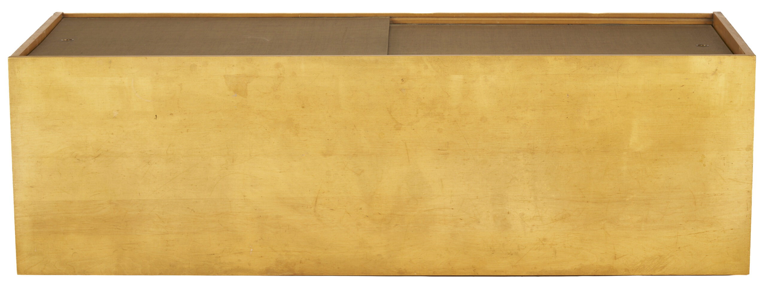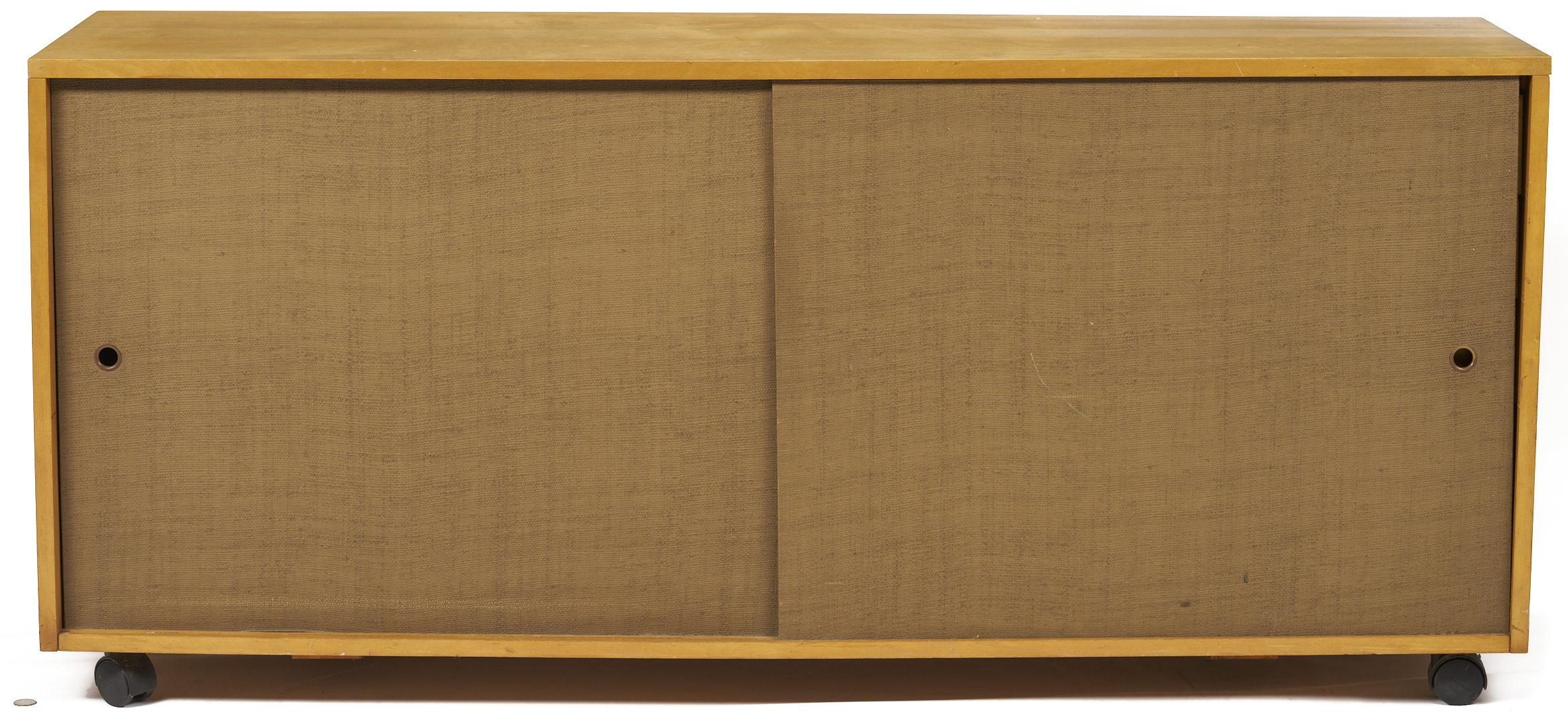 CONDITION: Cabinet retains the original finish with scattered light abrasions and wear to the surface, primarily to the top. The grasscloth cover on the left door is slightly loose in one area on the door base.