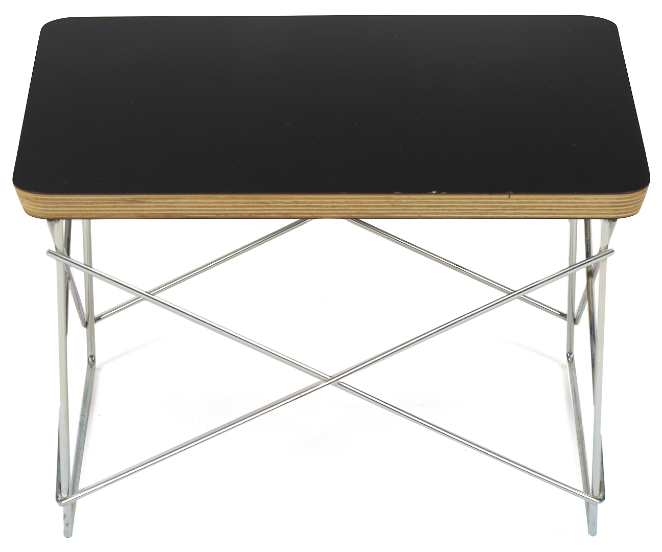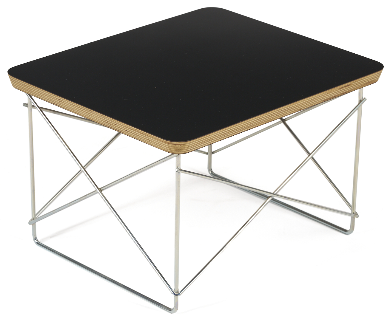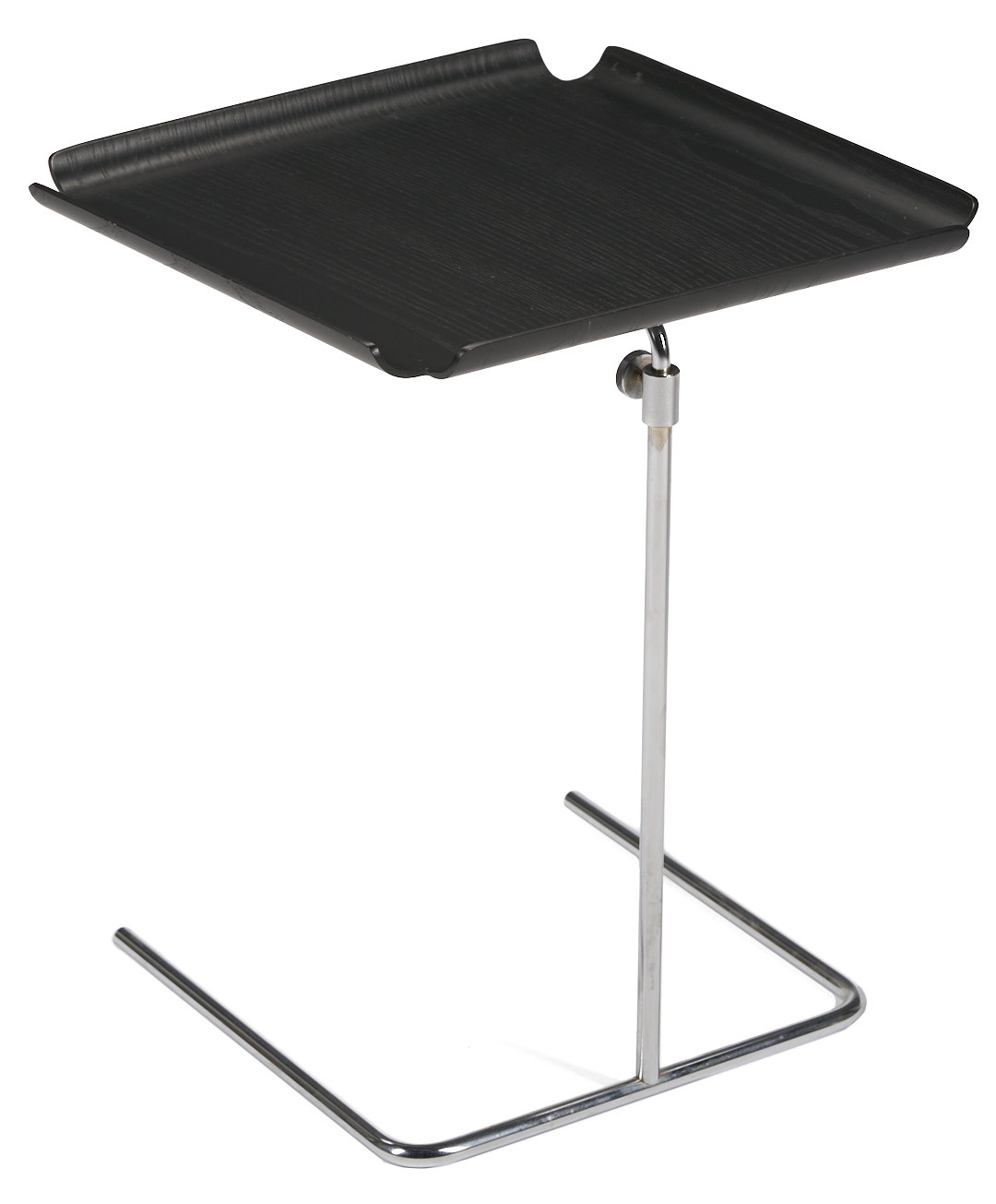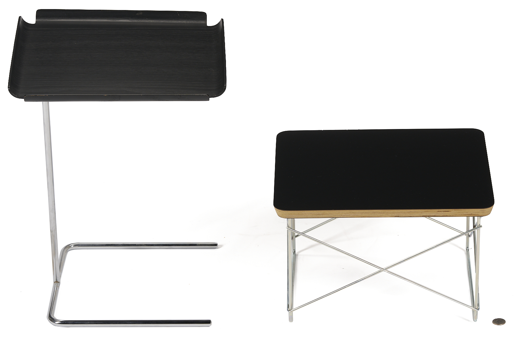1st item: Mid-Century George Nelson for Herman Miller Model 4950 adjustable tray table, consisting of a molded black tray top on an adjustable chrome base. Herman Miller label with George Nelson signature on the base underside. Circa 1950s. 19 in. H (lowest H) x 15 in. Sq. 2nd item: Eames for Herman Miller LTR table with black veneer top and molded chrome wire base. Herman Miller label with Eames signature on the base underside. Late 20th century. 10 in. H x 15 1/2 in. W x 13 1/4 in. D.