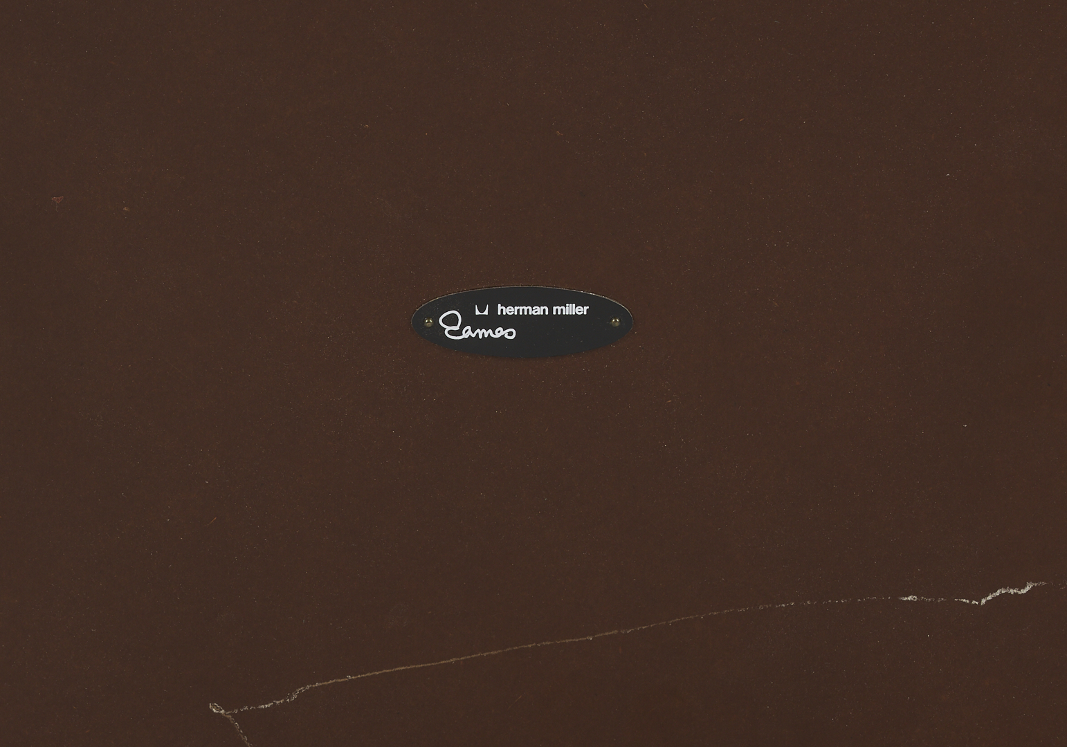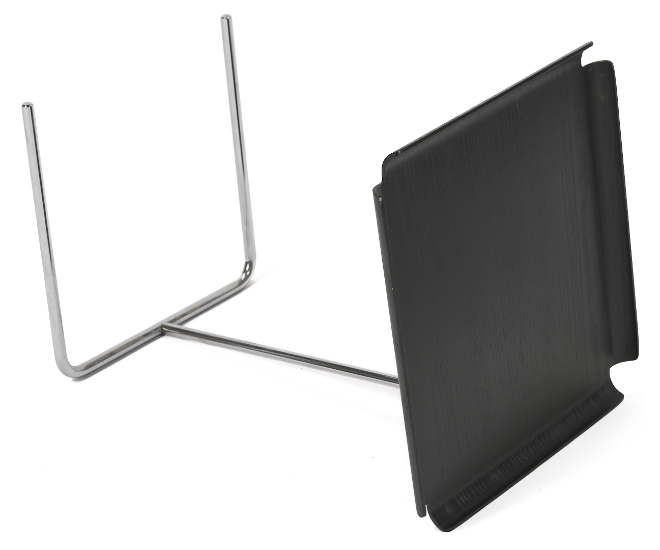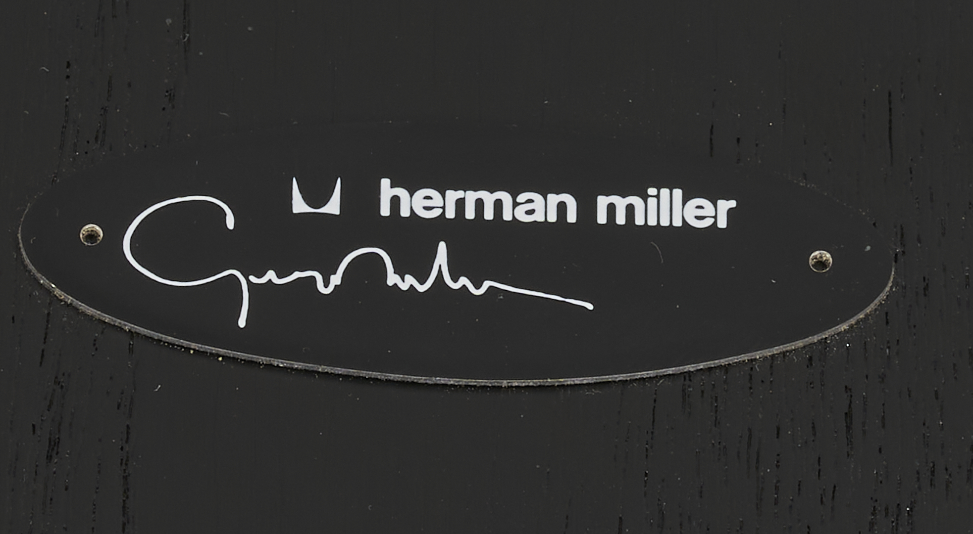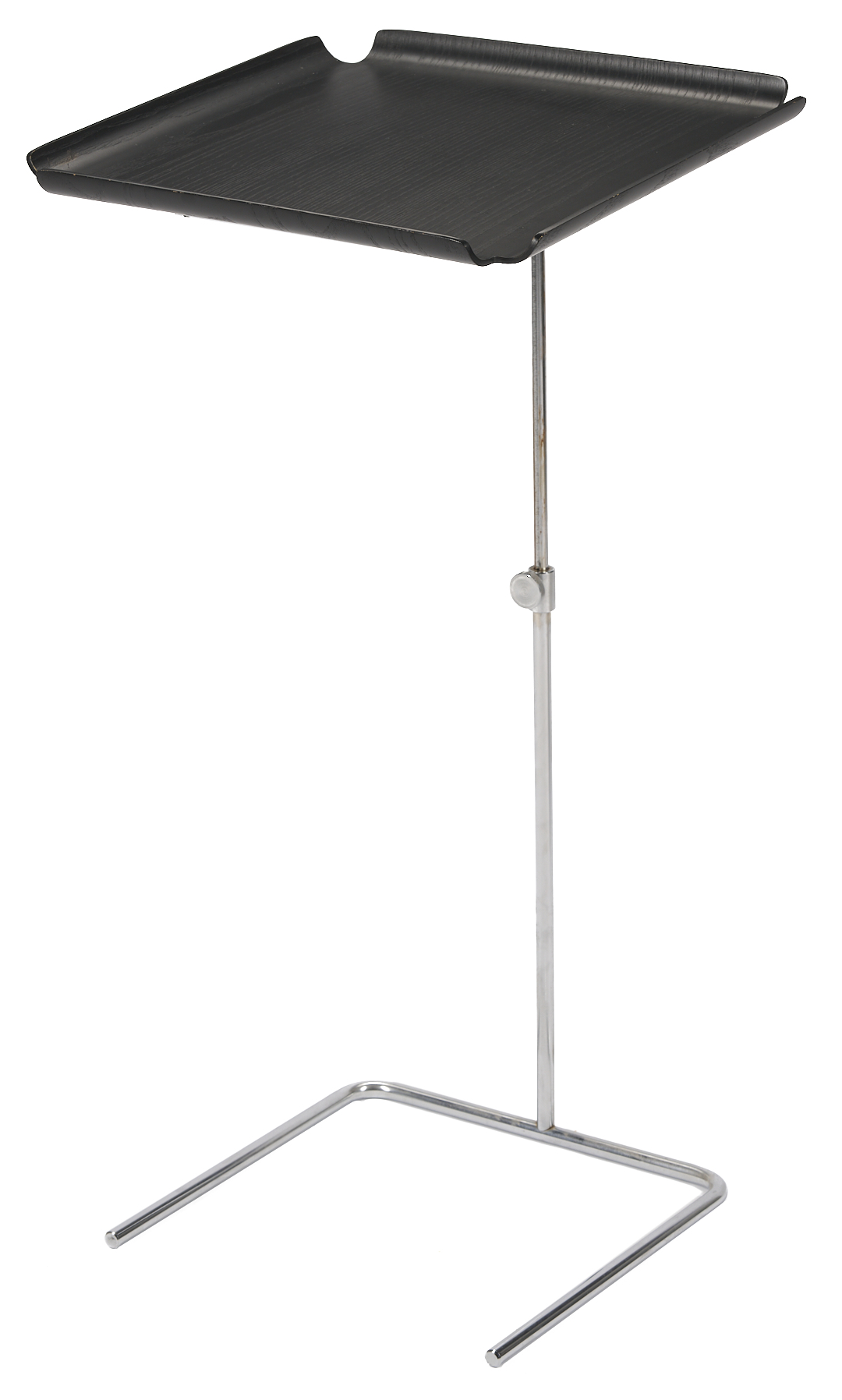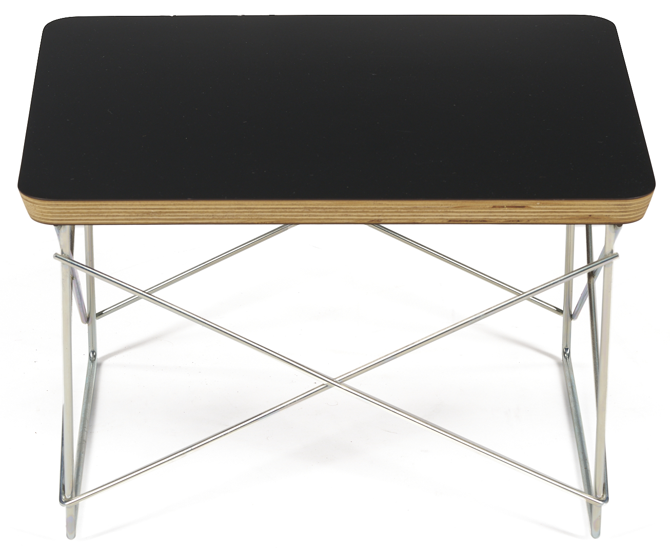 1st item: Mid-Century George Nelson for Herman Miller Model 4950 adjustable tray table, consisting of a molded black tray top on an adjustable chrome base. Herman Miller label with George Nelson signature on the base underside. Circa 1950s. 19 in. H (lowest H) x 15 in. Sq. 2nd item: Eames for Herman Miller LTR table with black veneer top and molded chrome wire base. Herman Miller label with Eames signature on the base underside. Late 20th century. 10 in. H x 15 1/2 in. W x 13 1/4 in. D.