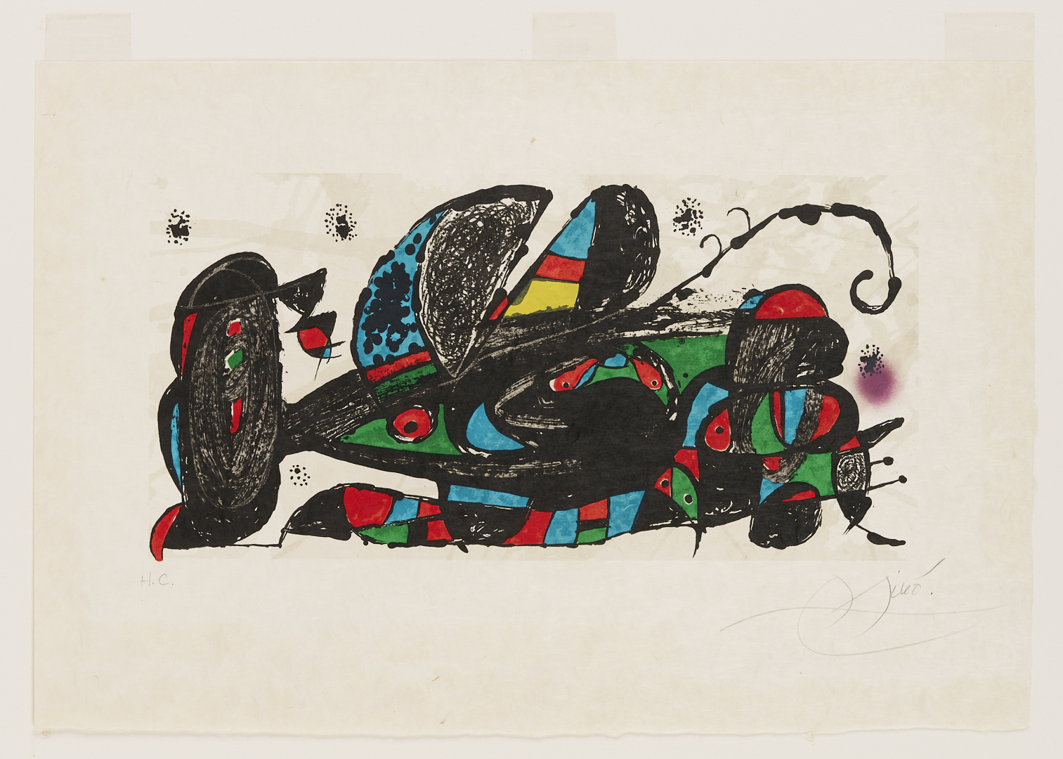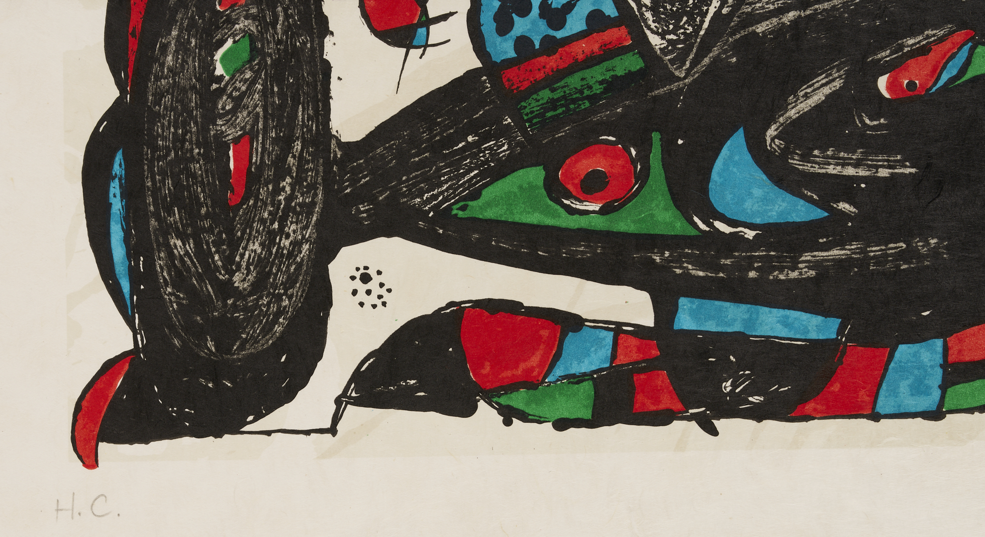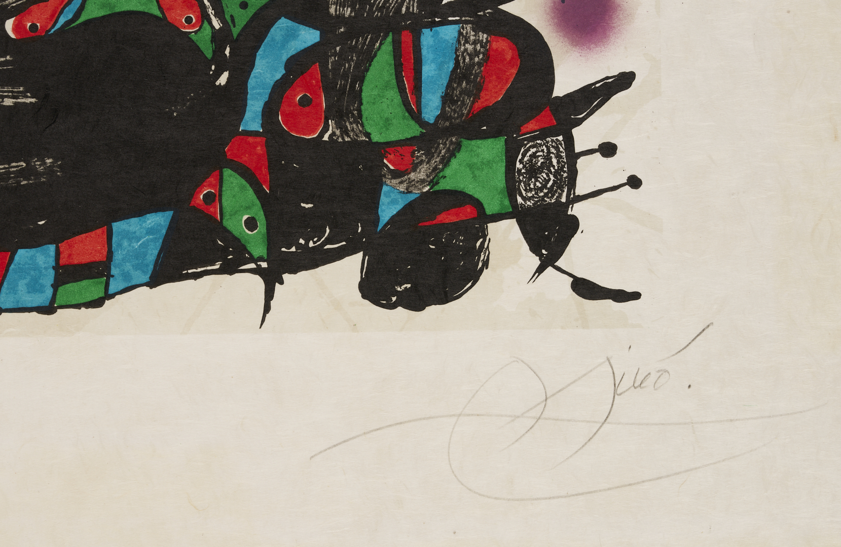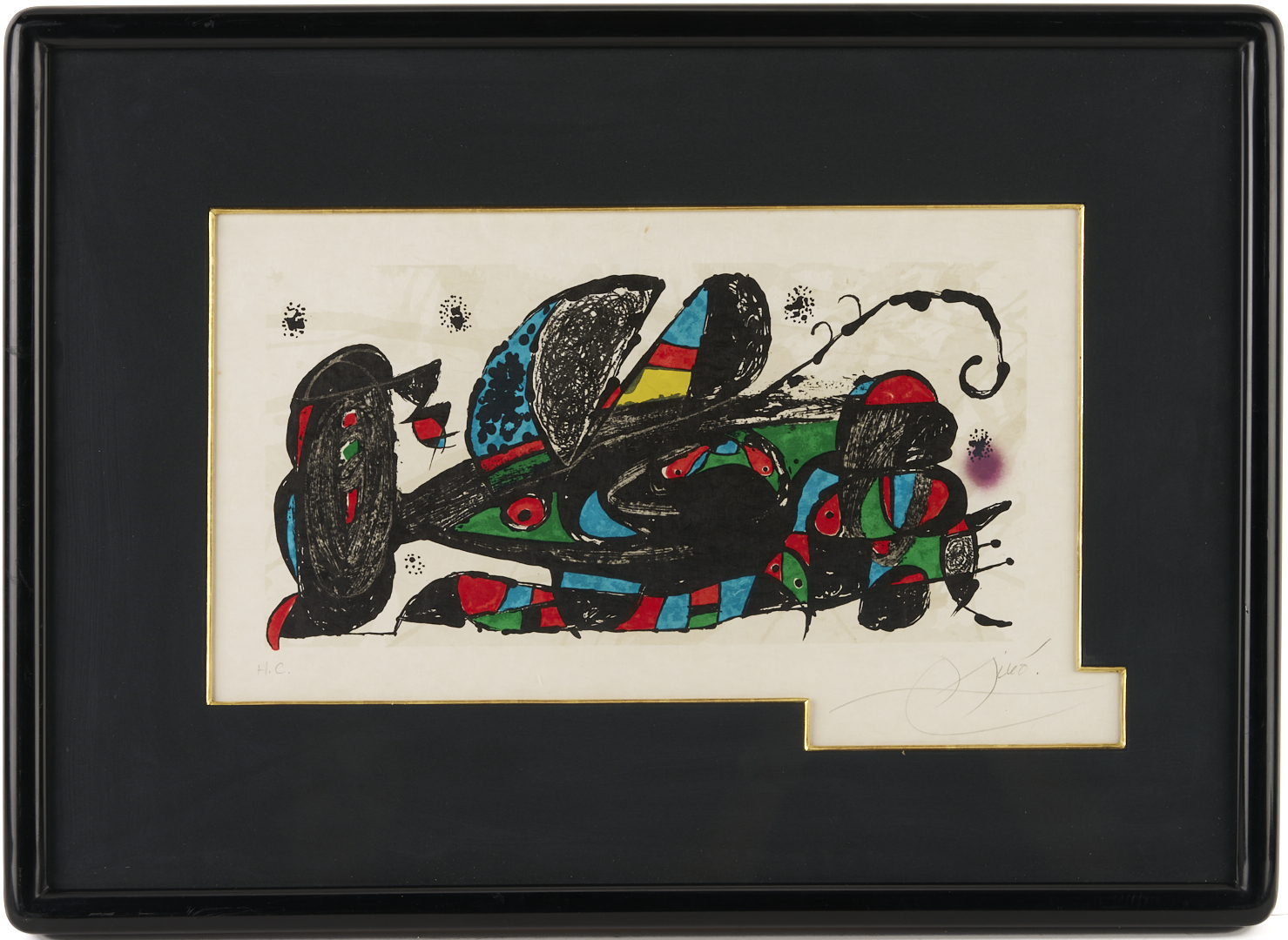 Joan Miro (Spanish, 1893-1983) abstract lithograph on Japon paper, “Iran,” from the Escultor series, 1974. Printed by Poligrafa, Barcelona. One of ten Hors d’Commerce impressions on Japon paper. Signed in pencil, lower right, and editioned H.C. lower left. Sheet: 13 5/8 in. H x 20 5/16 in. W. Framed: 19 in. H x 26 in. W. Ref.: Cramer Books 191. Housed under glass in an ebonized wood frame with custom black mat with gilt fillet. A 1978 Catchpenny Art Gallery, Tarzana, CA certificate of authenticity signed by Charles Hecht and 1990 Galerie Michael, Beverly Hills, CA certificate of appraisal signed by Ivo Kirschen are available to the winning bidder. Note: The Escultor (Sculptor) series includes seven lithographs titled after countries that underwent significant political reforms (and thus were figuratively sculpted) in 1974. The series includes 120 impressions on Guerro paper (100 numbered in Arabic numerals, ten H.C. impressions, and ten A.P. impressions) and 70 impressions on Japon paper (50 numbered in Roman numerals, ten H.C. impressions, and ten A.P. impressions). Also available to the winning bidder is an unframed “Carota” offset lithograph poster printed by Arti Grafische Ricordi, Milan, 1988. 31 1/2 in. H x 23 3/4 in. W.