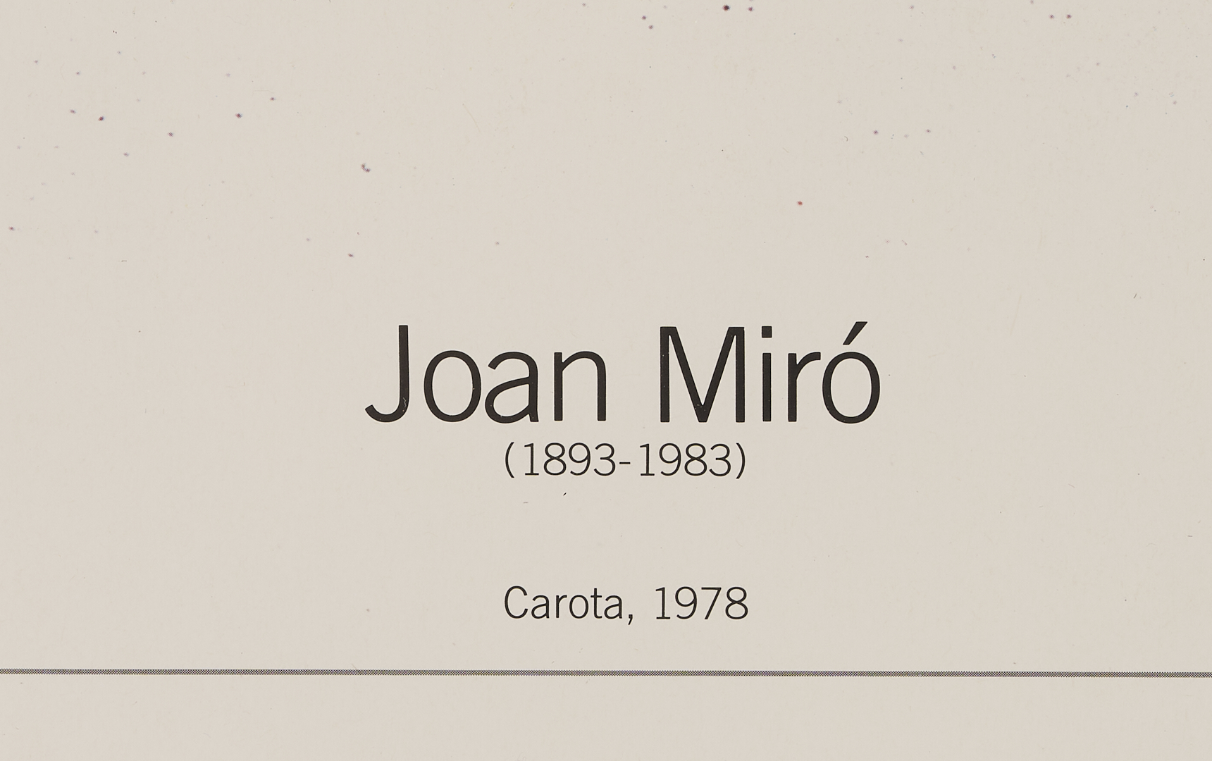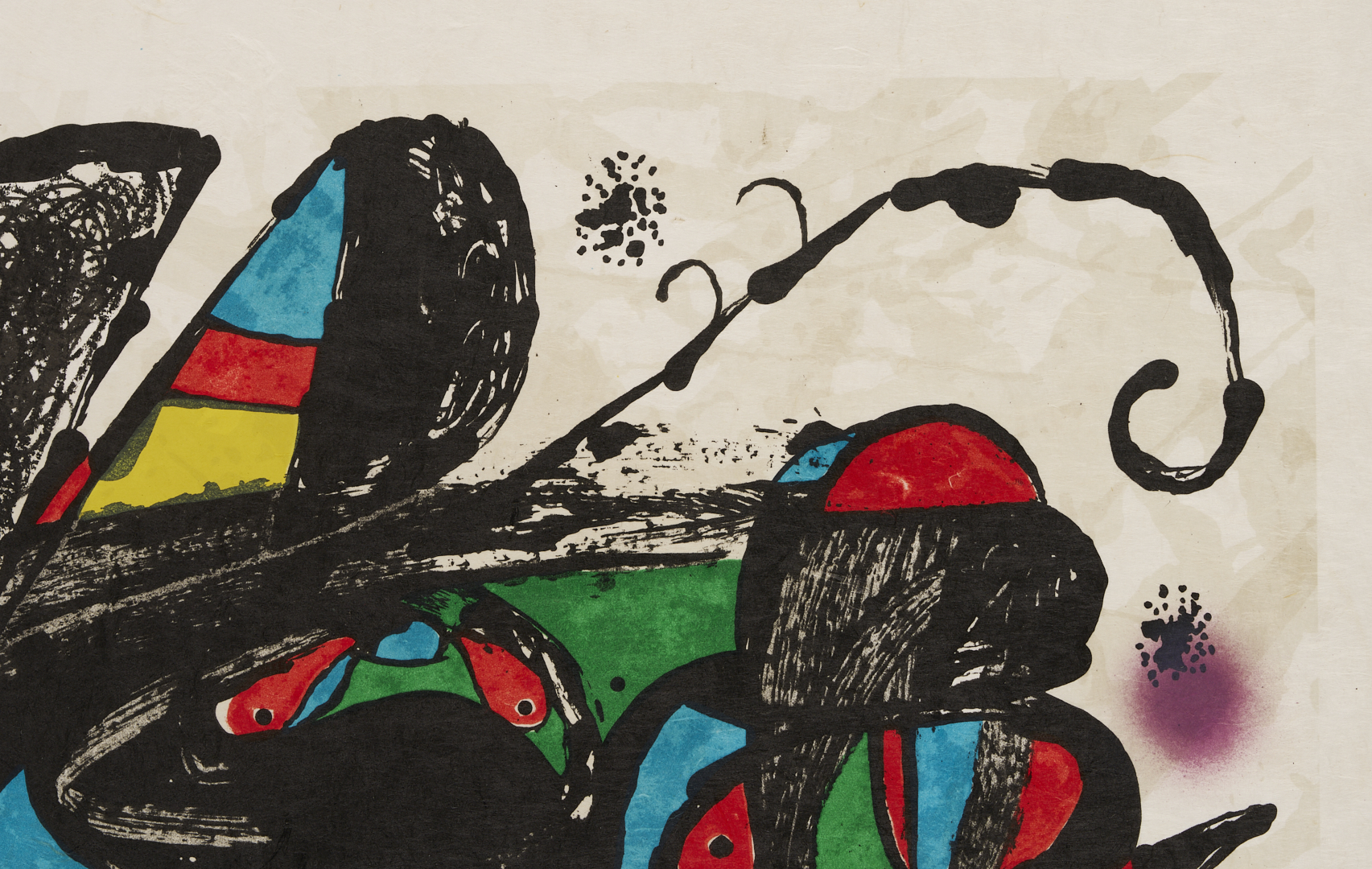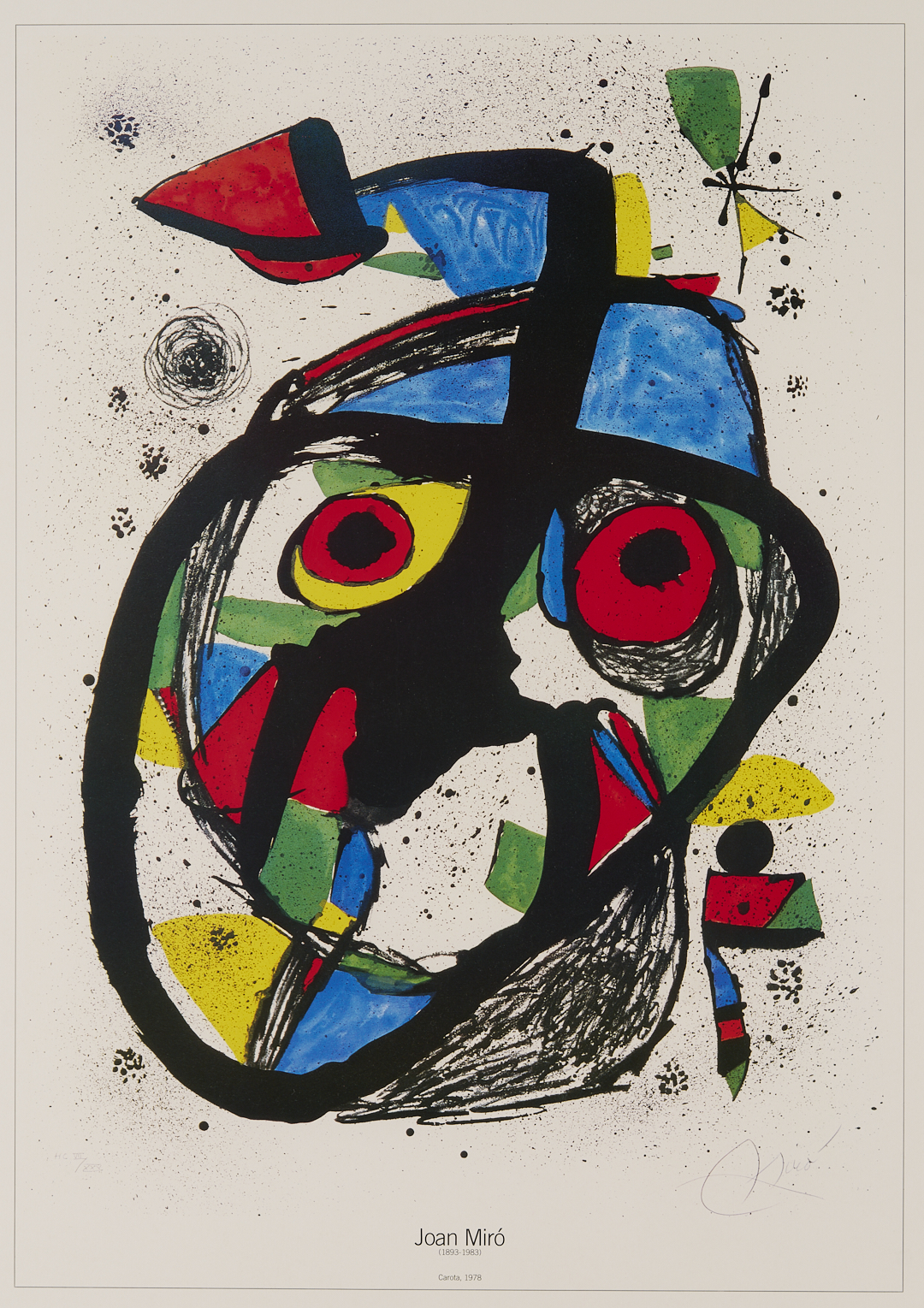 Joan Miro (Spanish, 1893-1983) abstract lithograph on Japon paper, “Iran,” from the Escultor series, 1974. Printed by Poligrafa, Barcelona. One of ten Hors d’Commerce impressions on Japon paper. Signed in pencil, lower right, and editioned H.C. lower left. Sheet: 13 5/8 in. H x 20 5/16 in. W. Framed: 19 in. H x 26 in. W. Ref.: Cramer Books 191. Housed under glass in an ebonized wood frame with custom black mat with gilt fillet. A 1978 Catchpenny Art Gallery, Tarzana, CA certificate of authenticity signed by Charles Hecht and 1990 Galerie Michael, Beverly Hills, CA certificate of appraisal signed by Ivo Kirschen are available to the winning bidder. Note: The Escultor (Sculptor) series includes seven lithographs titled after countries that underwent significant political reforms (and thus were figuratively sculpted) in 1974. The series includes 120 impressions on Guerro paper (100 numbered in Arabic numerals, ten H.C. impressions, and ten A.P. impressions) and 70 impressions on Japon paper (50 numbered in Roman numerals, ten H.C. impressions, and ten A.P. impressions). Also available to the winning bidder is an unframed “Carota” offset lithograph poster printed by Arti Grafische Ricordi, Milan, 1988. 31 1/2 in. H x 23 3/4 in. W.