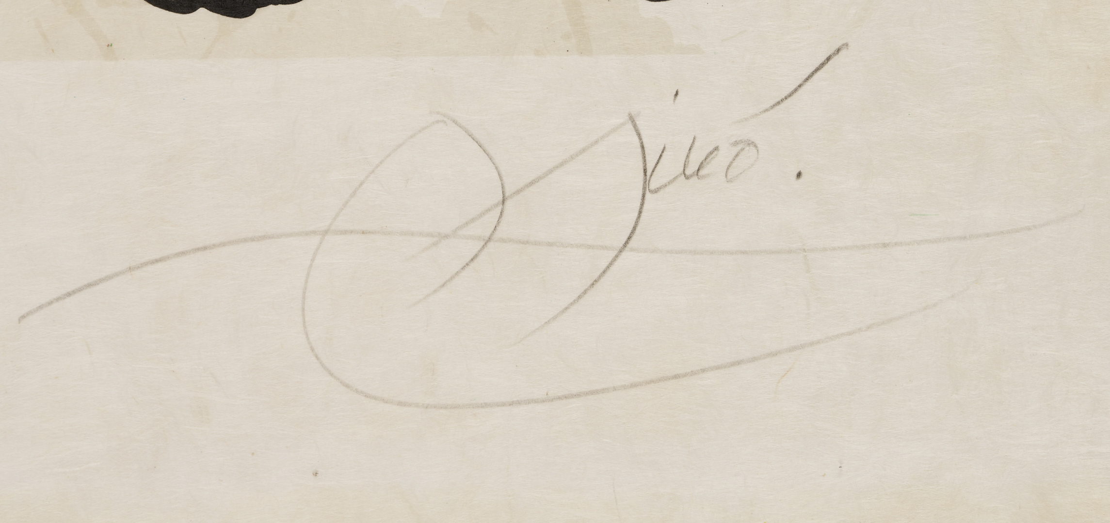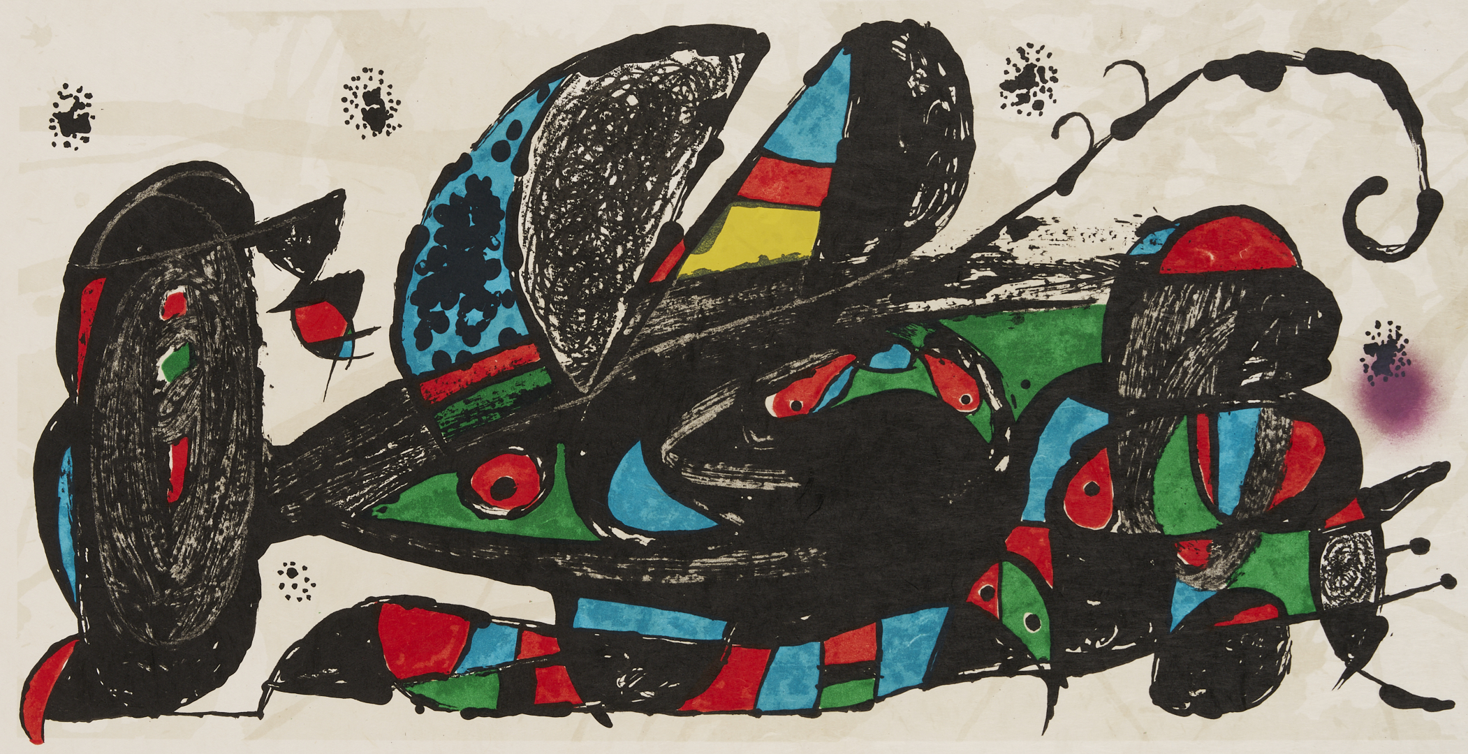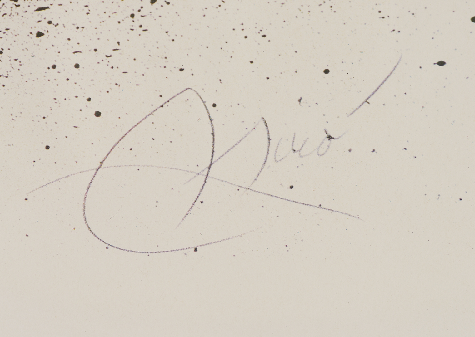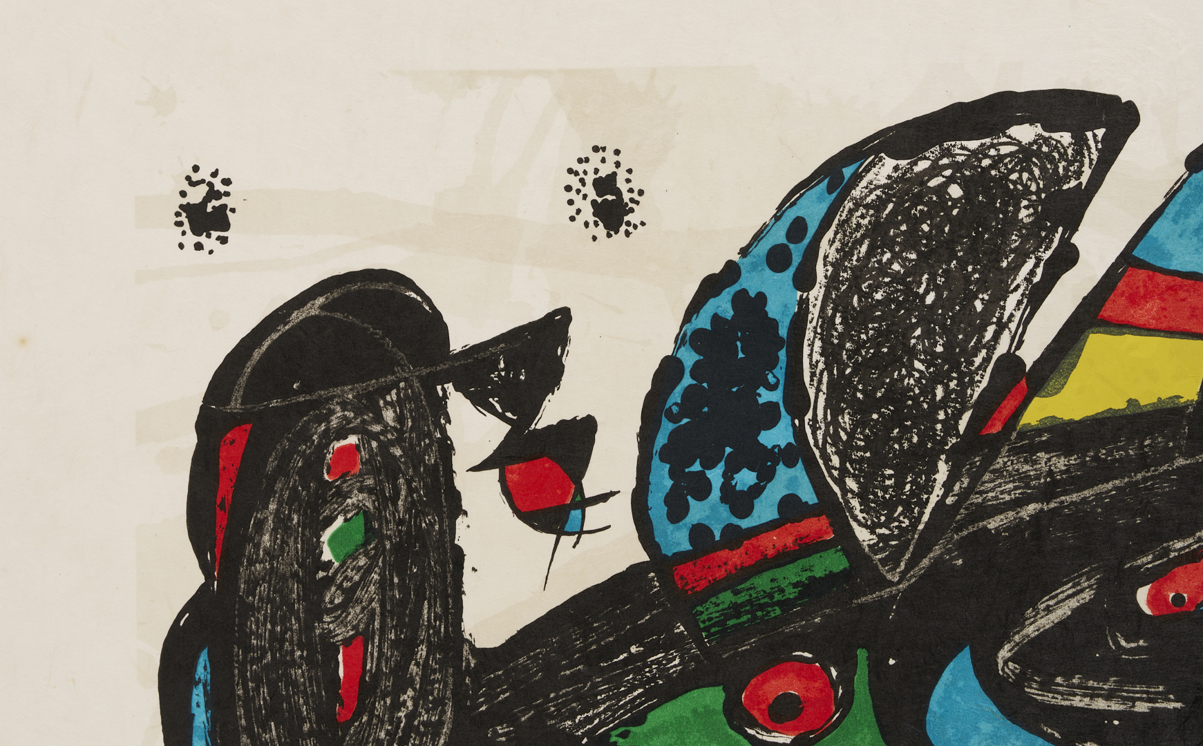 Joan Miro (Spanish, 1893-1983) abstract lithograph on Japon paper, “Iran,” from the Escultor series, 1974. Printed by Poligrafa, Barcelona. One of ten Hors d’Commerce impressions on Japon paper. Signed in pencil, lower right, and editioned H.C. lower left. Sheet: 13 5/8 in. H x 20 5/16 in. W. Framed: 19 in. H x 26 in. W. Ref.: Cramer Books 191. Housed under glass in an ebonized wood frame with custom black mat with gilt fillet. A 1978 Catchpenny Art Gallery, Tarzana, CA certificate of authenticity signed by Charles Hecht and 1990 Galerie Michael, Beverly Hills, CA certificate of appraisal signed by Ivo Kirschen are available to the winning bidder. Note: The Escultor (Sculptor) series includes seven lithographs titled after countries that underwent significant political reforms (and thus were figuratively sculpted) in 1974. The series includes 120 impressions on Guerro paper (100 numbered in Arabic numerals, ten H.C. impressions, and ten A.P. impressions) and 70 impressions on Japon paper (50 numbered in Roman numerals, ten H.C. impressions, and ten A.P. impressions). Also available to the winning bidder is an unframed “Carota” offset lithograph poster printed by Arti Grafische Ricordi, Milan, 1988. 31 1/2 in. H x 23 3/4 in. W.