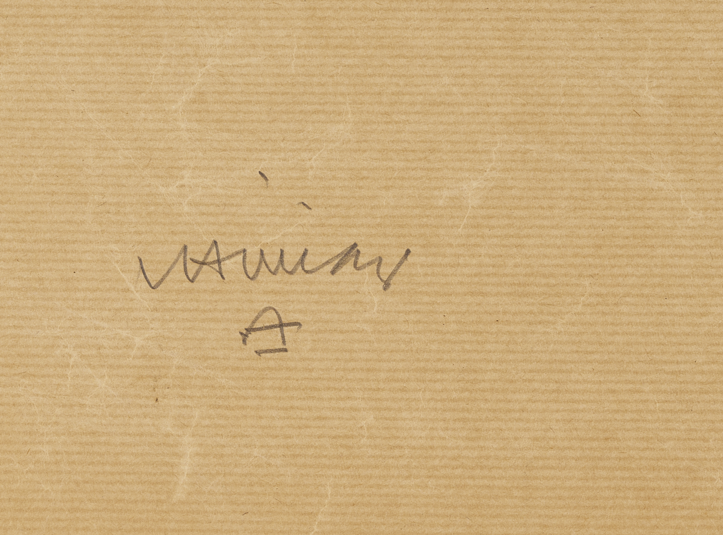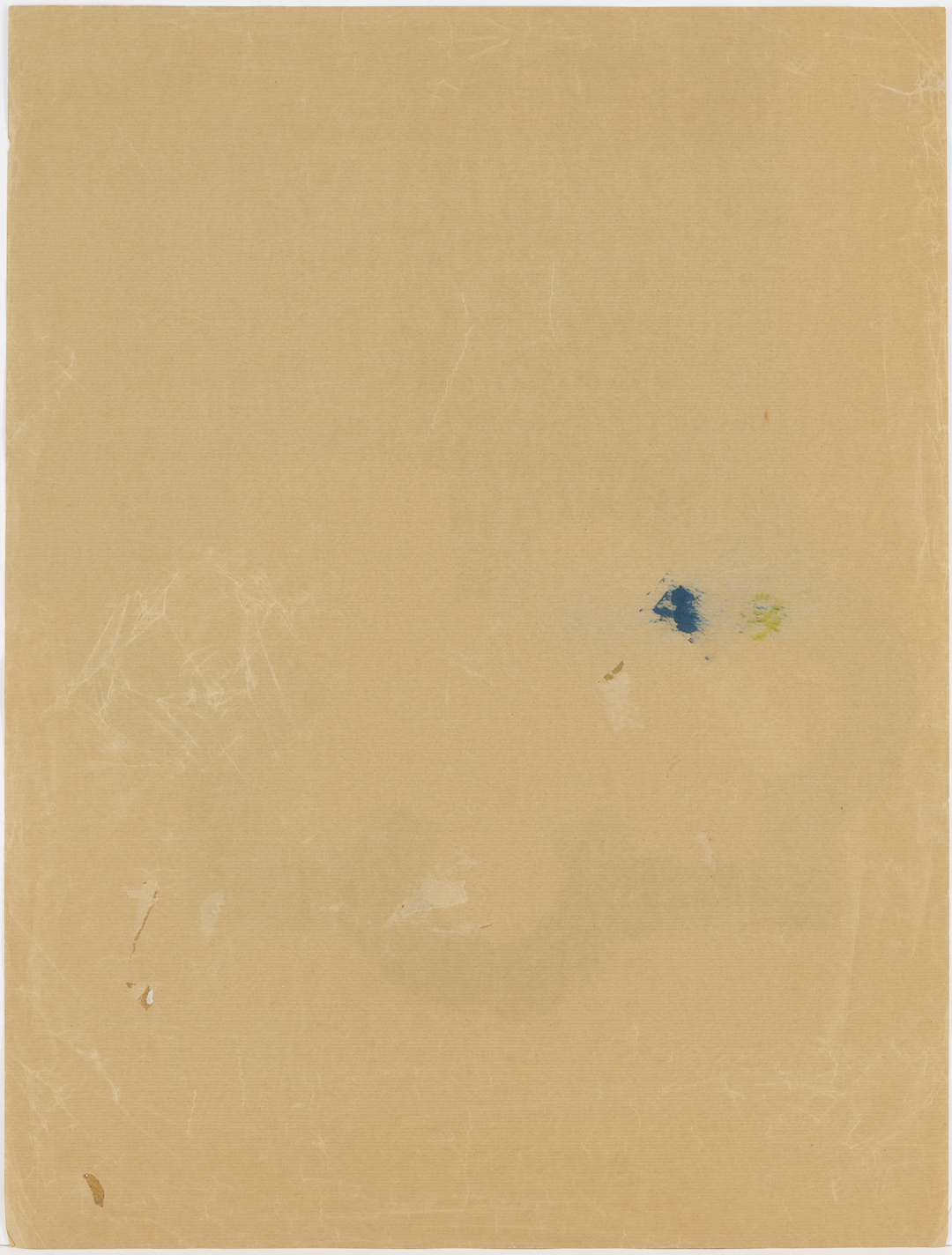 CONDITION: With 1 3/4-inch horizontal tear repaired with tape (applied en verso), upper left edge, outside of printed image. Scattered, minor scuffing plus wrinkling or creasing to sheet, primarily along edges and especially to lower right corner, lower edge, and center right. Several inclusion specks, lower center. Thinning to 2-inch x 3/4-inch area en verso, lower center, along with adhesive residue and possibly inherent blue and yellow pigment staining.