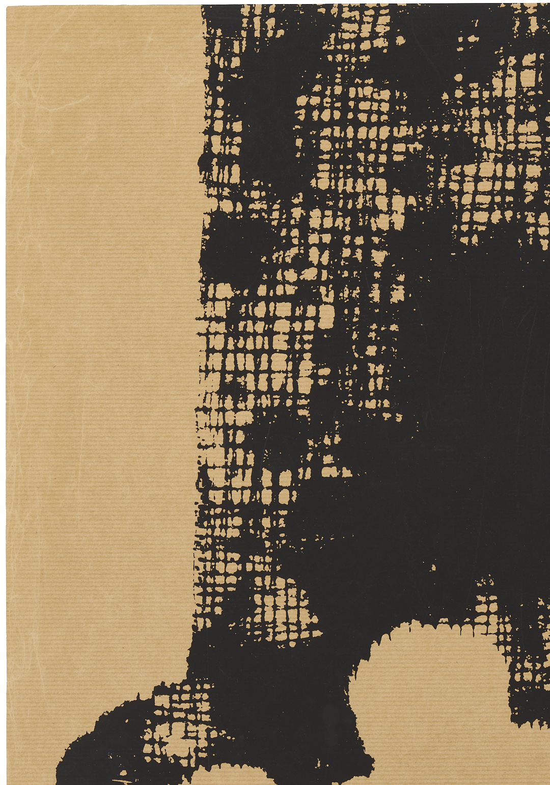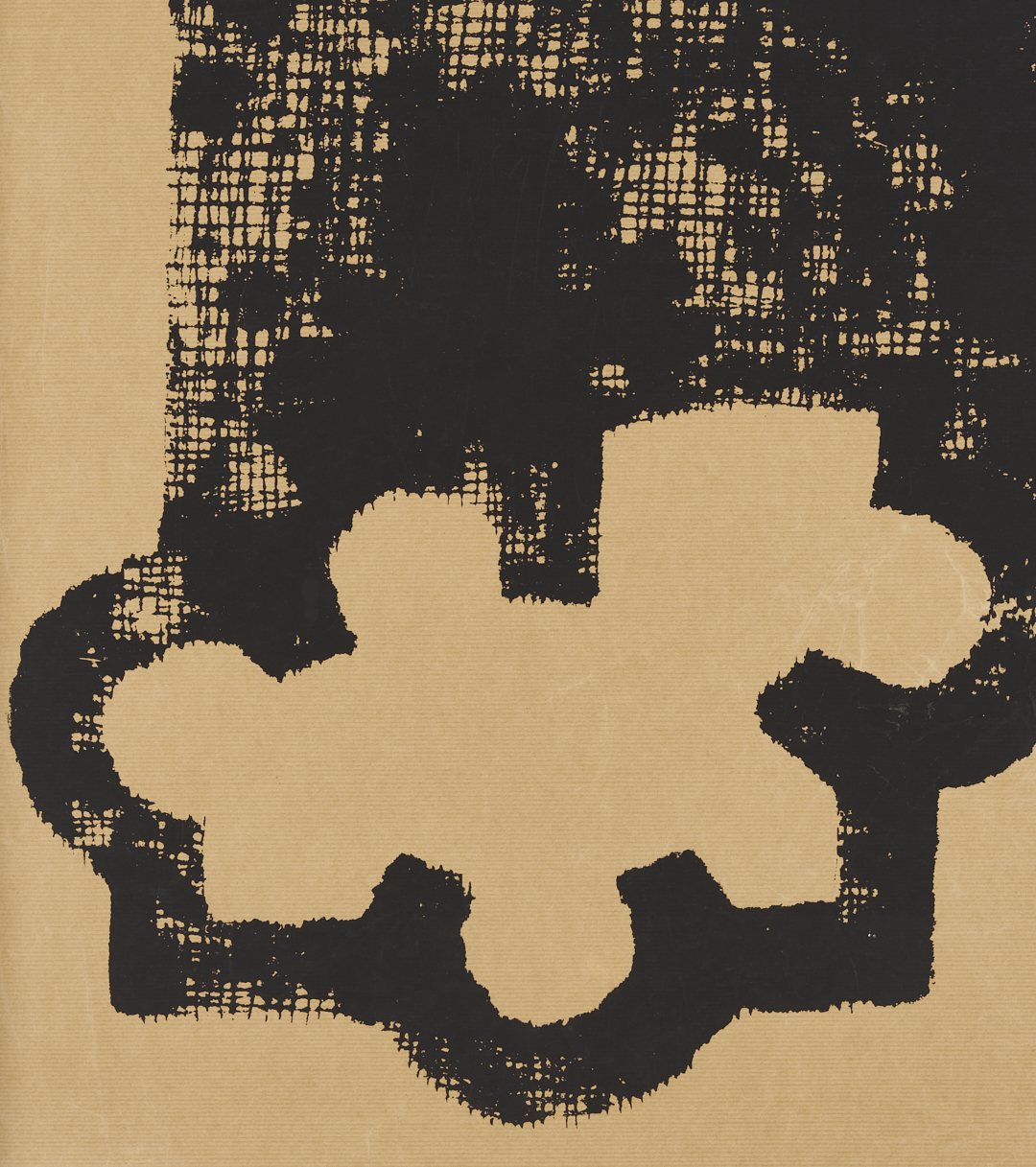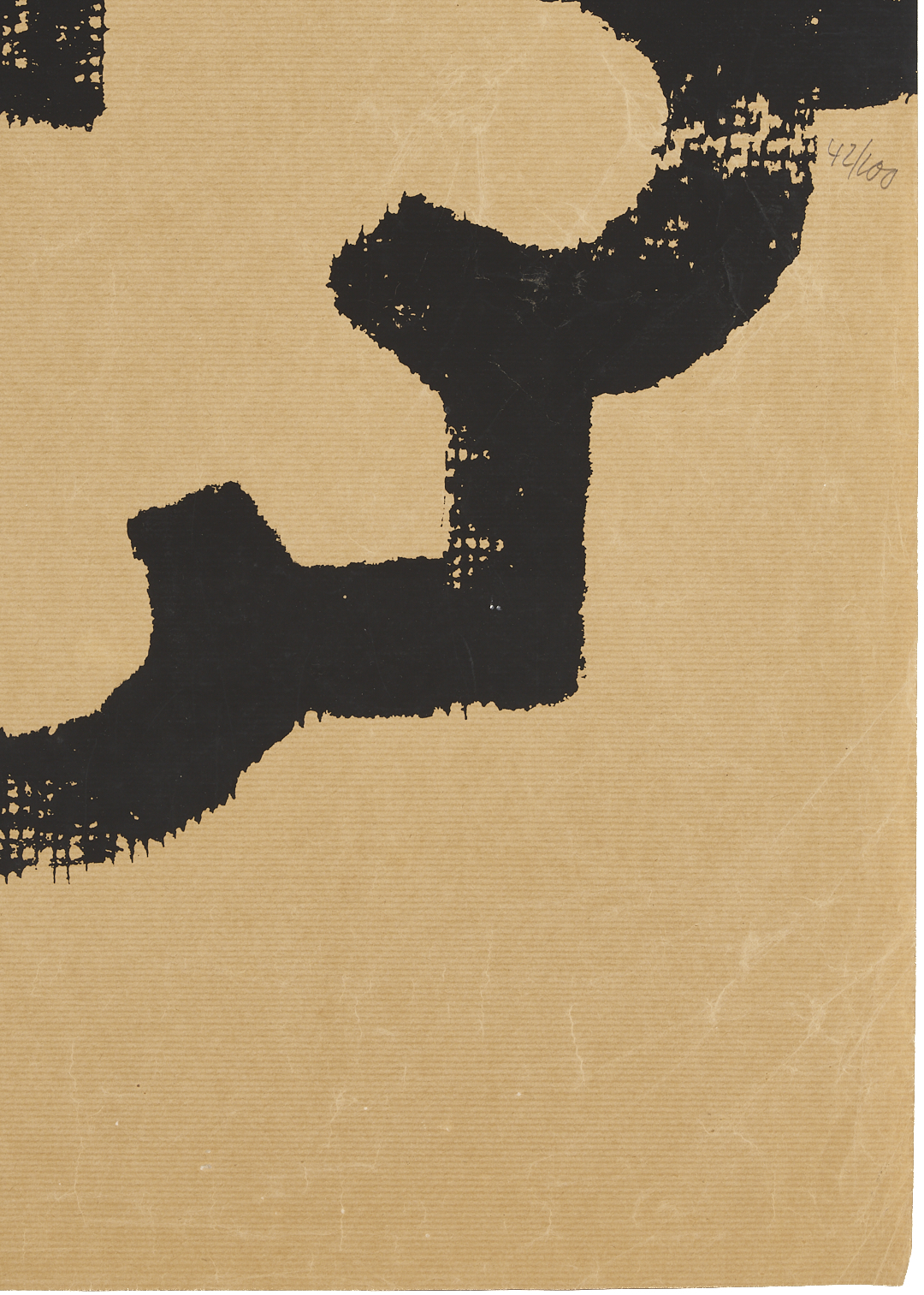 Eduardo Chillida (Spain, 1924-2002) abstract screen print on Kraft paper, “Casa de Goya,” 1983. Pencil signed lower left and numbered 42/100, center right. Ref.: Van der Koelen 83021. Unframed. Housed in a plastic sleeve. Sheet: 31 in. H x 23 1/4 in. W. Sleeve: 41 in. H x 30 1/4 in. W.