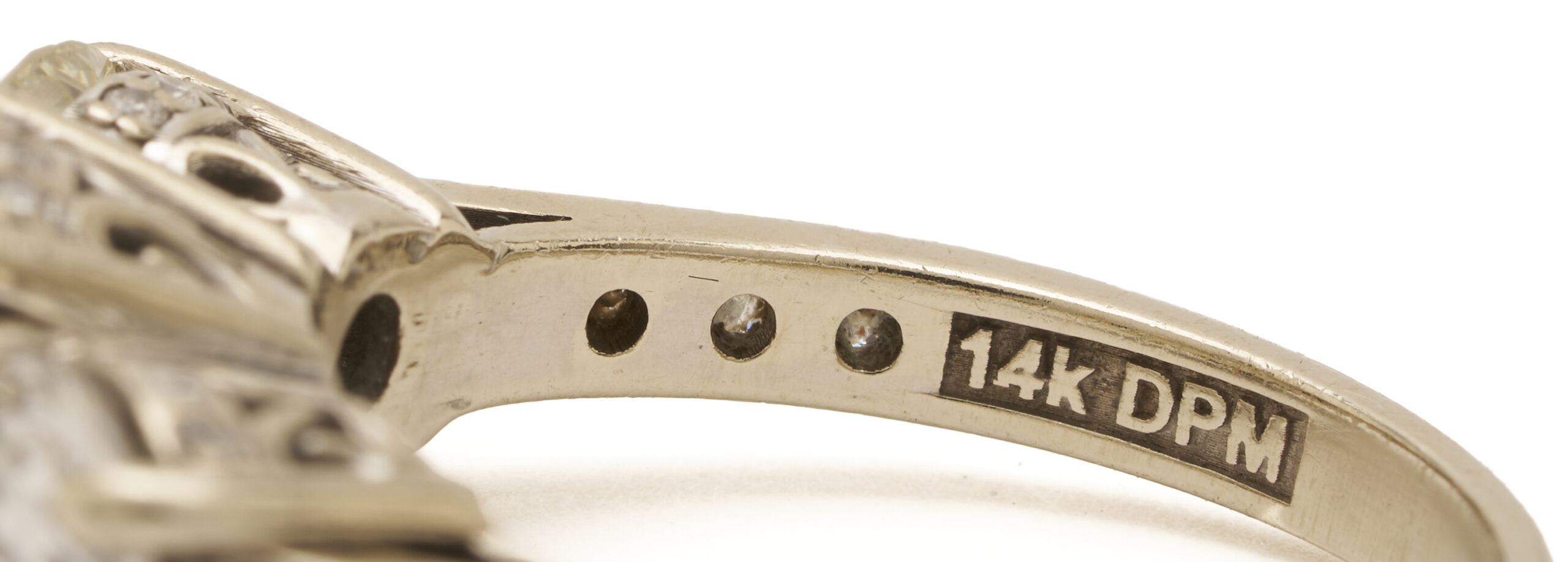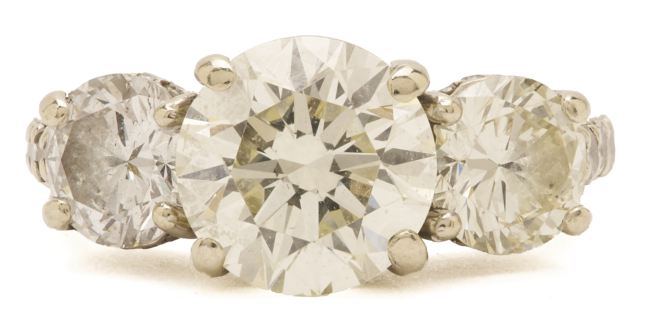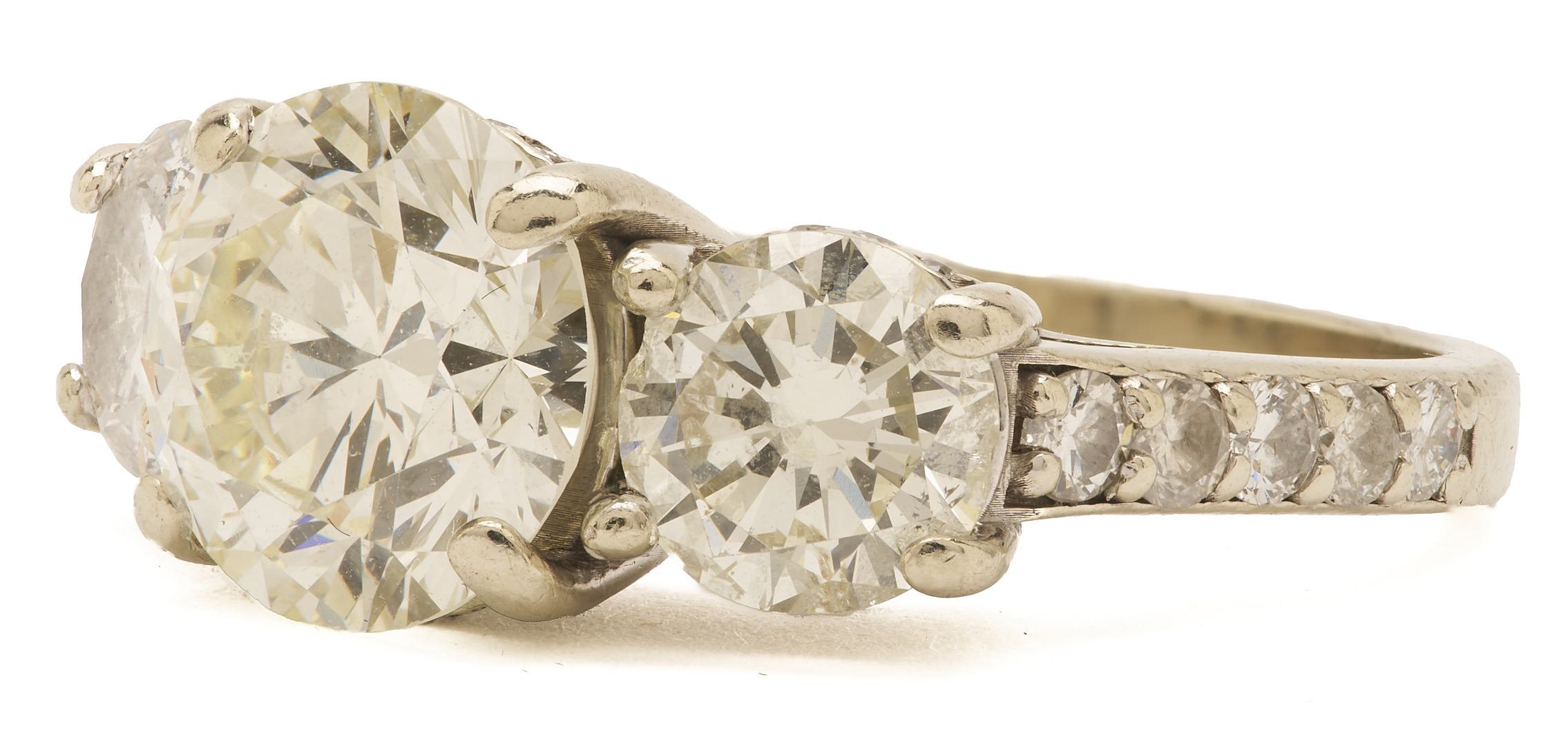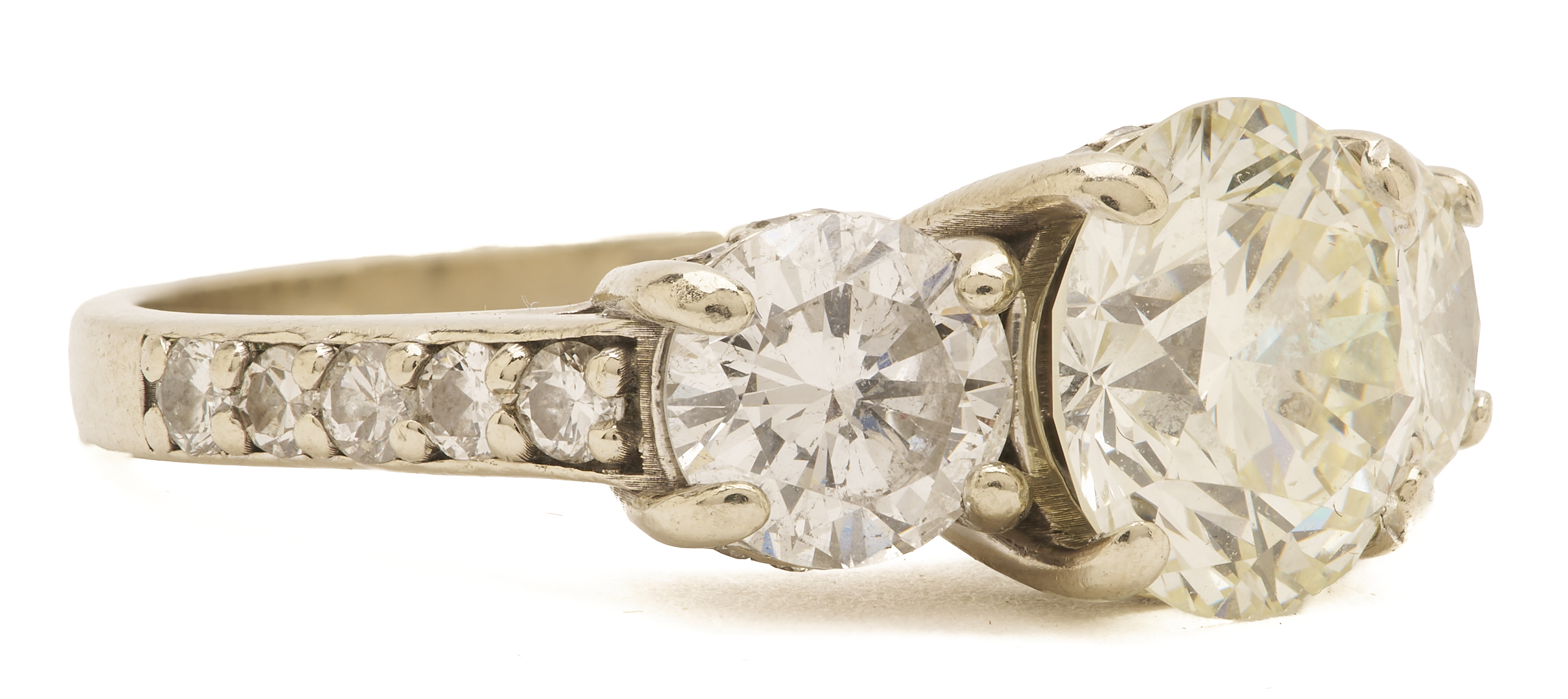 Ladies’ 14K white gold ring featuring one (1) central round brilliant diamond weighing 2.96 carats, Clarity-VS1, Color-M, measuring 9.24 – 9.30 x 5.69 mm, GIA Report# 2235795635. Flanked by two (2) round brilliant diamonds weighing approximately 1.00 carat each, Clarity-SI2, Color-I, accented by another thirty-four (34) melee diamonds, approximately 0.62 carats together. The ring is marked “14K DPM,” and XRF tests 14K gold. The ring is size 7 1/4 and has a gross weight of 6.18 grams.