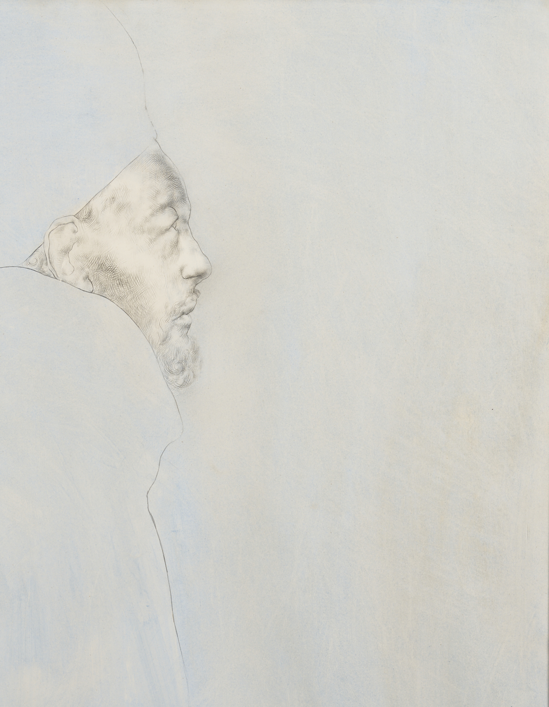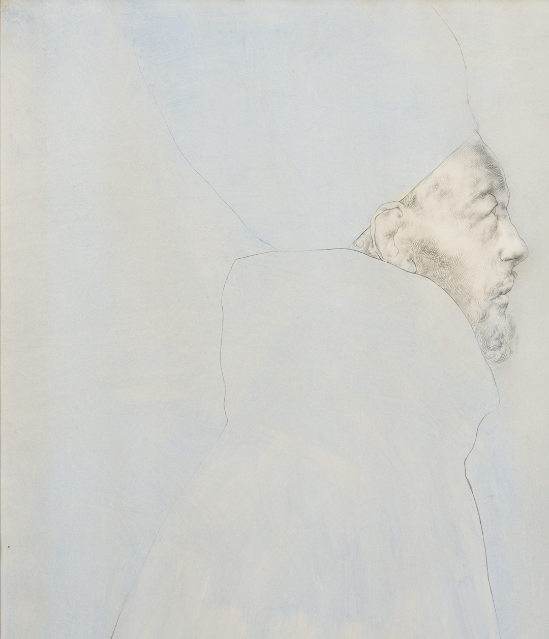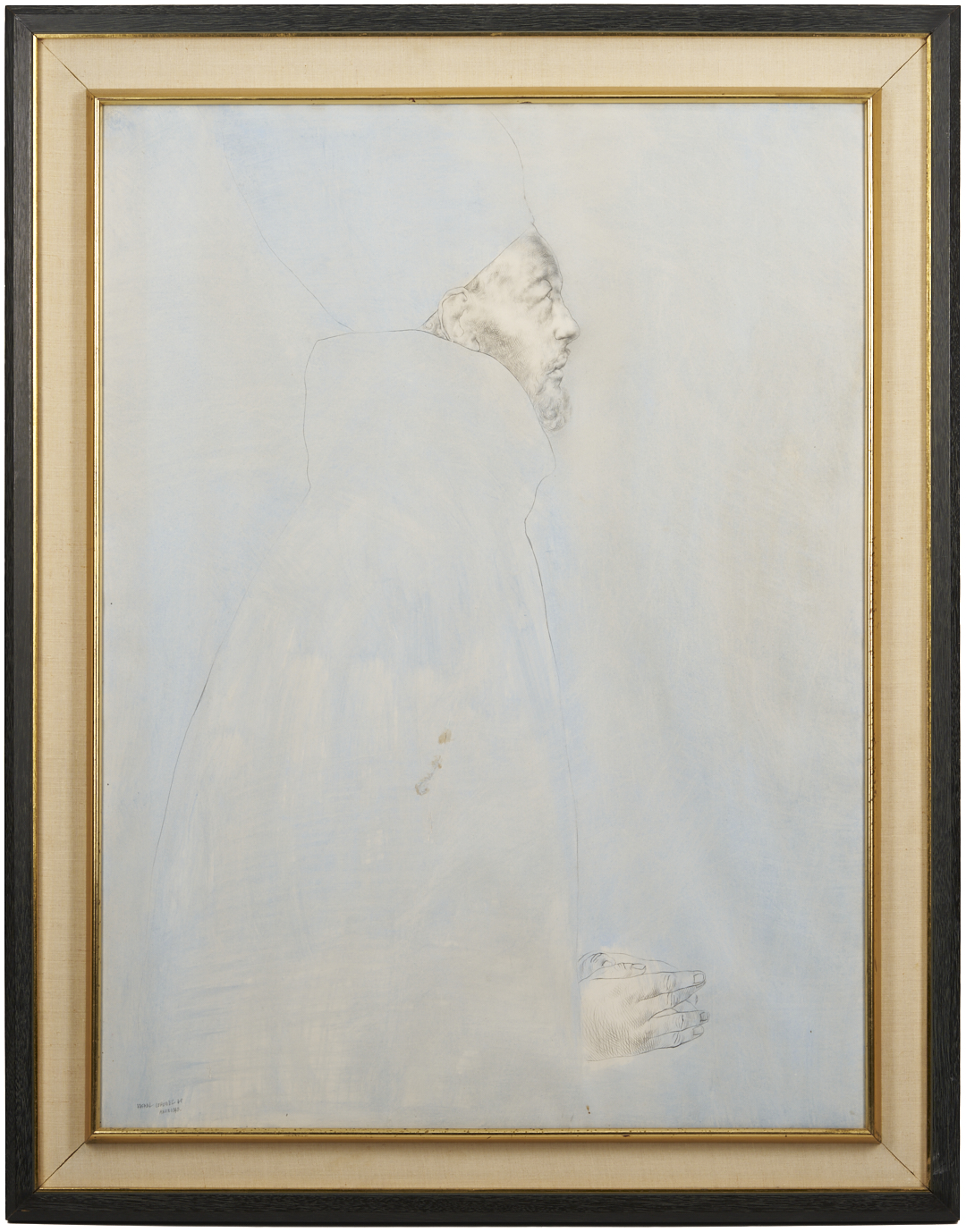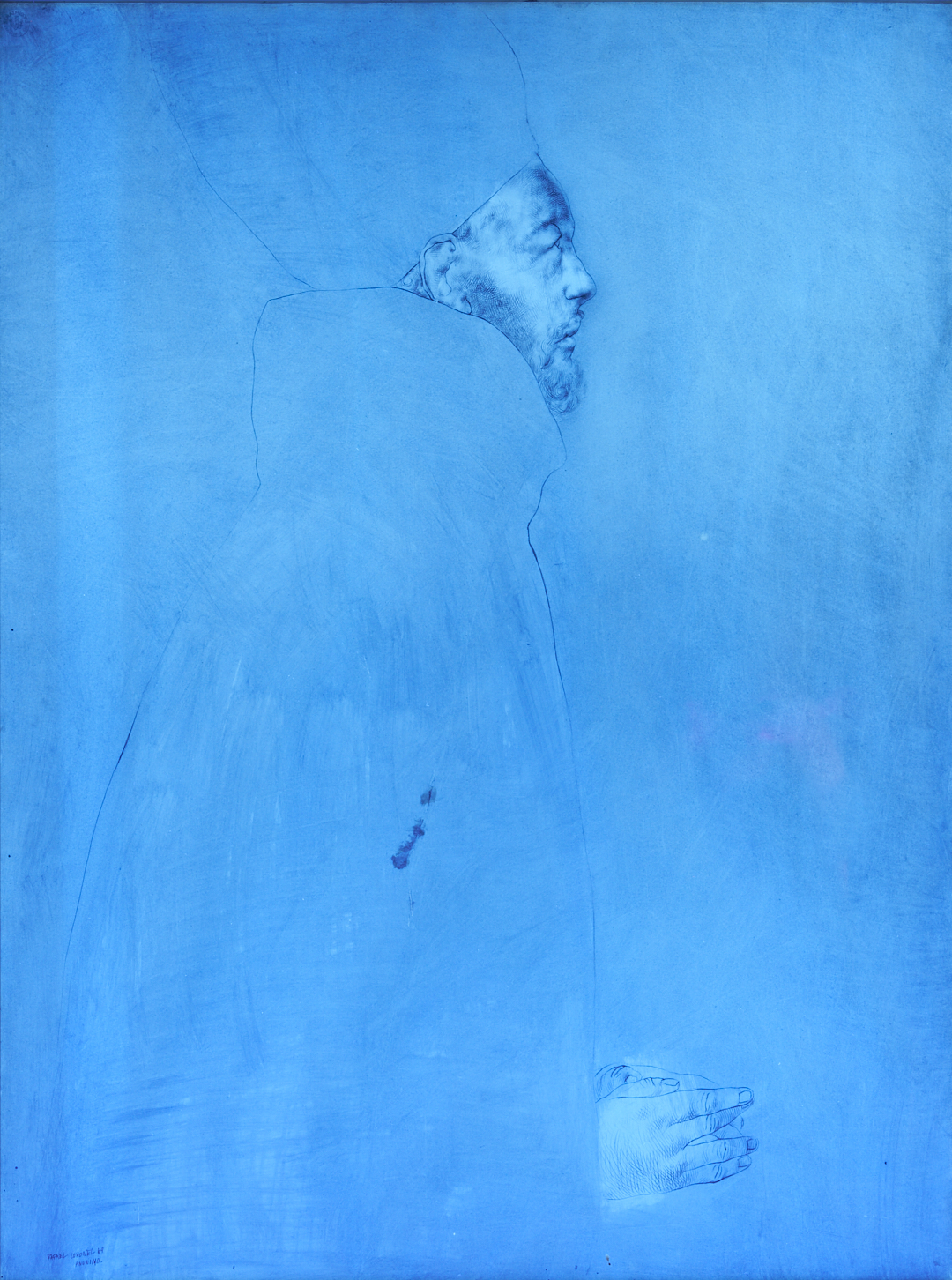 Rafael Coronel (Mexican, 1932-2019), “Anonimo”, aka “Renaissance Person in Blue,” oil crayon and graphite on paper, depicting the profile of a man in Renaissance clothing. Signed and dated “Rafael Coronel ’69” lower left with possible title. Housed under glass in an ebonized frame with gilt molded edges and a beige linen mat. Sight: 40 in. H x 29 1/2 in. W. Frame: 47 in. H x 37 1/2 in. W. This lot is accompanied by the original 1971 sales receipt from the Bernard Lewin Galleries, Beverly HIlls, California, and an exhibit catalog picturing this work, along with some additional correspondence between the gallery, the consignor and his parents (the original purchasers of the work) including a statement of authenticity from Bernard Lewin. Biography: Rafael Coronel was raised in an artistic family. His grandfather was a church family and his brother, Pedro, was a fellow painter. Rafael Coronel studied at the National School of Architecture, the High American School Academy and La Esmeralda. He worked for twenty years in the workshop of Diego Rivera, who became his father in law when he married Ruth Rivera. He is known for his paintings of “melancholic essences” and said his intention was “to show the particularity of the human being without as much covering as the muralists did, capturing characters whose essence is frozen in time.” Source: Rafael Coronel, RETROFUTURE (Instituto Nacional de Bellas Artes, 2010).