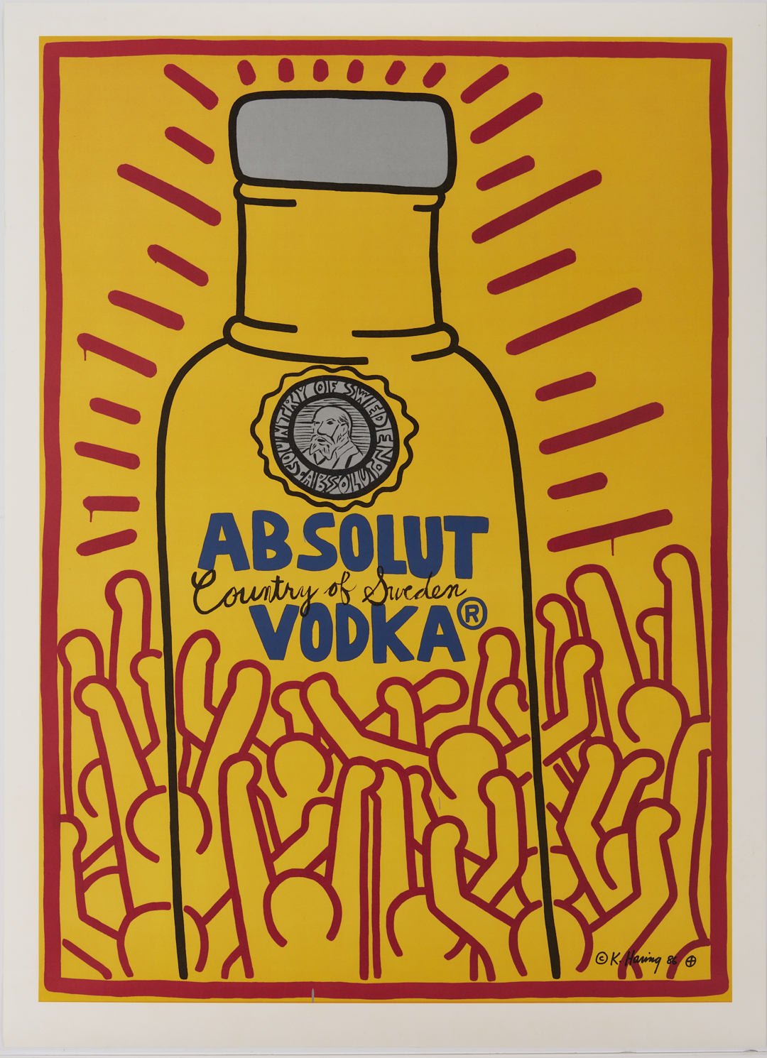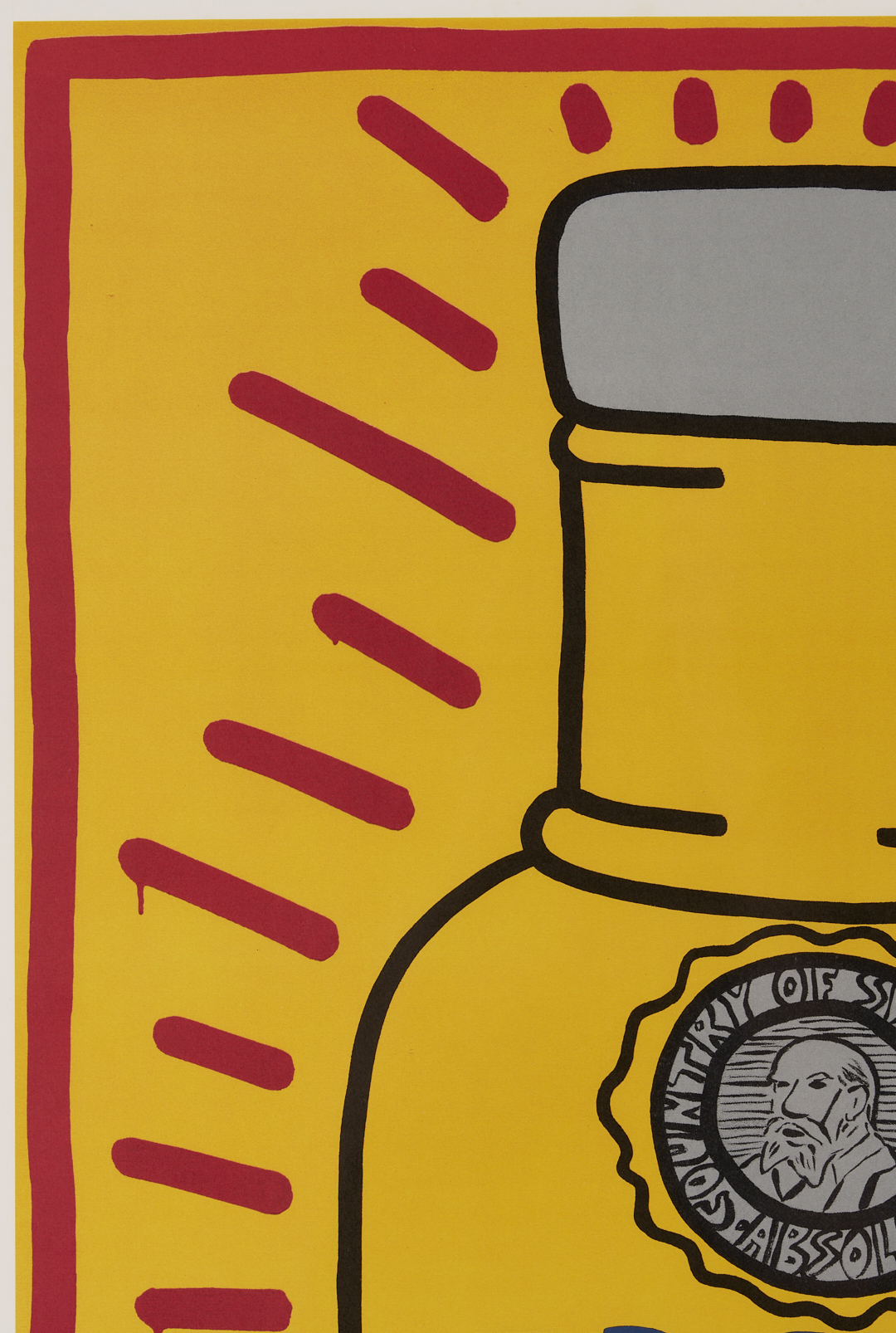 Keith Haring (American, 1958-1990) offset lithograph advertisement poster after the artist’s 1986 painting, “Absolut Haring.” Red lines radiate from a liquor bottle that stands before a yellow field while a crowd of Haring’s signature figures dance in the image’s lower half. With printed signature and date, lower right. Unframed. Sheet: 45 1/8 in. H x 32 15/16 in. W. Note: “In 1985 [Andy] Warhol became the first artist commissioned to create a portrait of the Absolut Vodka bottle in what would become one of the most successful advertising campaigns of the twentieth century. Following the triumph of the ‘Absolut Warhol’ ads, the president of the company that owned Absolut, Michel Roux, encouraged Warhol to suggest other artists which could be used in the campaign. Over the years more than three hundred and fifty artists have been commissioned, including Keith Haring and Ed Ruscha –both suggested by Warhol.” (Source: National Galleries of Scotland) The posters were primarily made available to liquor stores and distributors as marketing materials, and relatively few have survived. In 2025, to celebrate the upcoming 40-year anniversary of this collaboration, Absolut Vodka released an artist-edition bottle inspired by this advertisement.