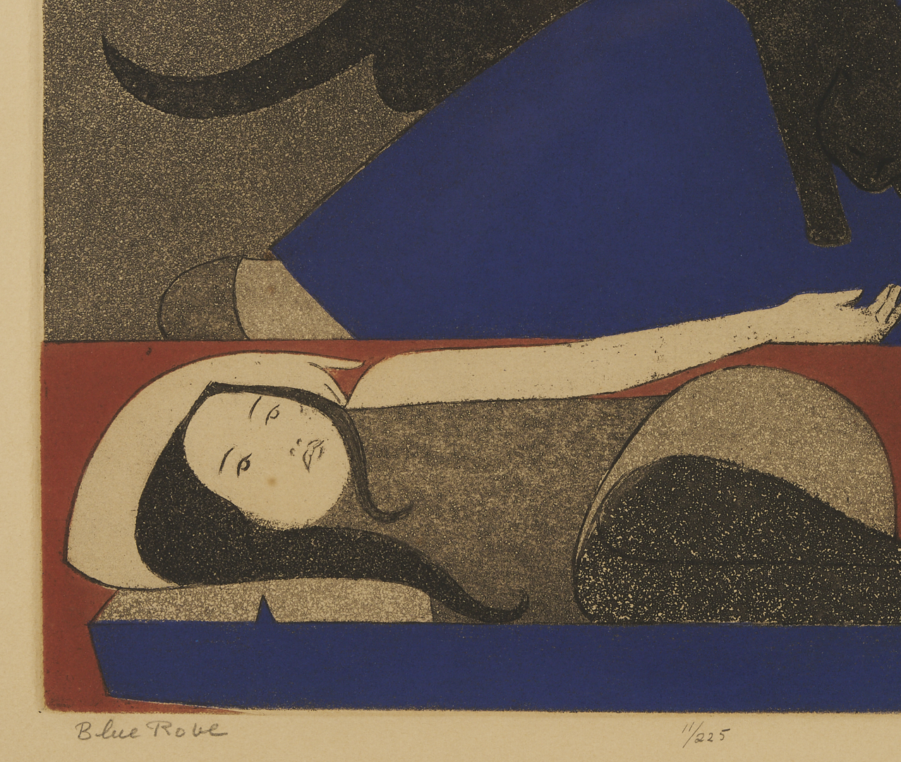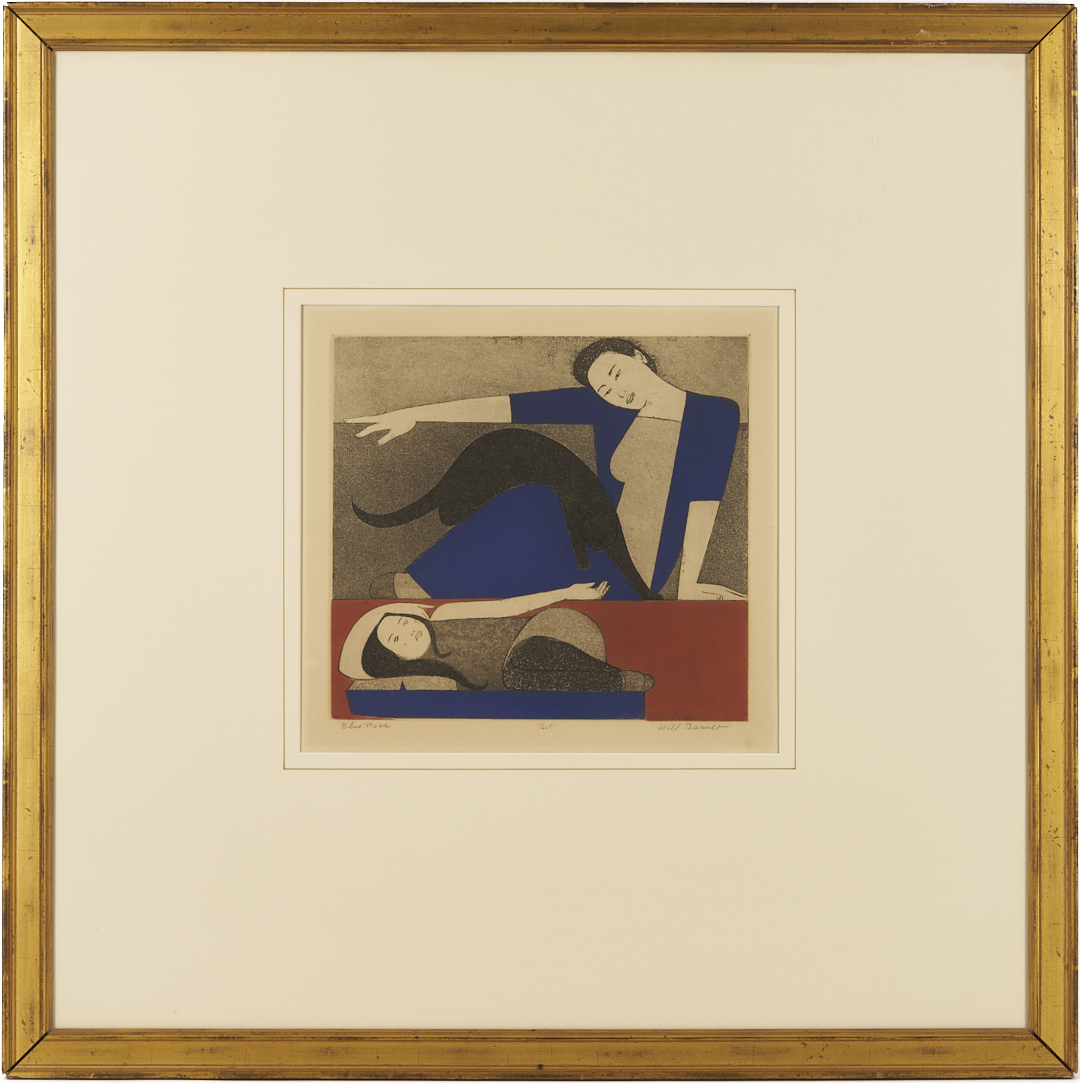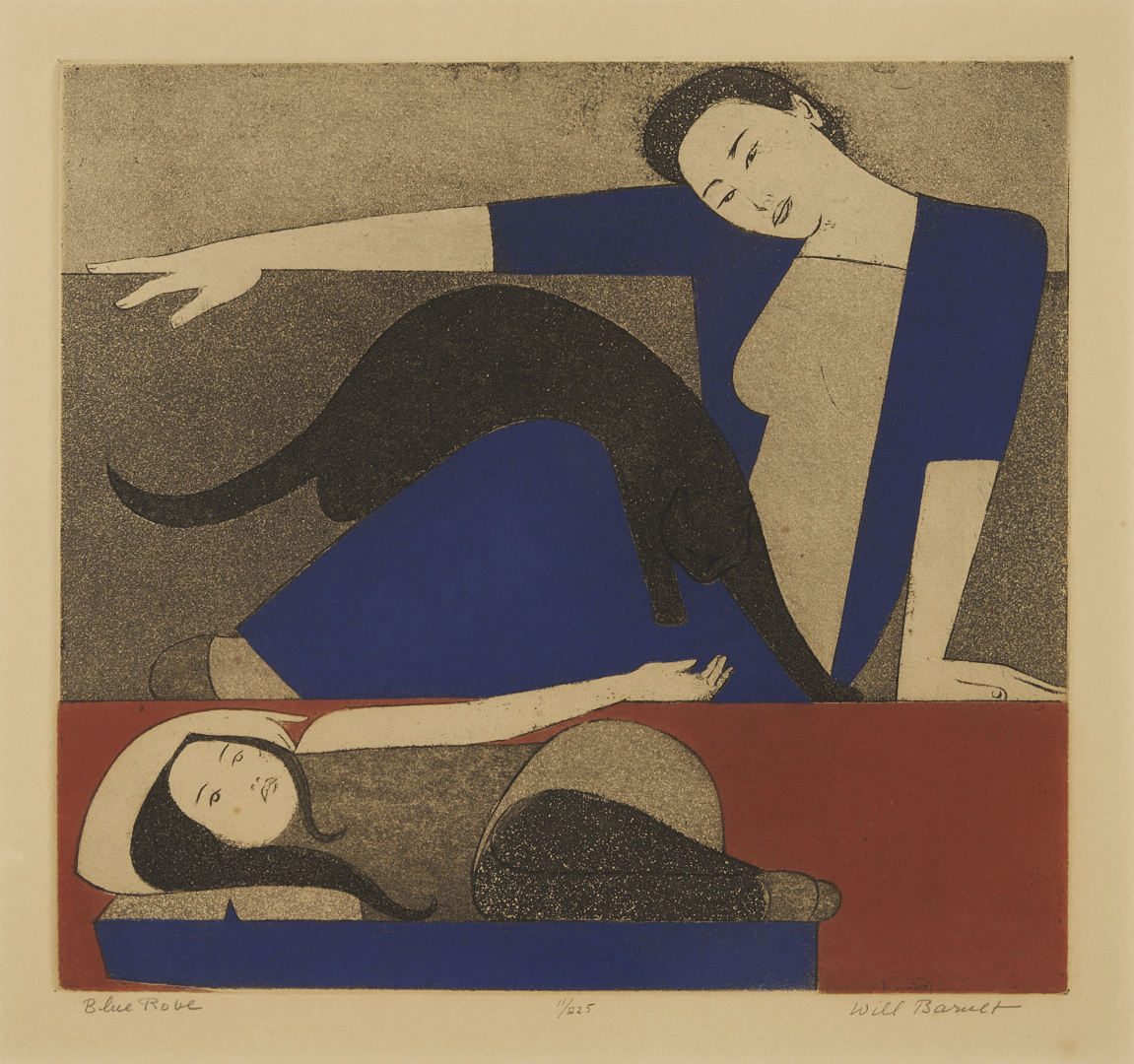 Will Barnet (American, 1911-2012) color aquatint and etching on wove paper, “Blue Robe,” 1971. A woman and a girl recline as they watch a black cat step over the woman’s lap. Signed, titled, and numbered 11/225 in pencil, lower margin. Housed under acrylic in a giltwood frame with cream mat and French line. Sight: 14 1/8 in. H x 15 1/8 in. W. Framed: Ref.: Cole 144.