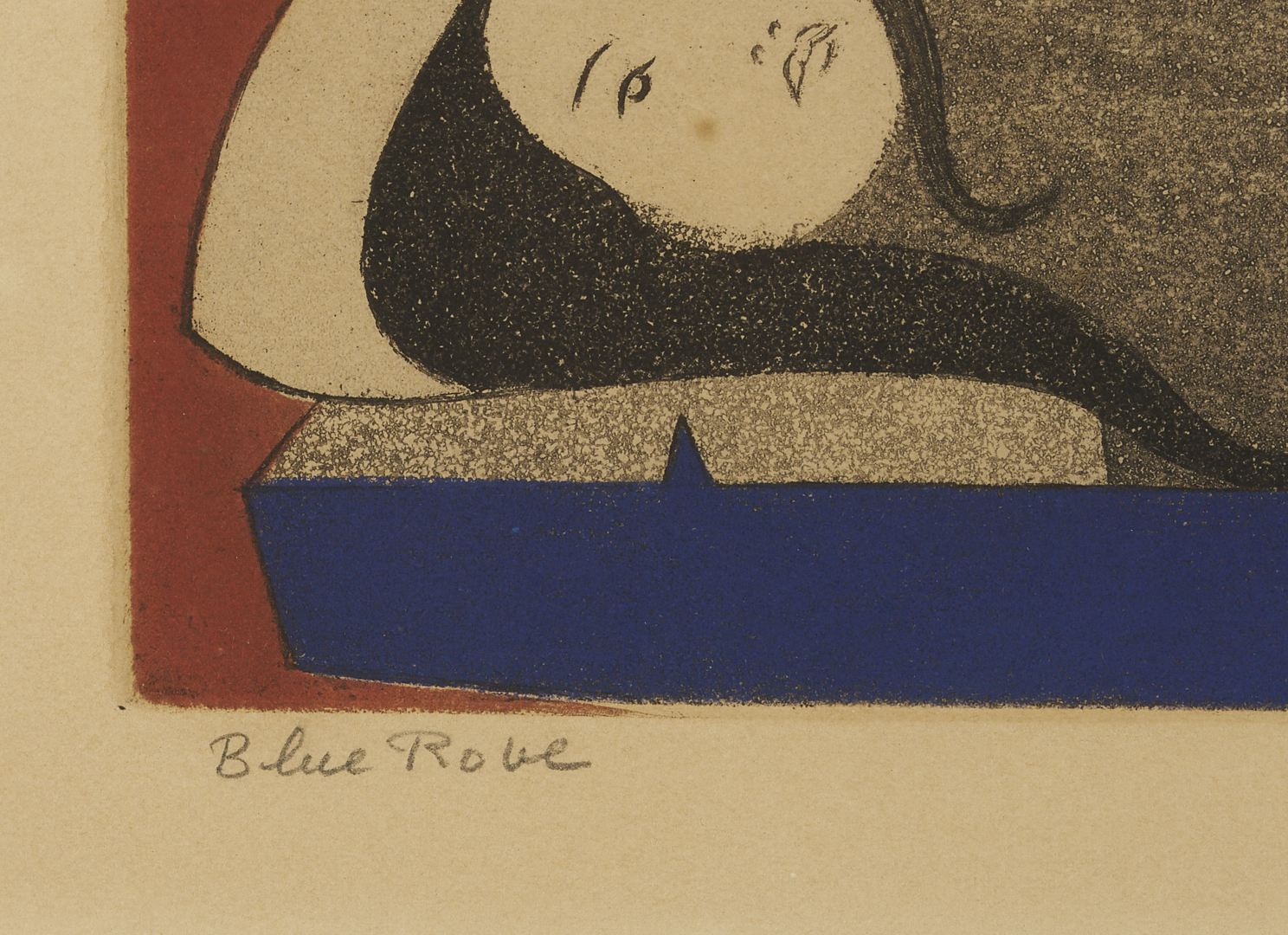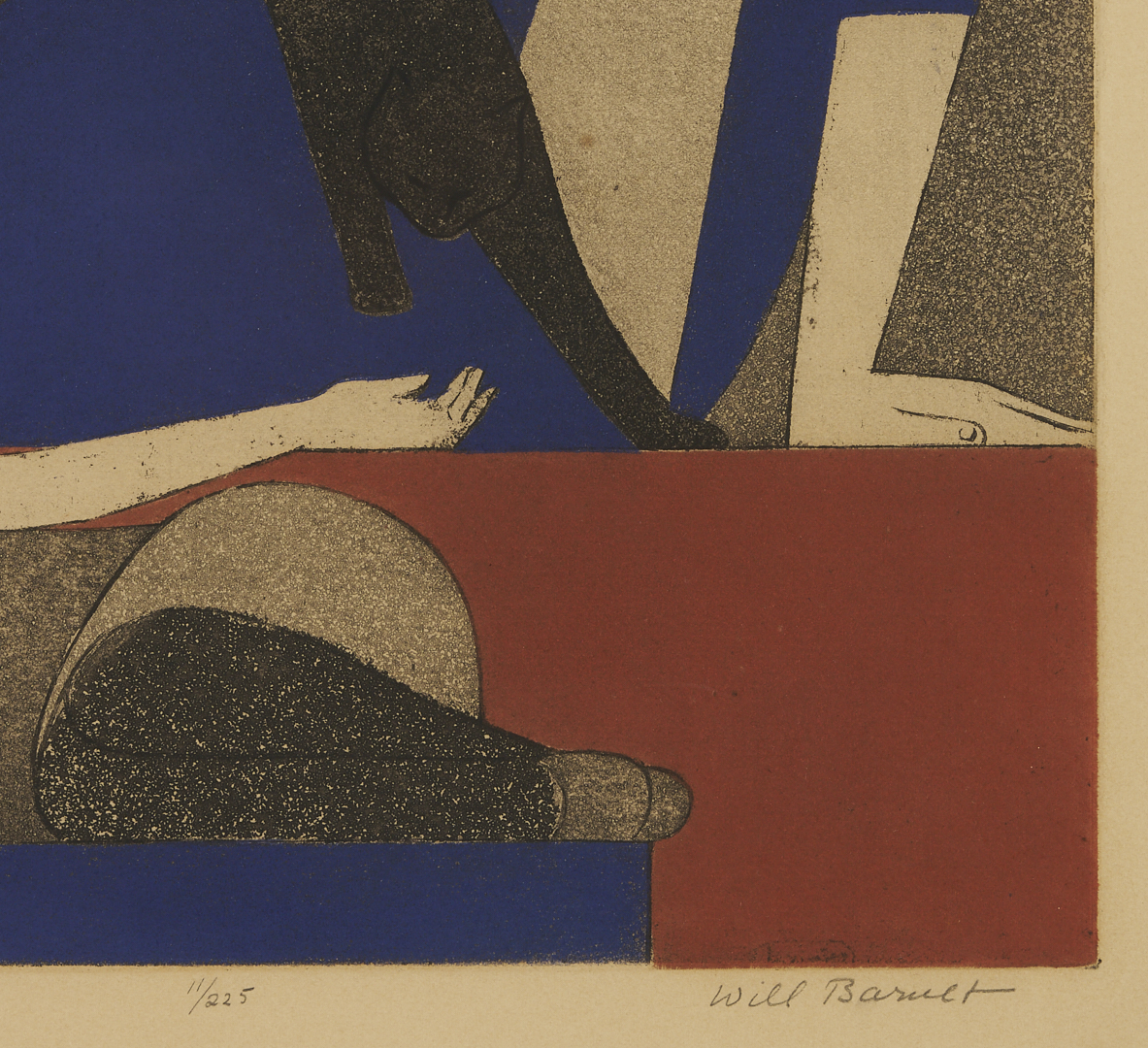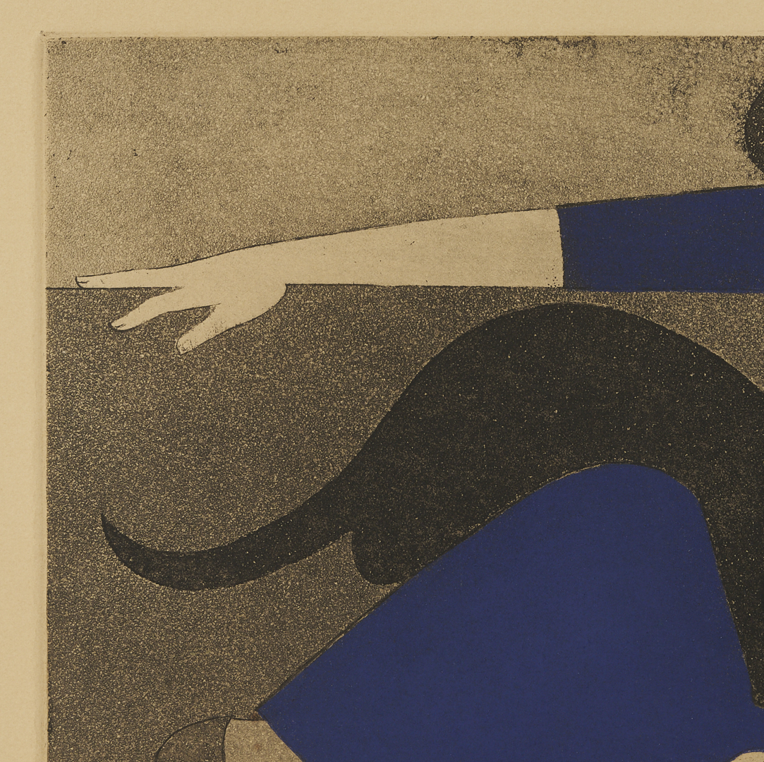 Will Barnet (American, 1911-2012) color aquatint and etching on wove paper, “Blue Robe,” 1971. A woman and a girl recline as they watch a black cat step over the woman’s lap. Signed, titled, and numbered 11/225 in pencil, lower margin. Housed under acrylic in a giltwood frame with cream mat and French line. Sight: 14 1/8 in. H x 15 1/8 in. W. Framed: Ref.: Cole 144.