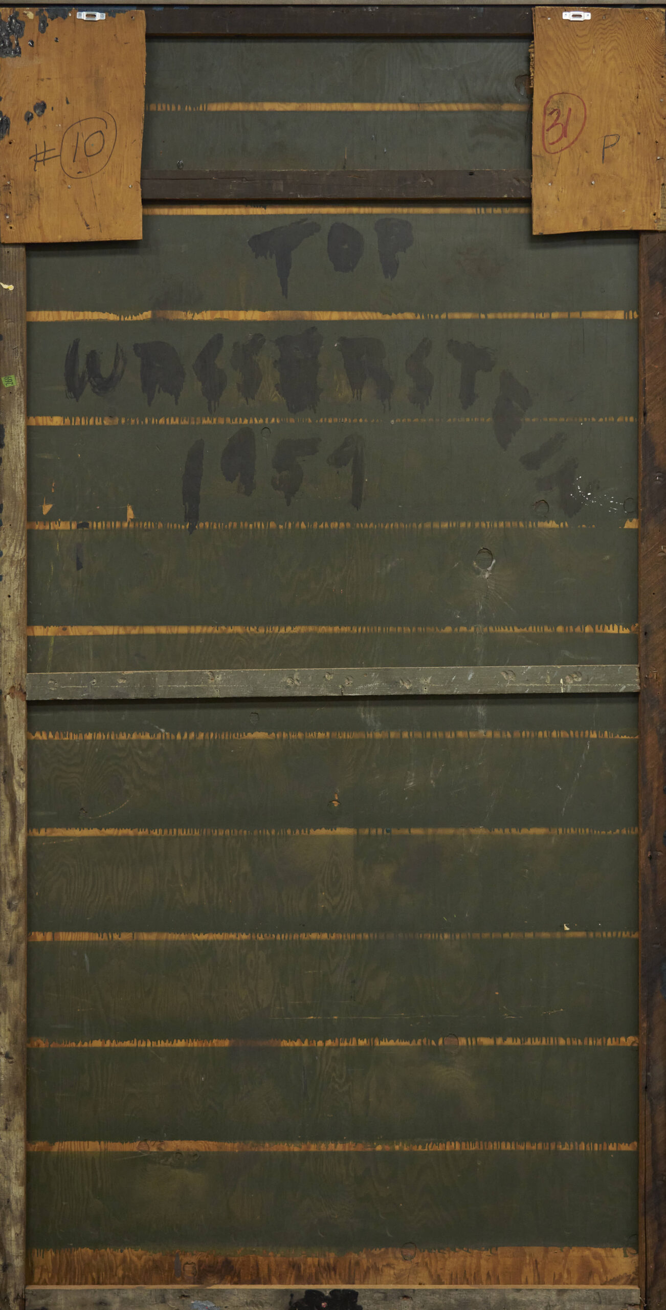 Julius Wasserstein (Rhode Island/California, 1924-1985) oil on found panel Abstract Expressionist painting, “Homeostasis,” 1957. Gestural, predominantly blue and black brushwork fills the upper two-thirds of the composition while brown hues, along with shades of white and black, dominate the lower third. With passages of impasto throughout plus pink and yellow highlights. Signed and dated to verso. With Vanderbilt University Fine Arts Gallery and 1961 and 1963 Staempfli Gallery, New York, tags affixed to backing. Housed in a thin, ebonized wood frame. Panel: 93 in. H x 48 in. W. Framed: 94 in. H x 49 in. W.