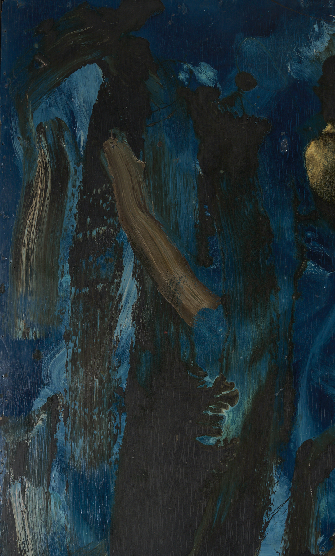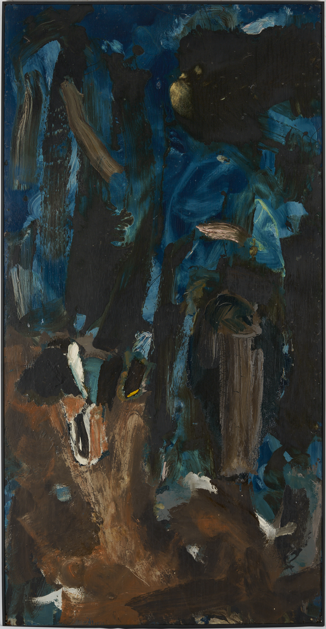 Julius Wasserstein (Rhode Island/California, 1924-1985) oil on found panel Abstract Expressionist painting, “Homeostasis,” 1957. Gestural, predominantly blue and black brushwork fills the upper two-thirds of the composition while brown hues, along with shades of white and black, dominate the lower third. With passages of impasto throughout plus pink and yellow highlights. With Vanderbilt University Fine Arts Gallery and 1961 and 1963 Staempfli Gallery, New York, tags affixed to backing. Housed in a thin, ebonized wood frame. Panel: 93 in. H x 48 in. W. Framed: 94 in. H x 49 in. W.