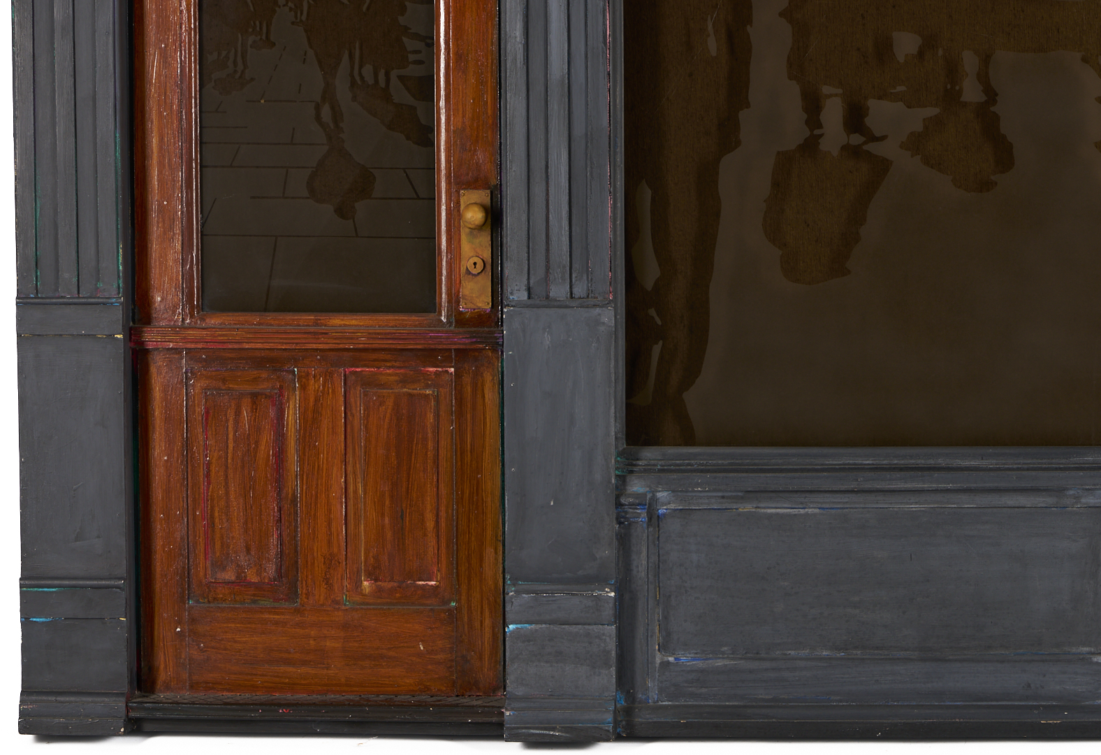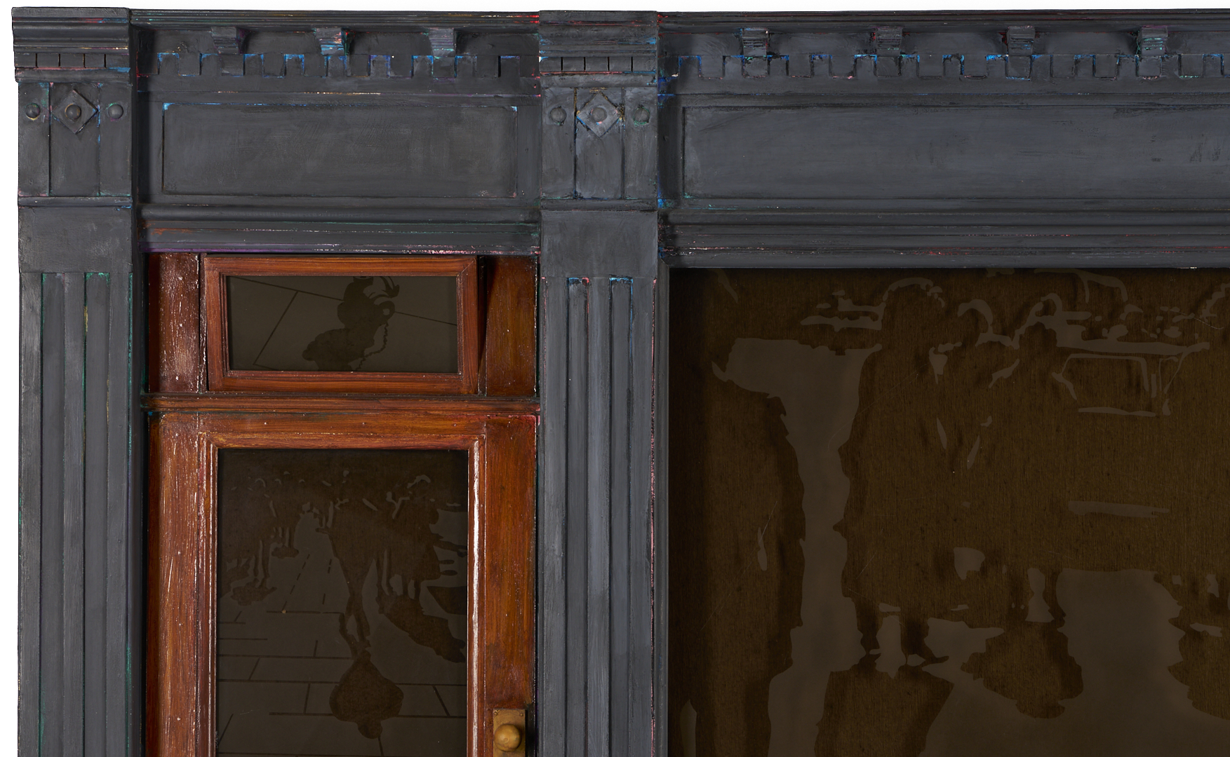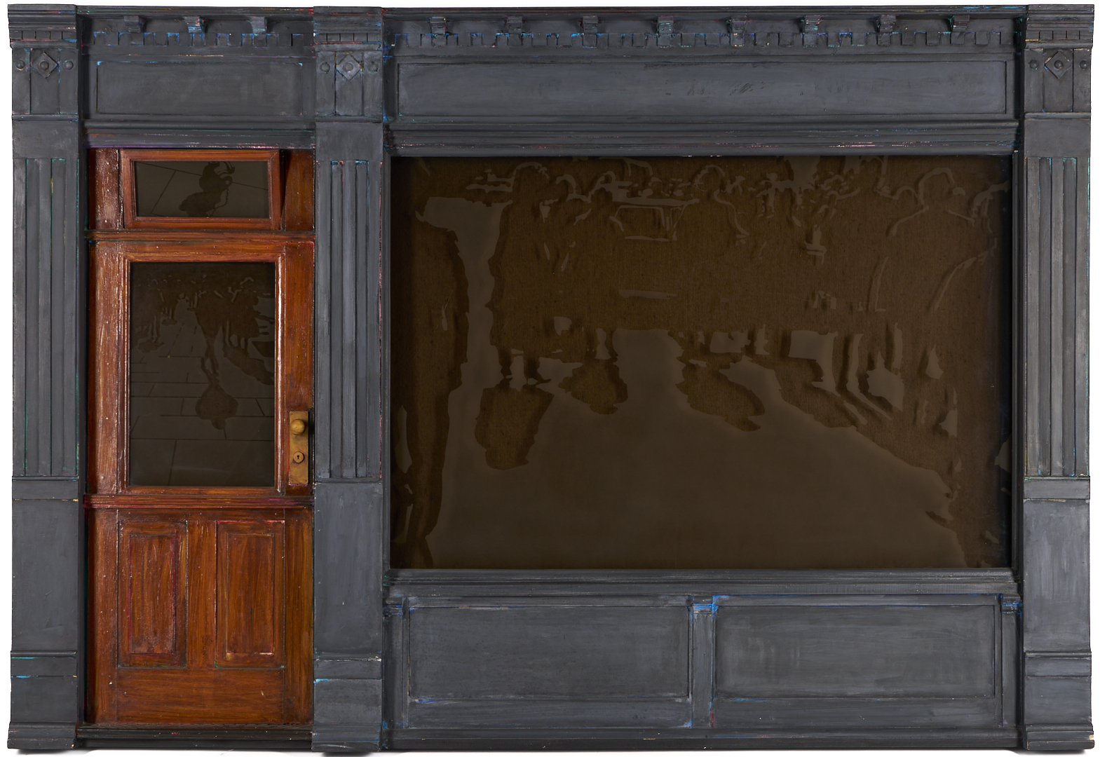 Tom Pfannerstill (Kentucky, b. 1951) and Mario Muller (New York/California, b. 1962) mixed media tromp l’oeil carved and painted wood with laminated, sandblasted glass sculpture, 1990. The sculpture depicts the facade of an urban building with plate glass windows and door with glass window and open transom window. A busy street scene that includes numerous figures before a limousine appears to be reflected in the windows. Lightly painted areas of the gray facade reveal glimpses of brightly colored underpaint throughout. With heavy, dark felt affixed to backs of windows. 56 in. H x 81 in. W x 5 in. D.
