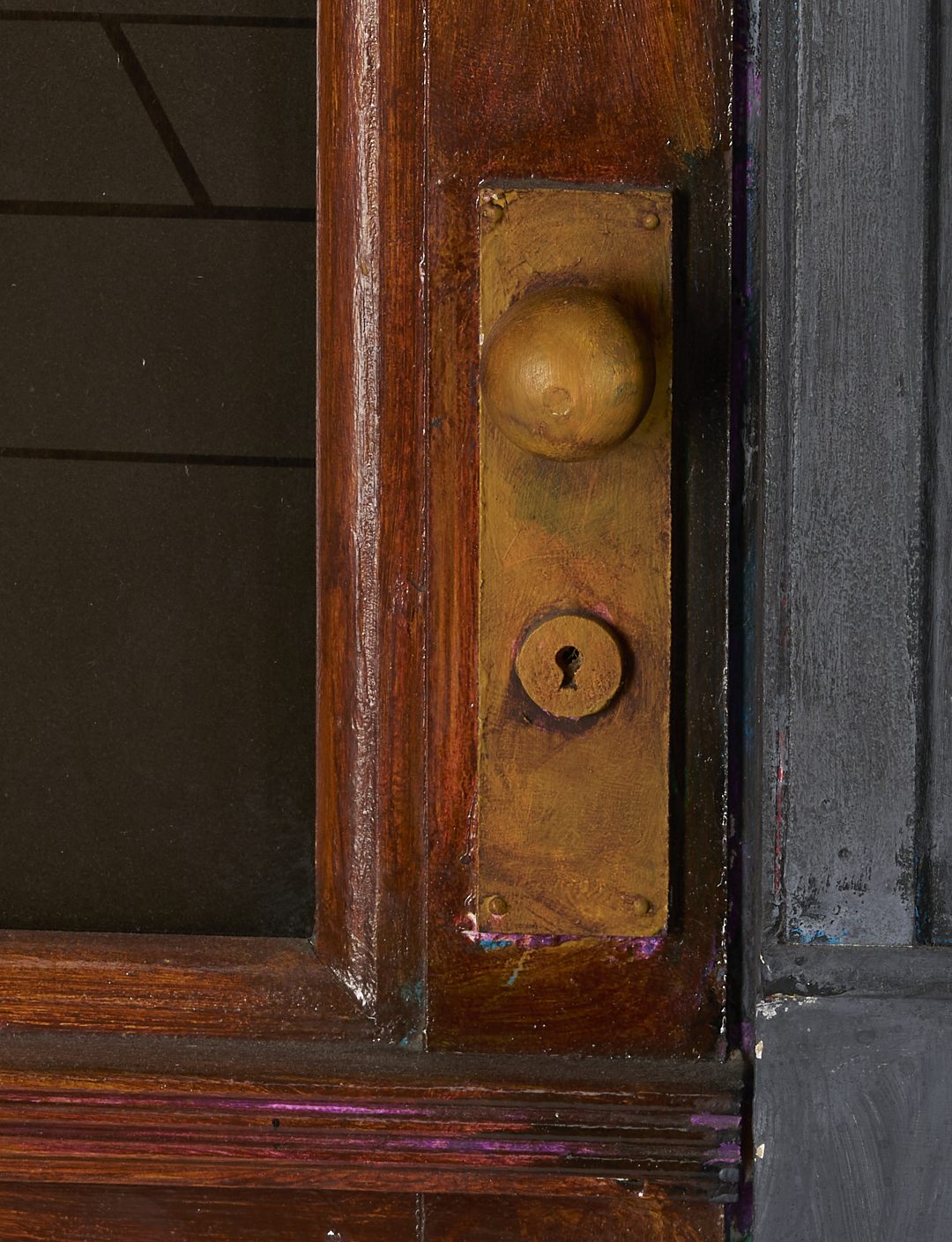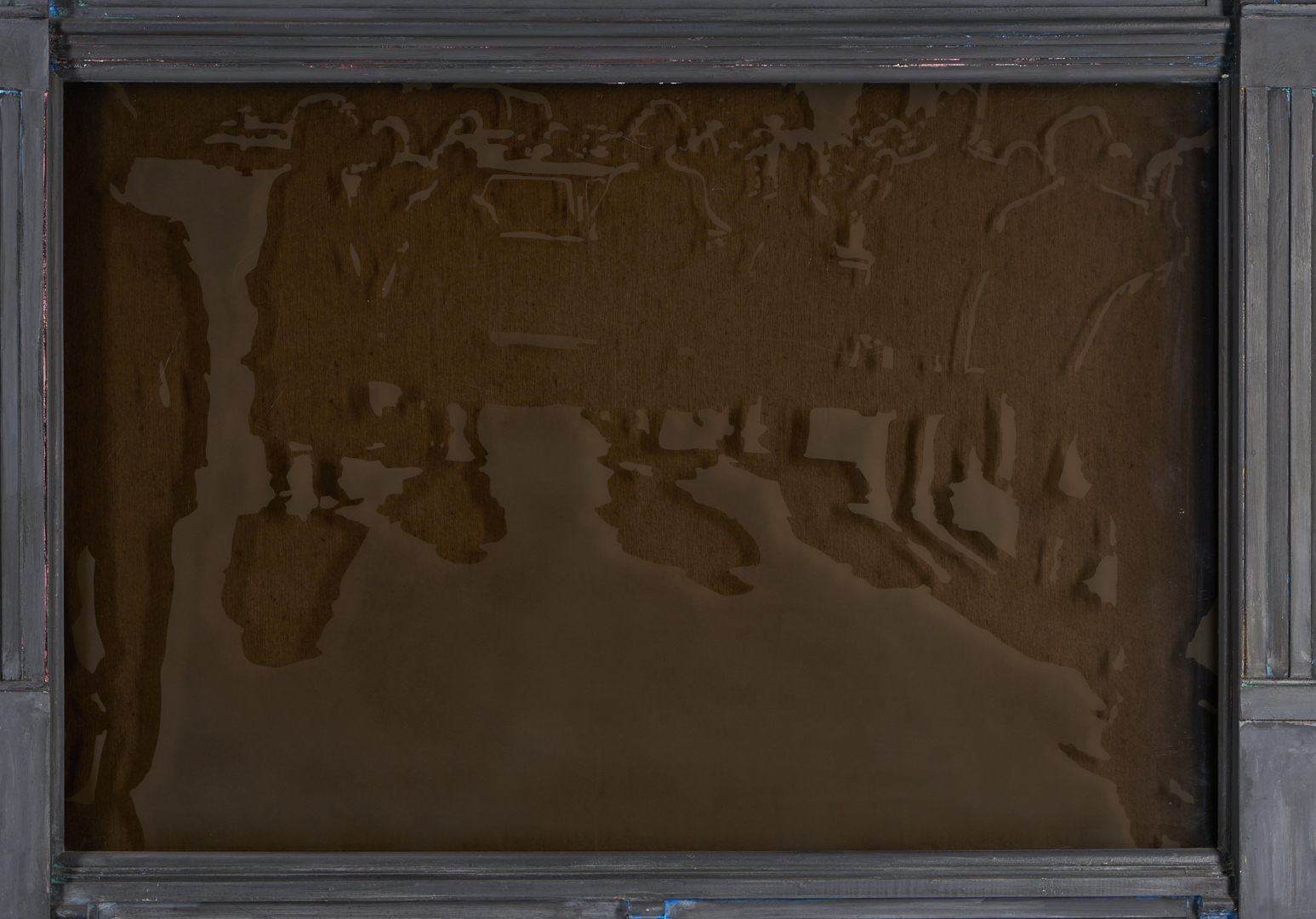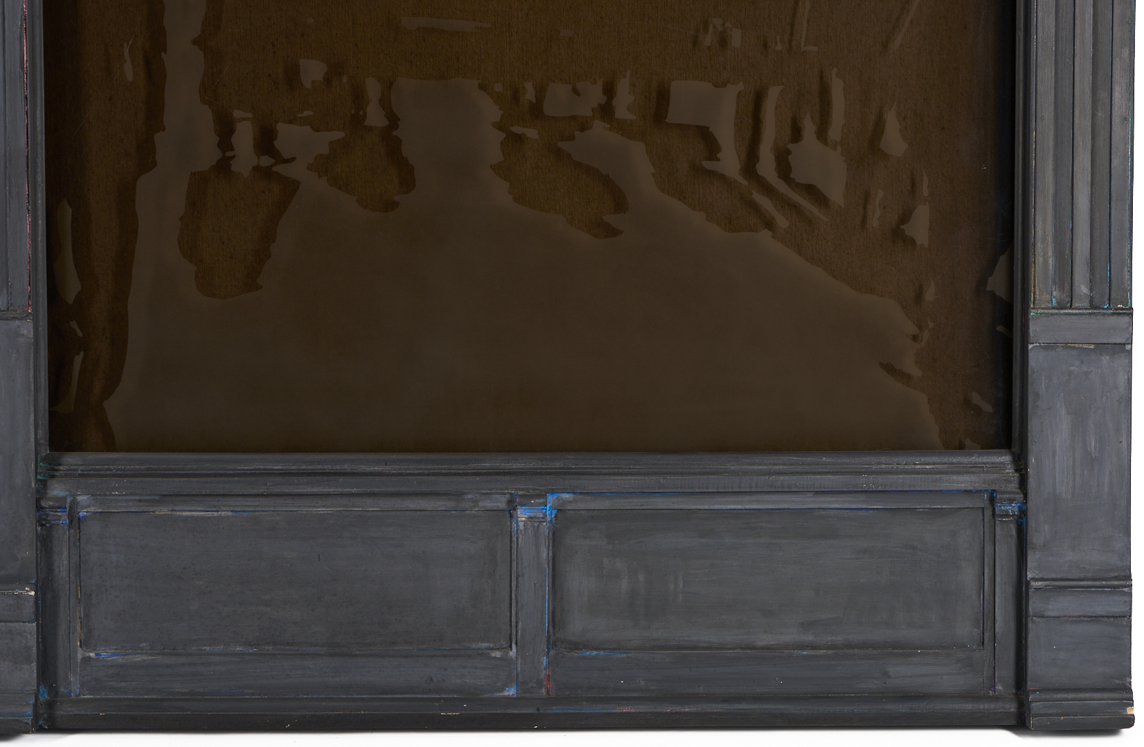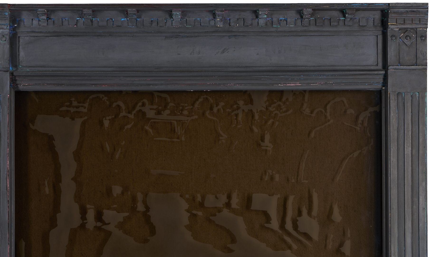 Tom Pfannerstill (Kentucky, b. 1951) and Mario Muller (New York/California, b. 1962) mixed media tromp l’oeil carved and painted wood with laminated, sandblasted glass sculpture, 1990. The sculpture depicts the facade of an urban building with plate glass windows and door with glass window and open transom window. A busy street scene that includes numerous figures before a limousine appears to be reflected in the windows. Lightly painted areas of the gray facade reveal glimpses of brightly colored underpaint throughout. With heavy, dark felt affixed to backs of windows. 56 in. H x 81 in. W x 5 in. D.