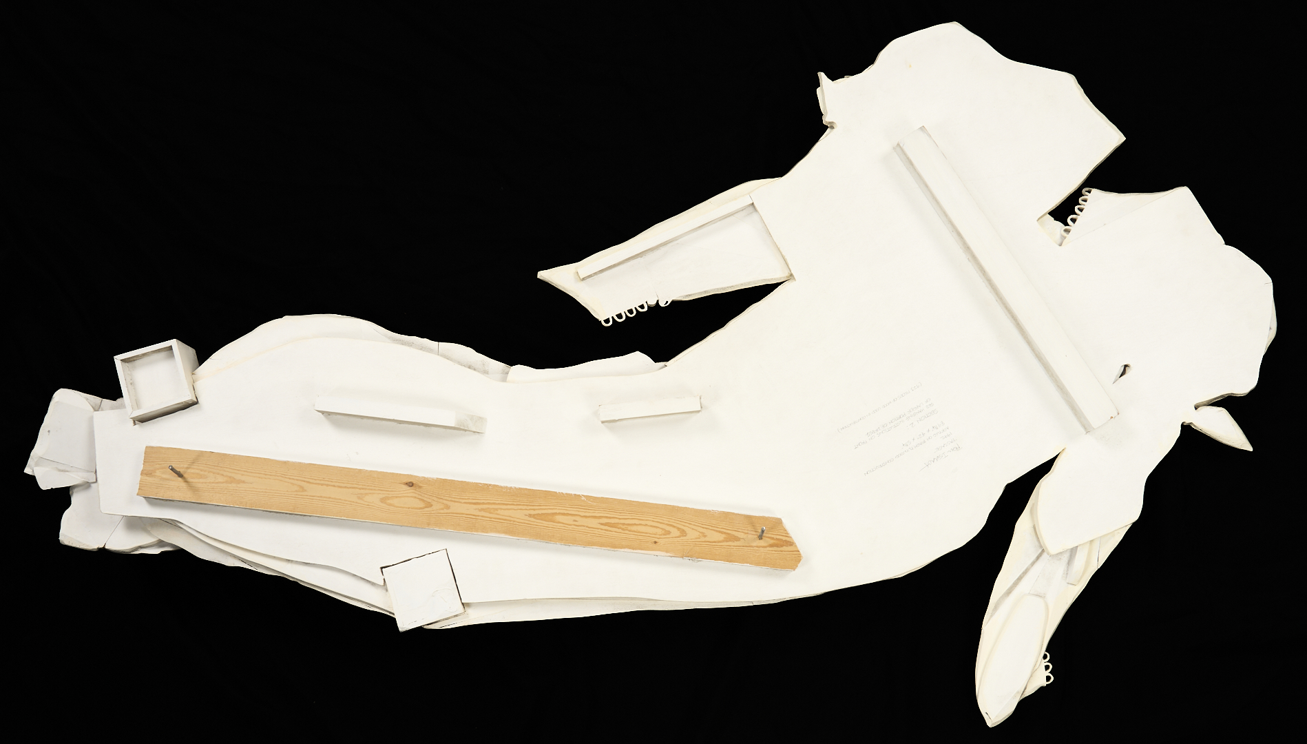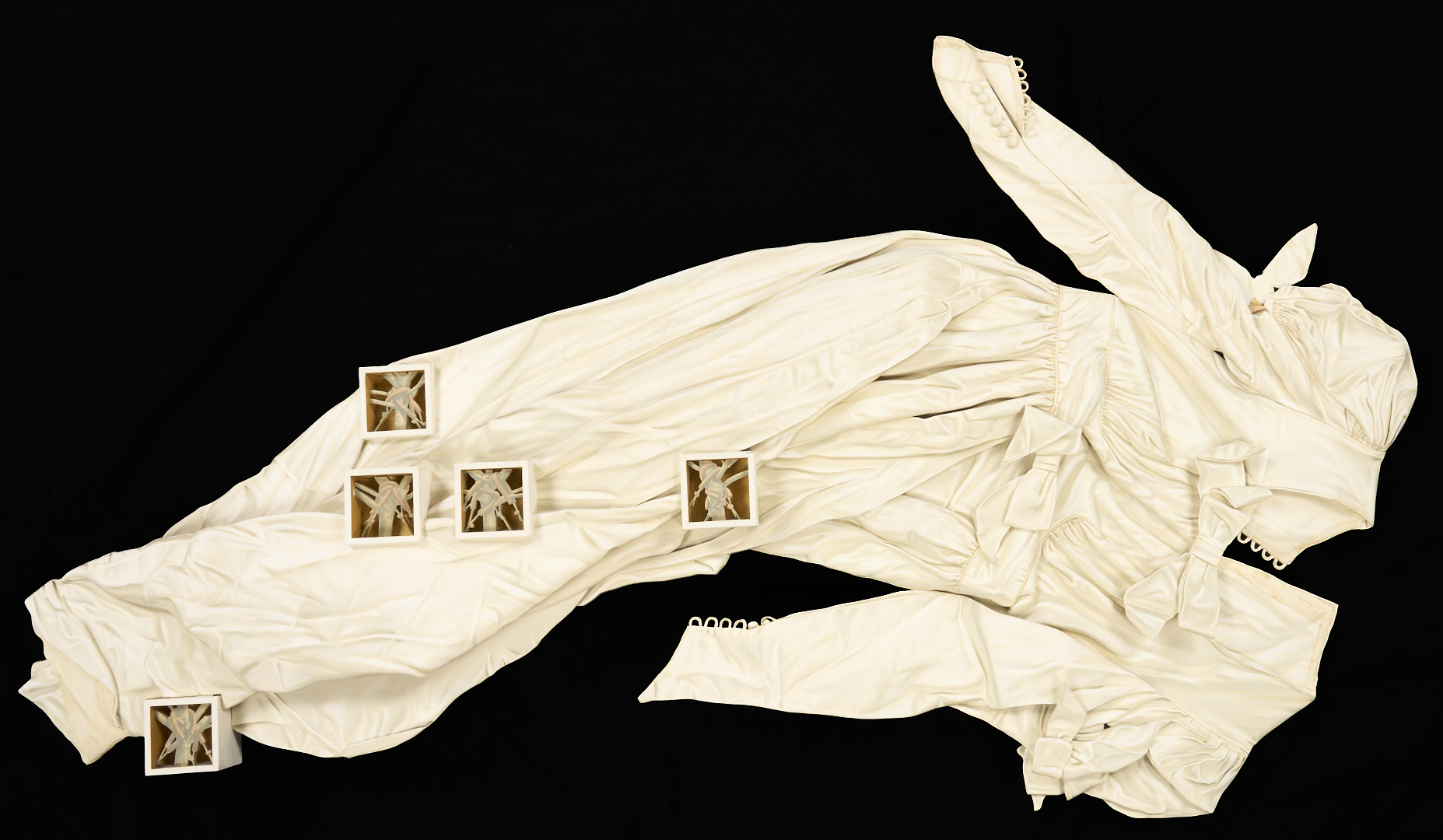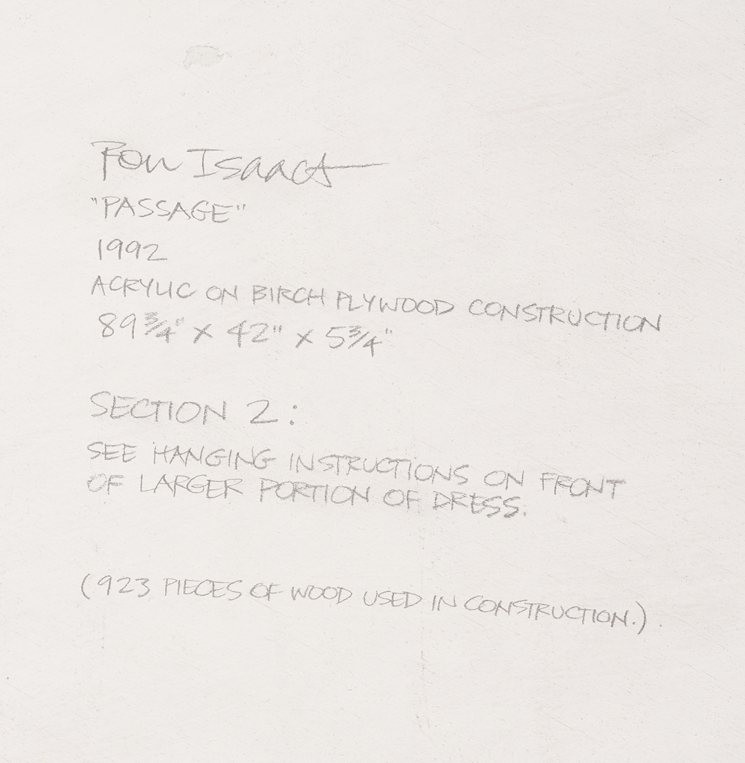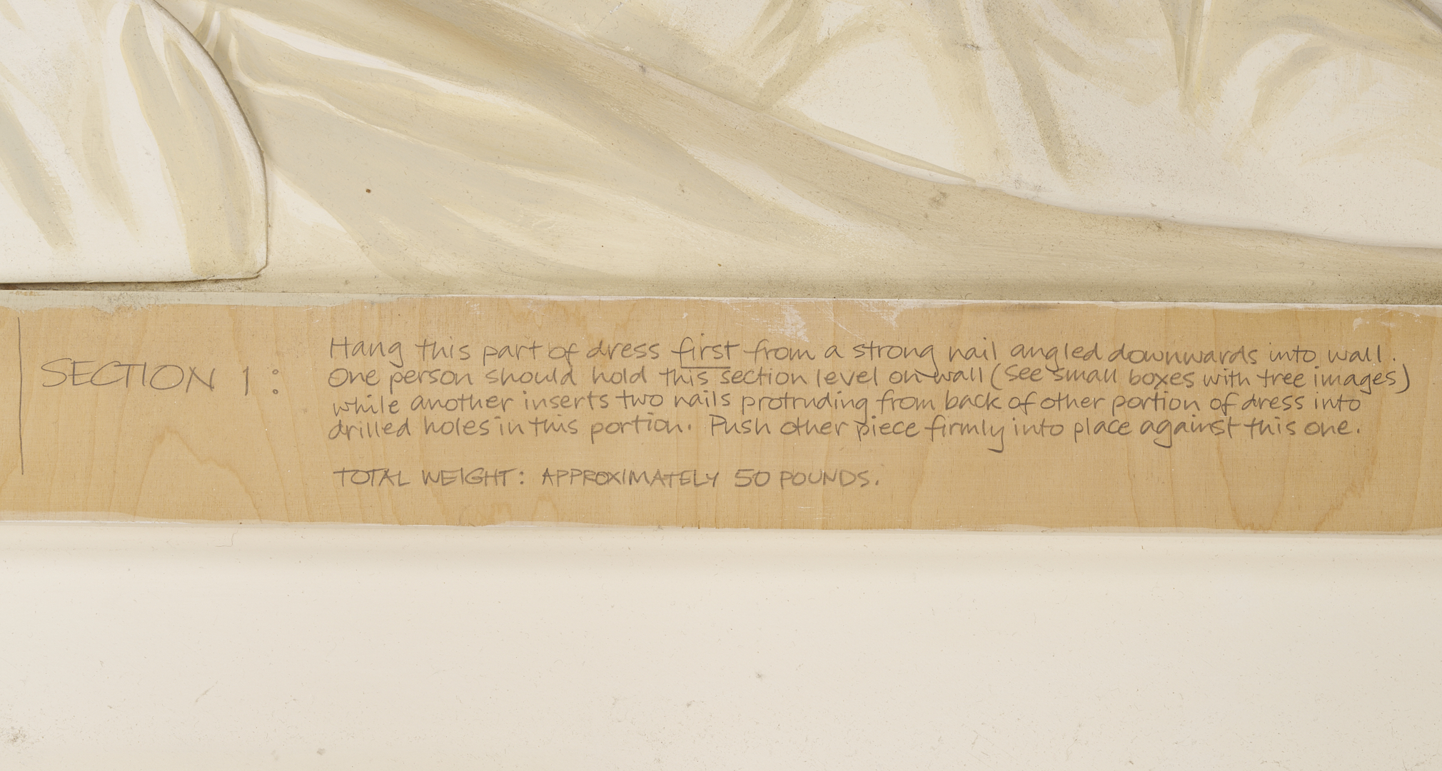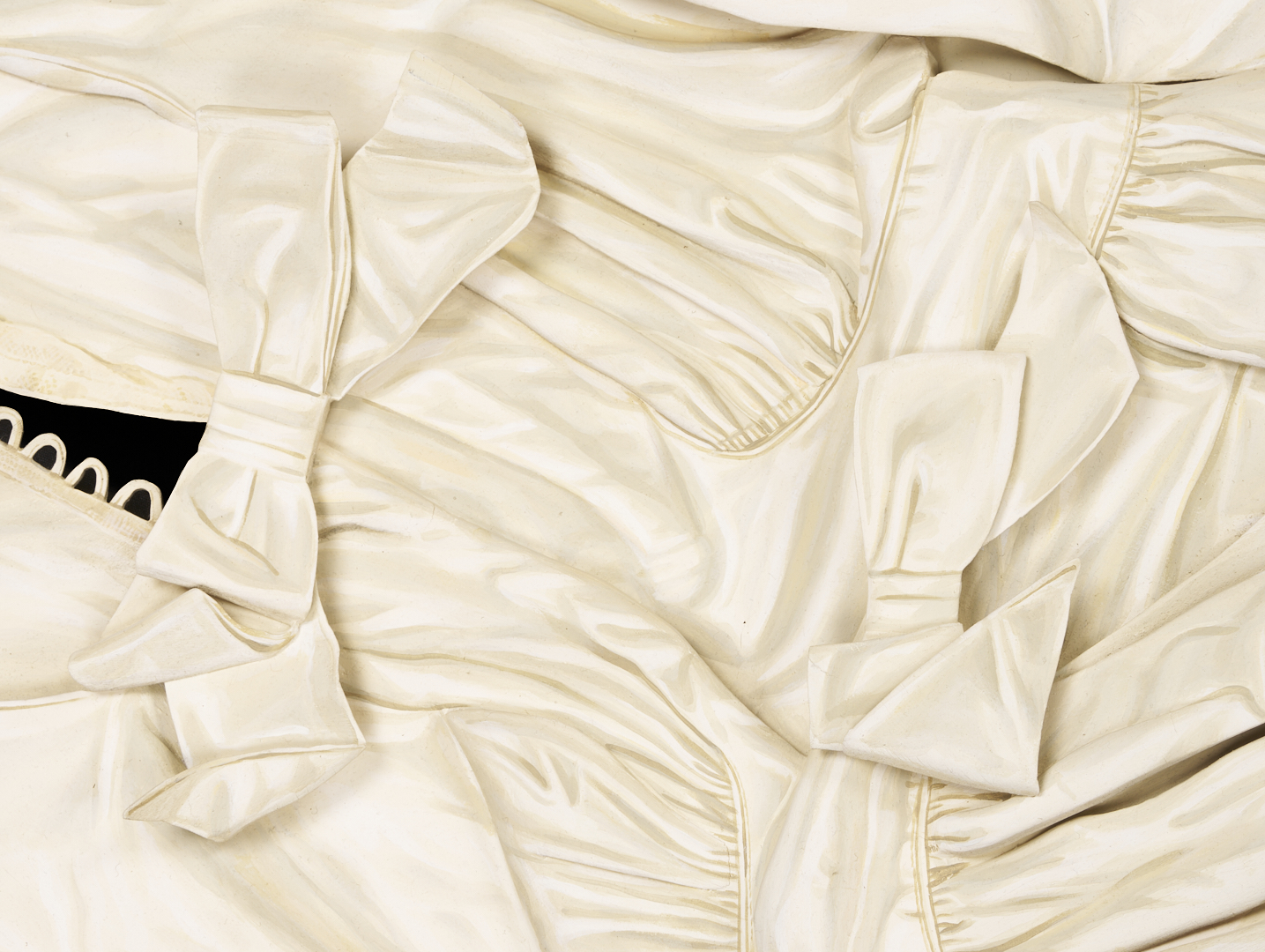 Ron Issacs (Kentucky/Ohio, 20th century) acrylic on birch plywood Trompe L’oeil sculpture titled “Passages” depicting a long white wedding dress with boxes of barbed wire inset into the skirt of the dress. Signed, titled, and dated 1992 en verso. 89 3/4 in. L x 42 in. H x 5 3/4 in. D.