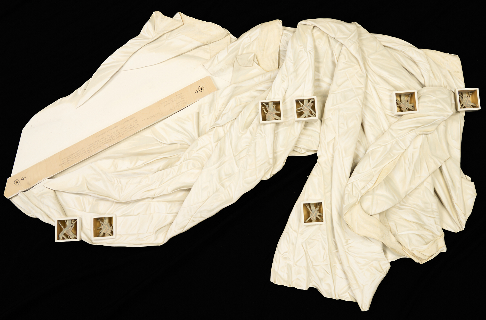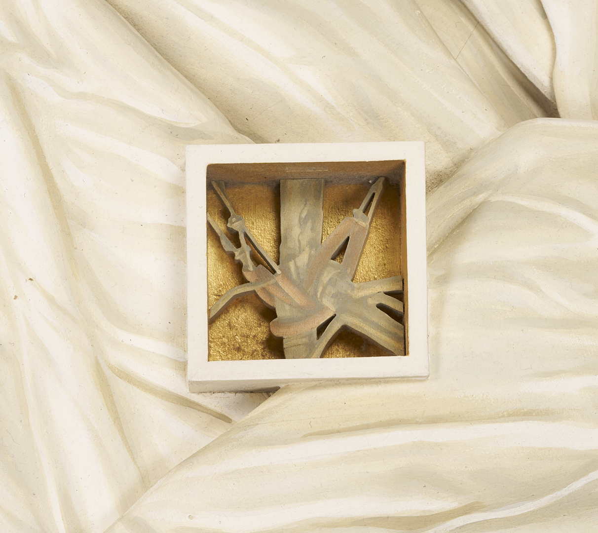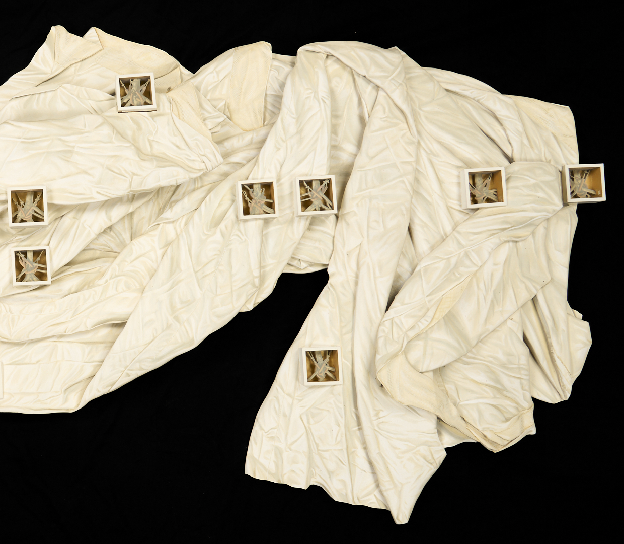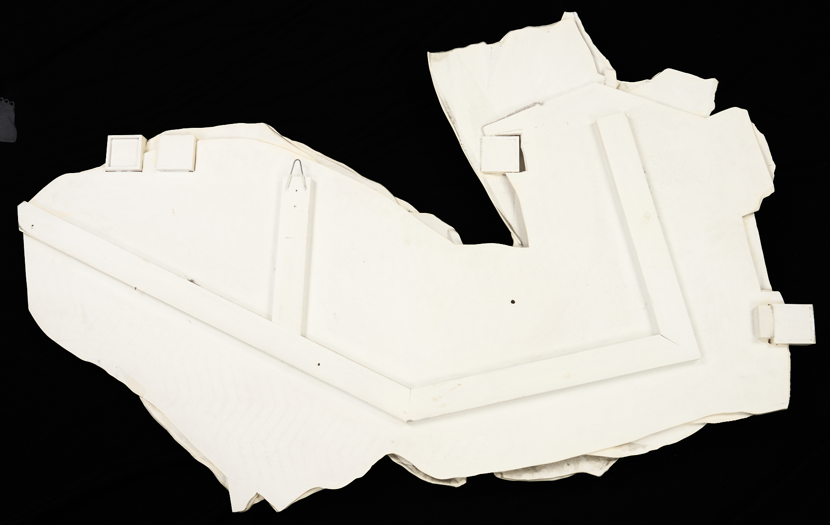 Ron Issacs (Kentucky/Ohio, 20th century) acrylic on birch plywood Trompe L’oeil sculpture titled “Passages” depicting a long white wedding dress with boxes of barbed wire inset into the skirt of the dress. Signed, titled, and dated 1992 en verso. 89 3/4 in. L x 42 in. H x 5 3/4 in. D.