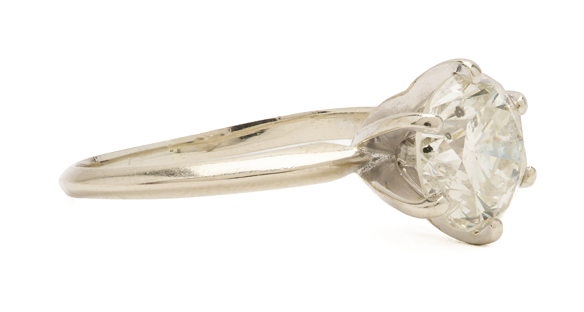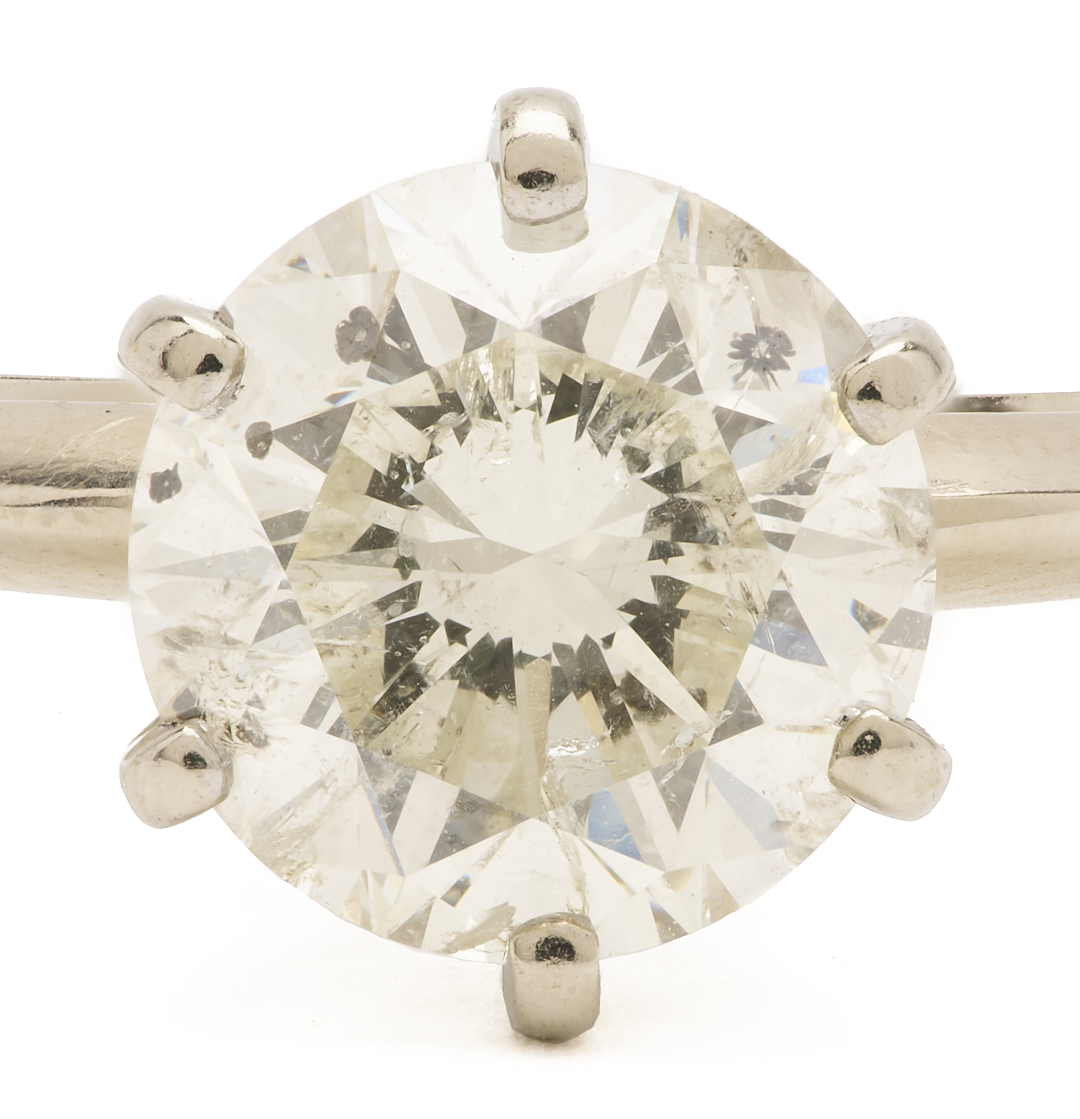 Ladies’ 14K white gold solitaire engagement ring featuring a round brilliant cut diamond approximately 3.10 carats, Clarity-I1, Color-J. The ring is marked “14K” and XRF tests 14K gold. The ring is size 8 and has a gross weight of 3.25 grams.