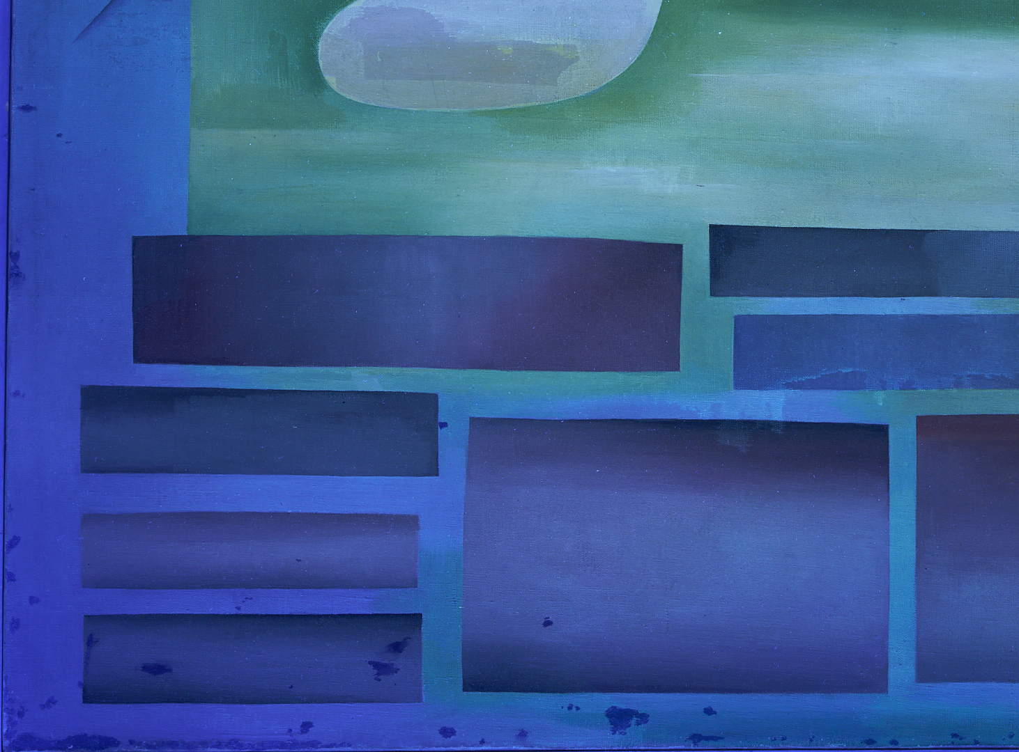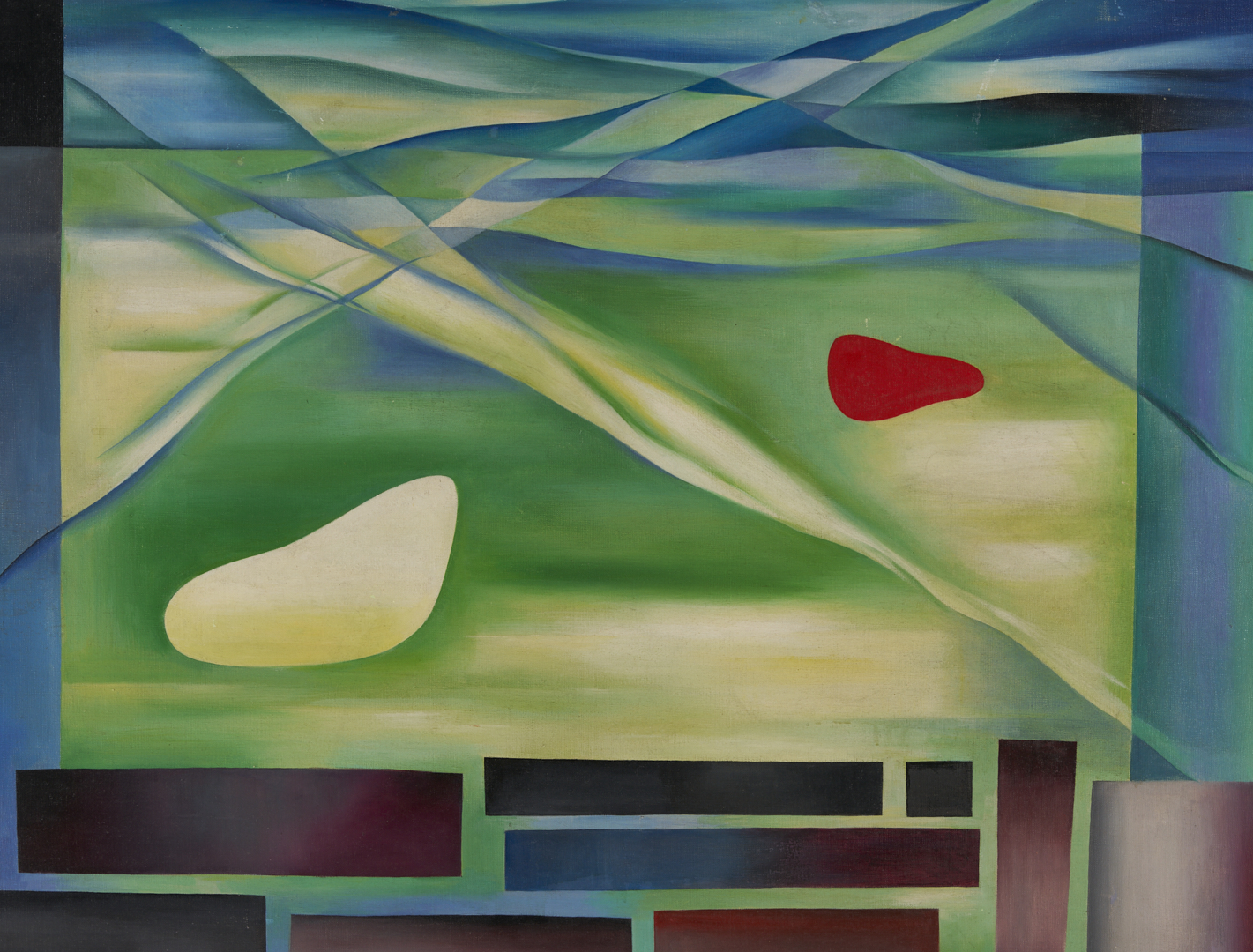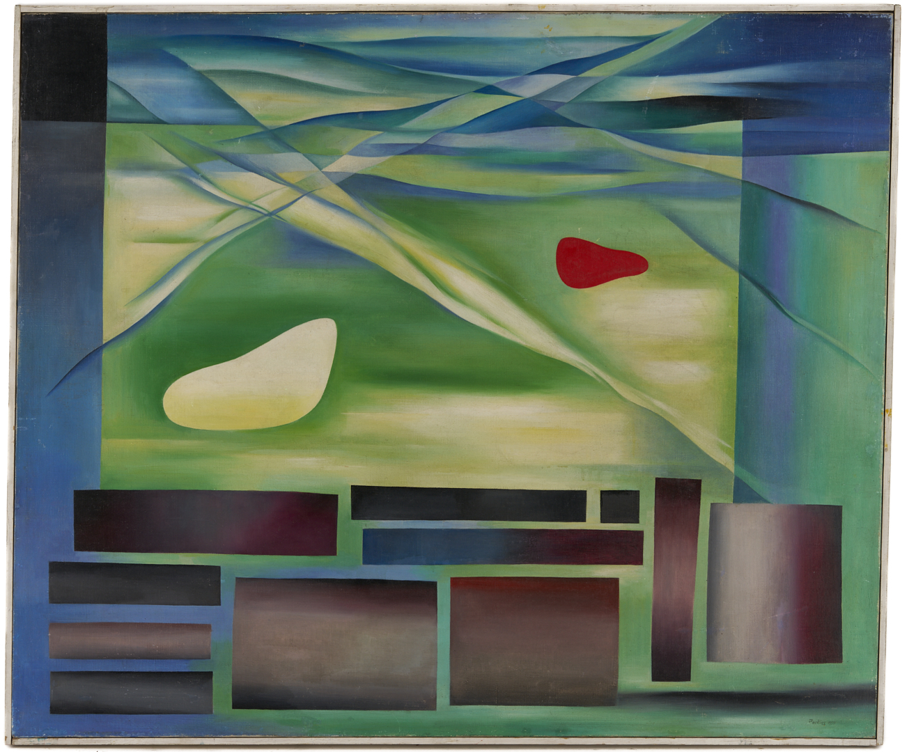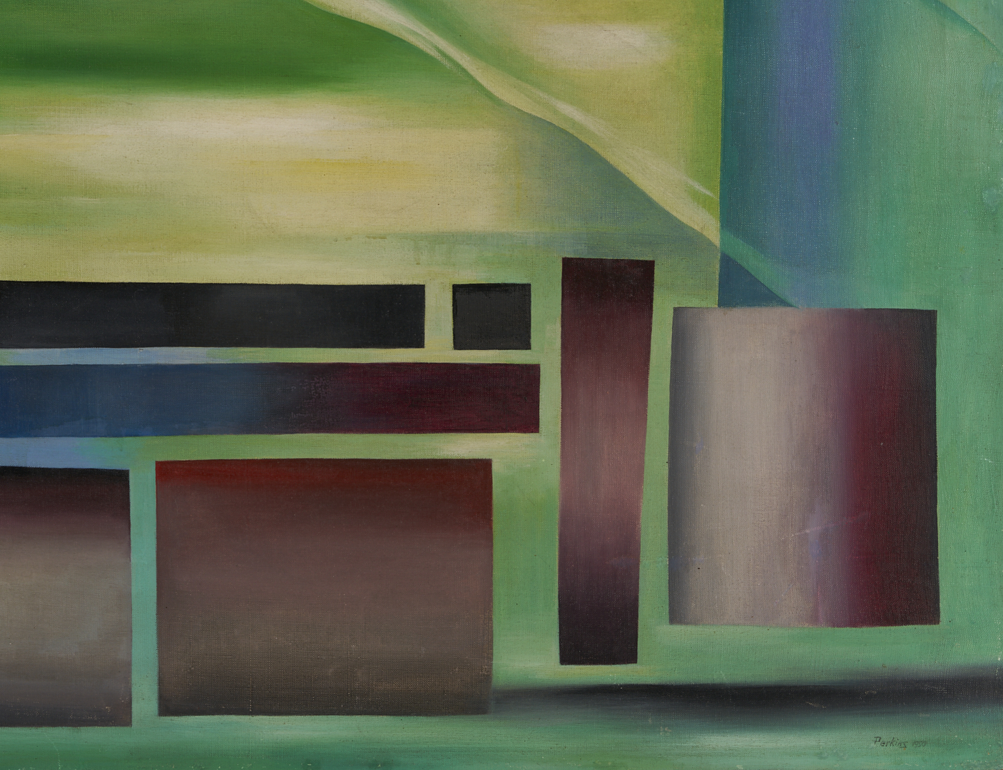 Philip Perkins (American/Tennessee, 1907-1970), “At-One-Ment,” oil on canvas surrealist influenced abstract painting; freeform reserves of color are suspended above an ethereal blue/green plane, which transitions into a field of rectangles and squares in gradient tones. Whitewashed wood temporary frame, possibly part of a larger frame now missing. Signed “Perkins” lower right and dated 1950, also titled en verso. Canvas: 30 in H x 36 in W. Frame: 30-3/4 in x 36-3/4in.