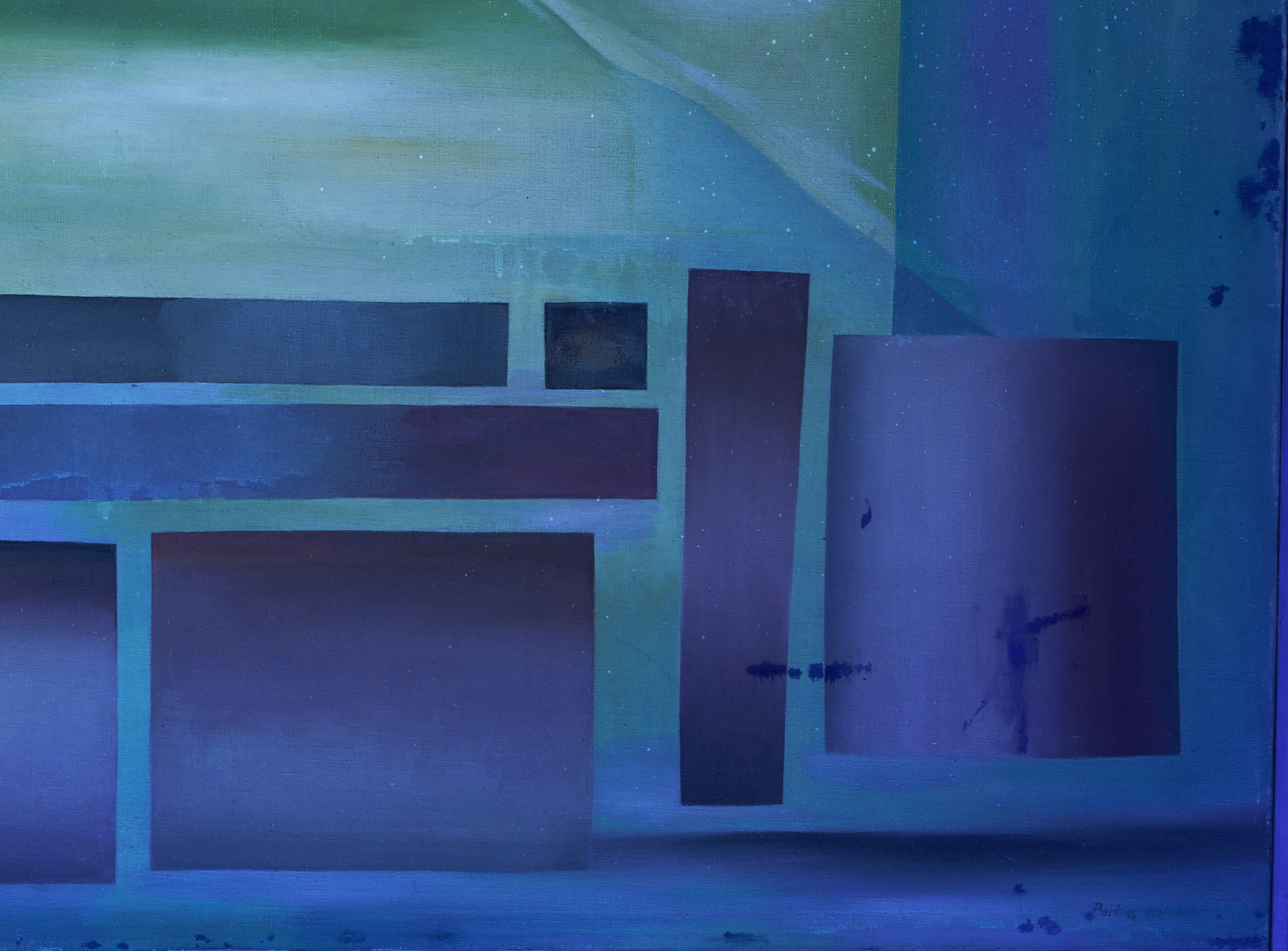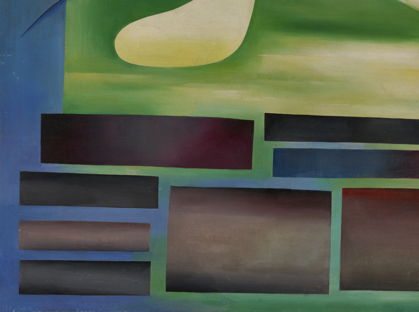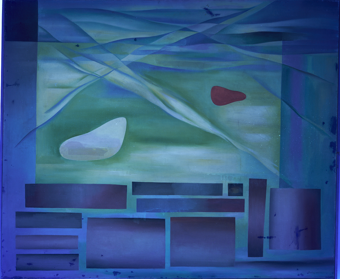 Philip Perkins (American/Tennessee, 1907-1970), “At-One-Ment,” oil on canvas surrealist influenced abstract painting; freeform reserves of color are suspended above an ethereal blue/green plane, which transitions into a field of rectangles and squares in gradient tones. Whitewashed wood temporary frame, possibly part of a larger frame now missing. Signed “Perkins” lower right and dated 1950, also titled en verso. Canvas: 30 in H x 36 in W. Frame: 30-3/4 in x 36-3/4in.