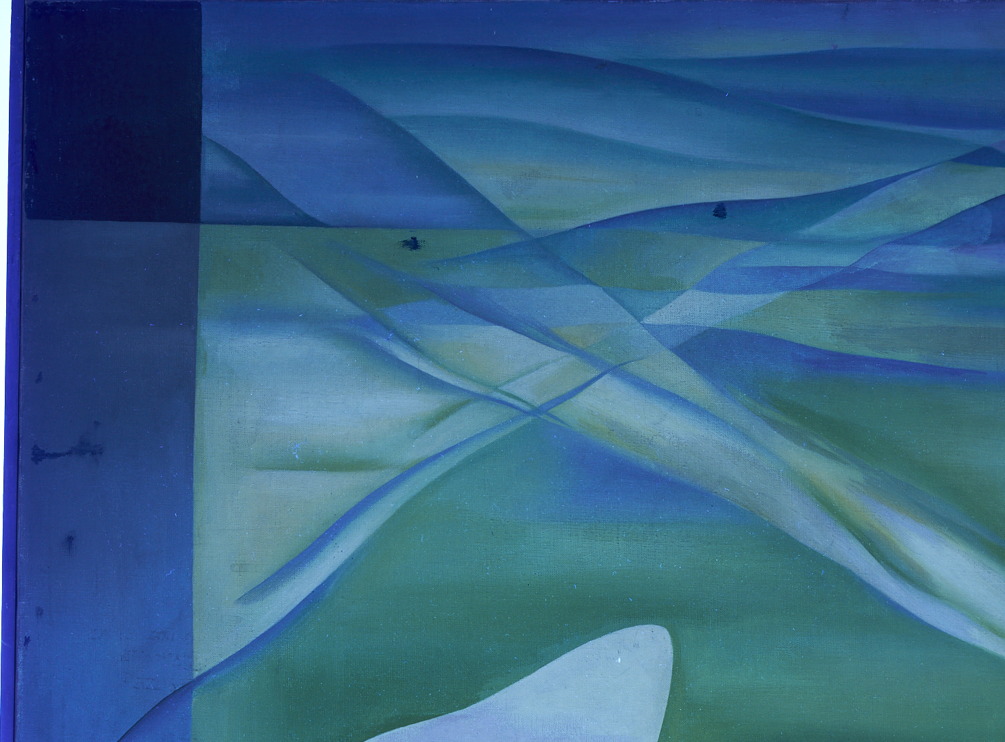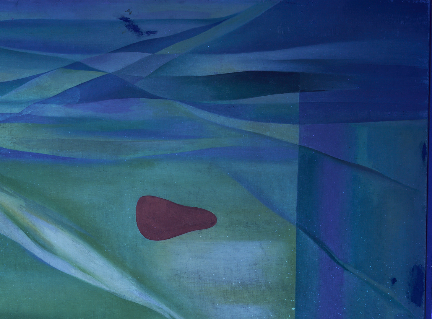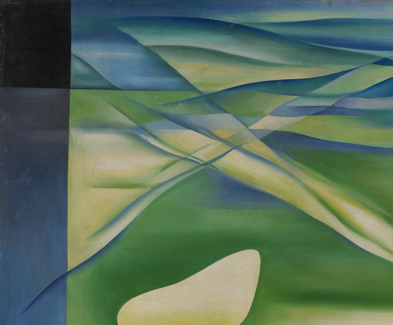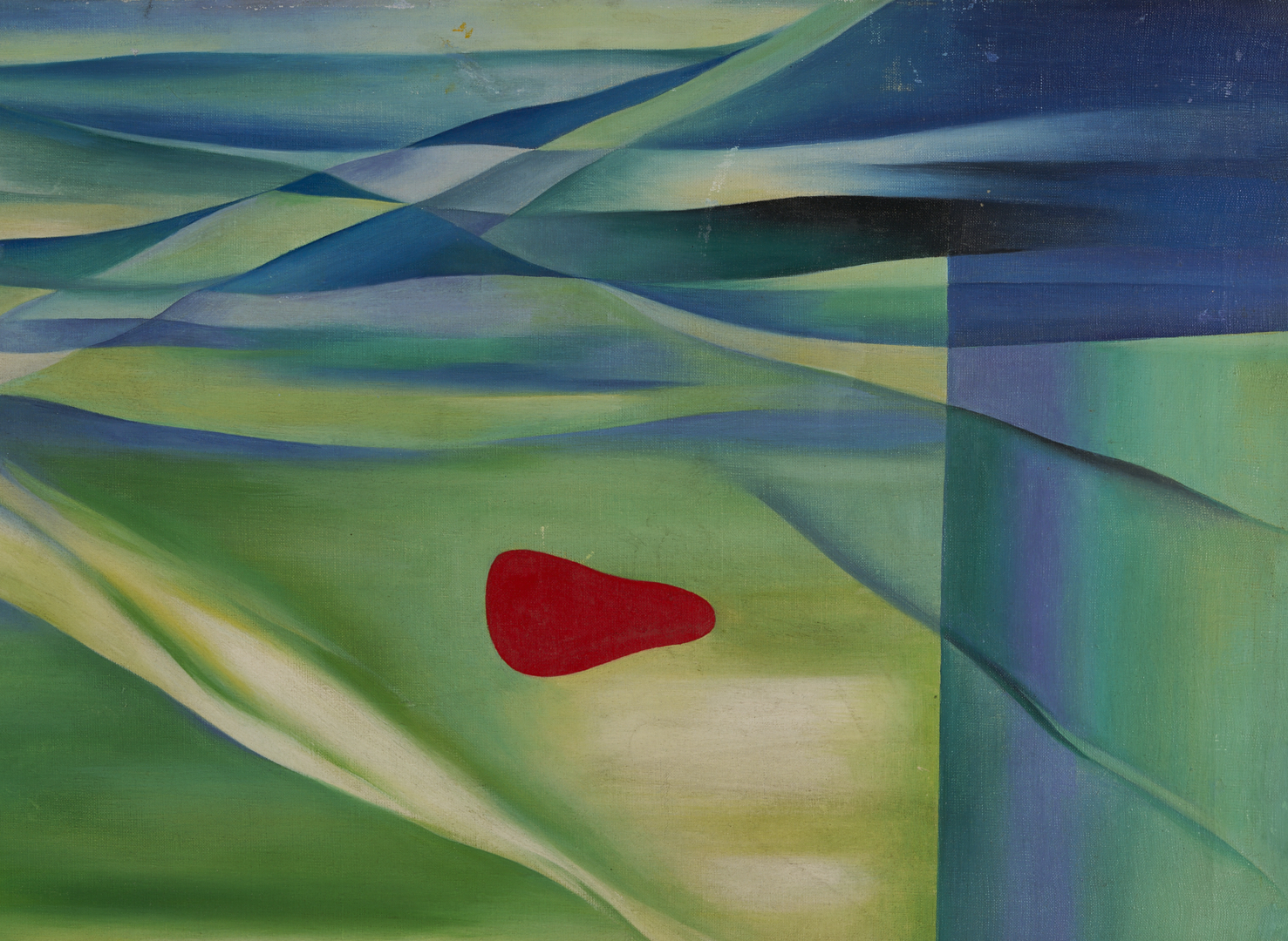 Philip Perkins (American/Tennessee, 1907-1970), “At-One-Ment,” oil on canvas surrealist influenced abstract painting; freeform reserves of color are suspended above an ethereal blue/green plane, which transitions into a field of rectangles and squares in gradient tones. Whitewashed wood temporary frame, possibly part of a larger frame now missing. Signed “Perkins” lower right and dated 1950, also titled en verso. Canvas: 30 in H x 36 in W. Frame: 30-3/4 in x 36-3/4in.