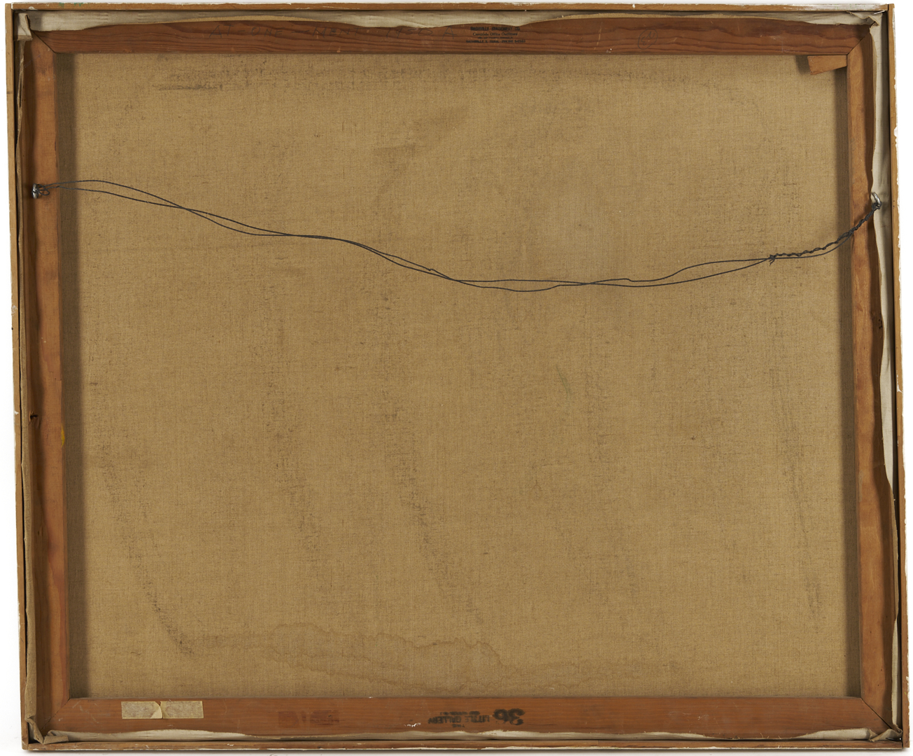Scattered passages of minor retouching, especially to frame abrasions along edges, largest 1 3/4 inch long. See UV photography. Area of small dimples to canvas upper left quadrant. Frame has wear and some numbers written in marker to exterior edge, with nails extruding.