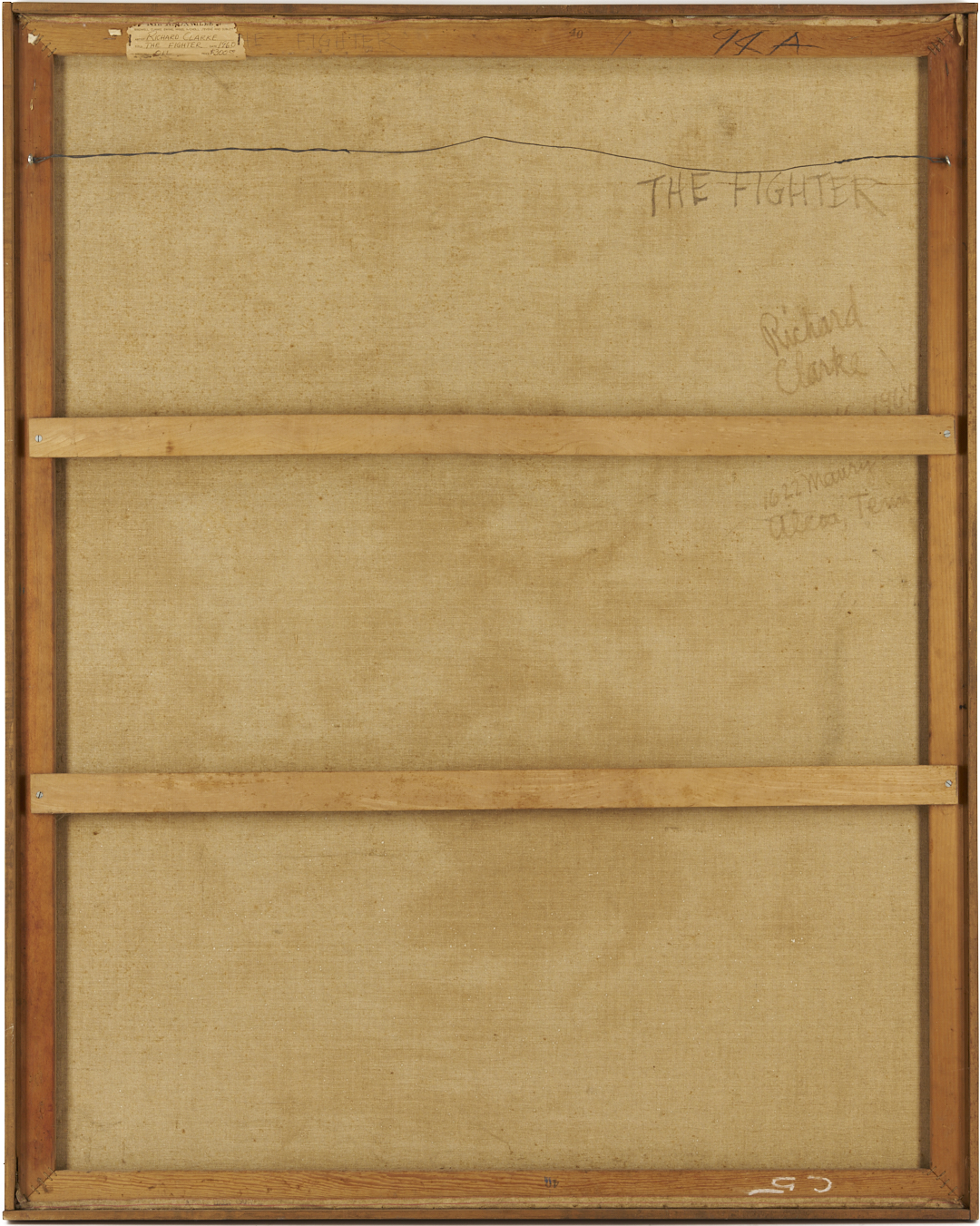 Richard Clarke (American/Tennessee,1923-1997) oil on canvas abstract expressionist painting, “The Fighter” 1960. Passages of heavy impasto — primarily in red, black, and yellow and which include paint applied directly from the tube — set over a red, black, and purple background suggest the torso, raised arms, and head of a goateed figure. Signed and dated “Clarke 60,” lower left. With title to verso and old label with title and artist information affixed to stretcher. Label reads “The Knoxville Seven / Birdwell, Clarke, Ewing, Higgs, Nichols, Stevens and Sublett.” Housed in a simple wood frame. Canvas: 50 in. H x 40 in. W. Frame: 51 in H x 41 in. H. Biographical Note: Richard Clarke was one of the early members of the University of Tennessee’s art faculty. He is often associated with the “Knoxville Seven,” a group of progressive artists connected to the University of Tennessee that included Robert Birdwell, C. Kermit Ewing, Joanna Higgs, Phillip Nichols, Walter H. Stevens and Carl Sublett. He often found inspiration in the natural world around him.