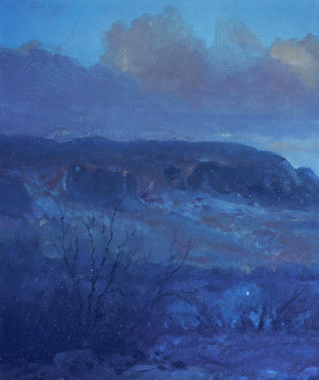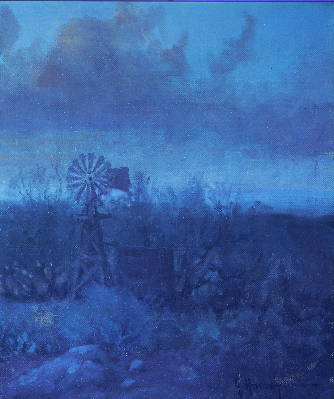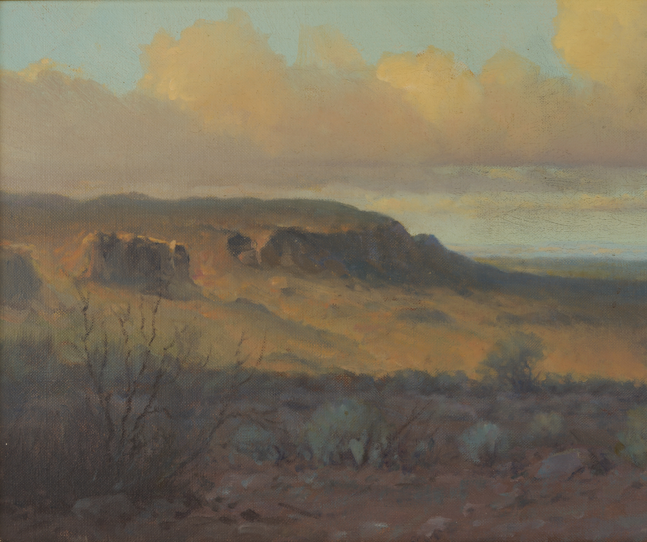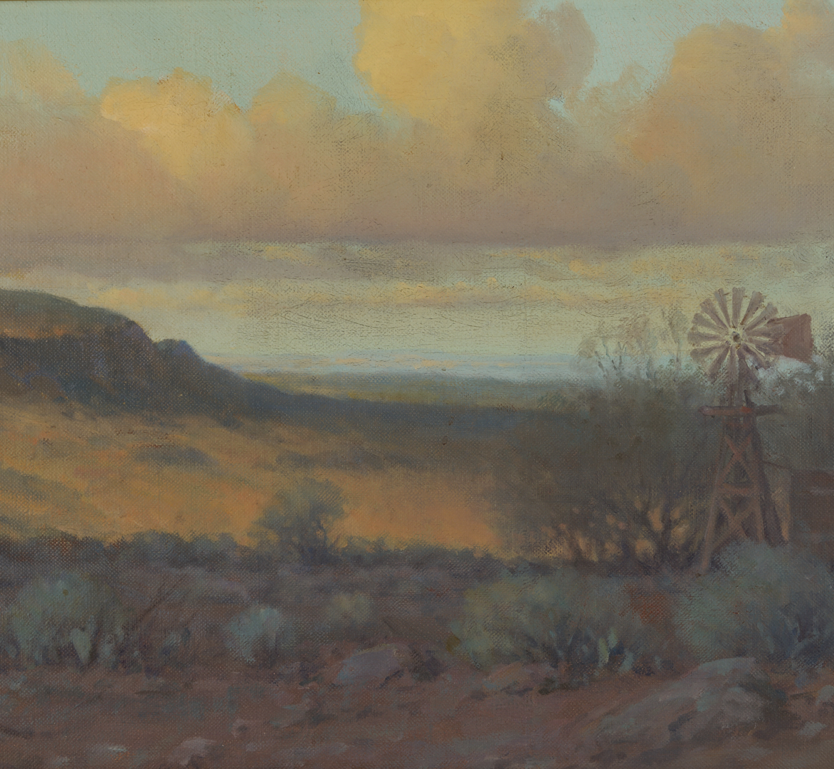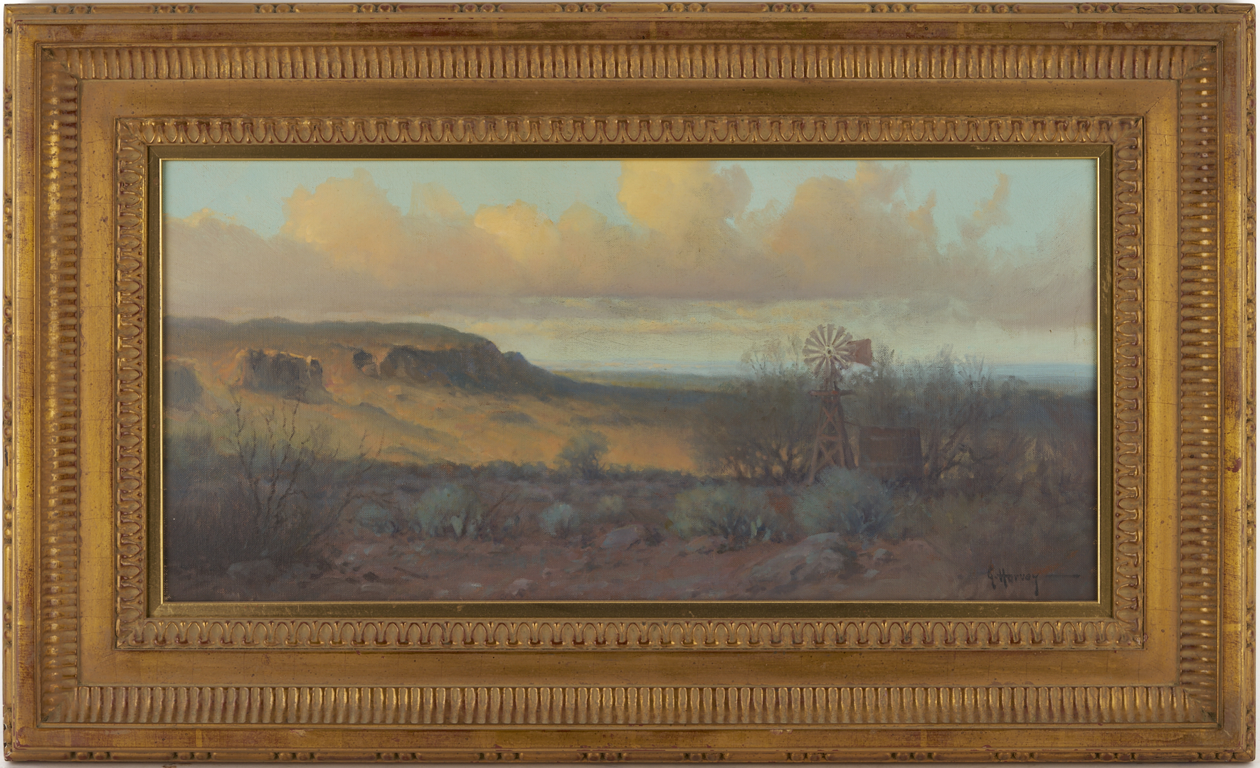 Gerald Harvey Jones (Texas, 1933-2017) oil on canvas landscape painting depicting a sunlit valley, likely in Texas, with mesa in the distance and windmill in the foreground. Signed “G. Harvey” lower right. Contemporary molded giltwood frame. 22 3/4 in. W x 10 1/2 in. H. Note: Artist Gerald Harvey Jones was raised in the hills north of San Antonio. He graduated from North Texas State University and in 1963 decided to take up painting full time. Two years later, he was awarded the New Masters award by the American Artists Professional League at the Grand National exhibition in New York. His paintings have been collected by several museums, corporations, and dignitaries including President Lyndon B. Johnson and Sen. John Connally, who presented a G. Harvey original to each governor of Mexico’s four northern states. The Smithsonian Institution commissioned Harvey to paint “The Smithsonian Dream” commemorating its 150th anniversary. (Source: artist’s website).