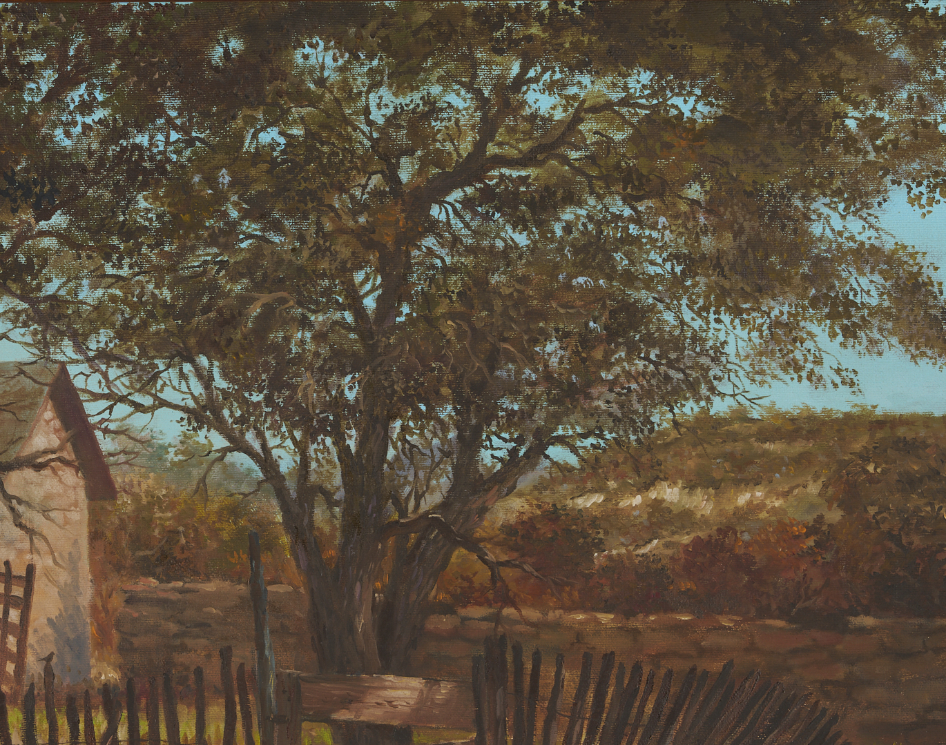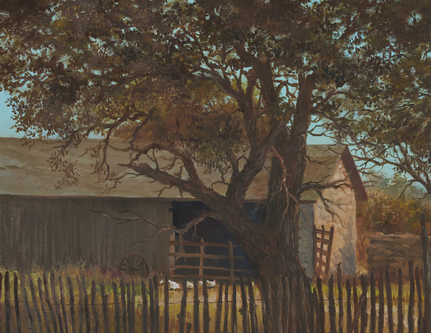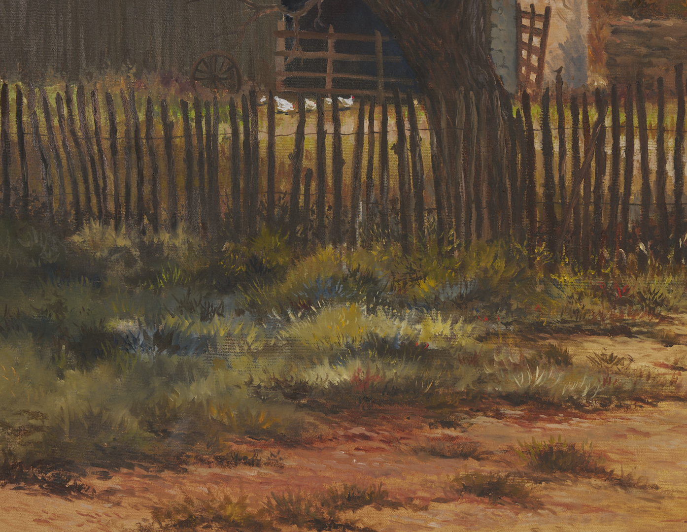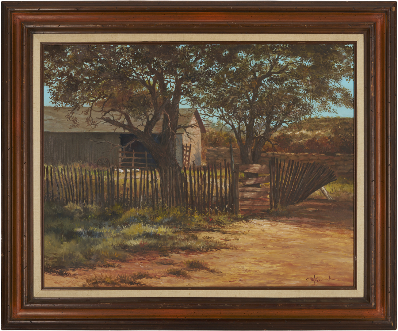 George Kovach (American/Texas, b. 1942) oil on canvas Texas landscape painting depicting a farmyard with an old fence that runs before a barn. A few chickens stand in the yard before the barn and the branches of two trees fill the blue, cloudless sky. Signed lower right. Housed in a painted wood frame with textile liner. Sight: 21 1/4 in. H x 27 in. W. Framed: 29 1/4 in. H x 35 1/4 in. W.