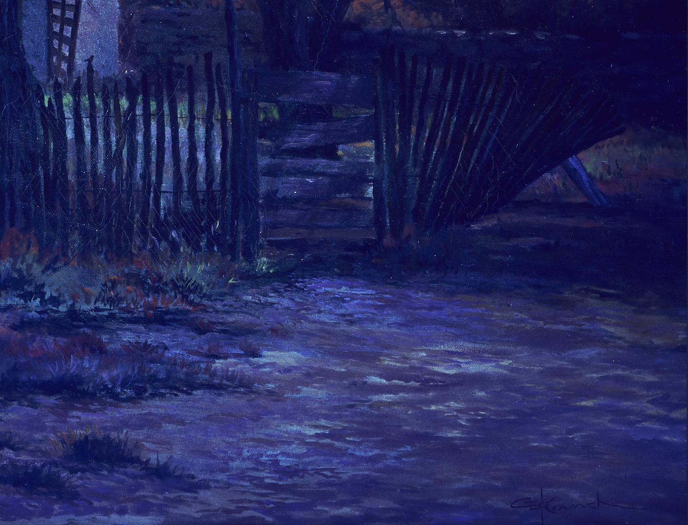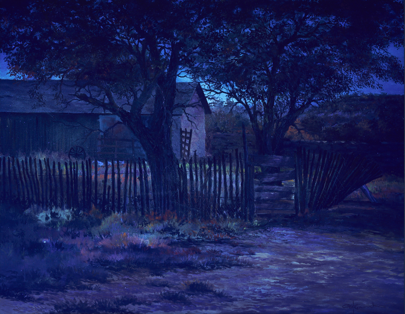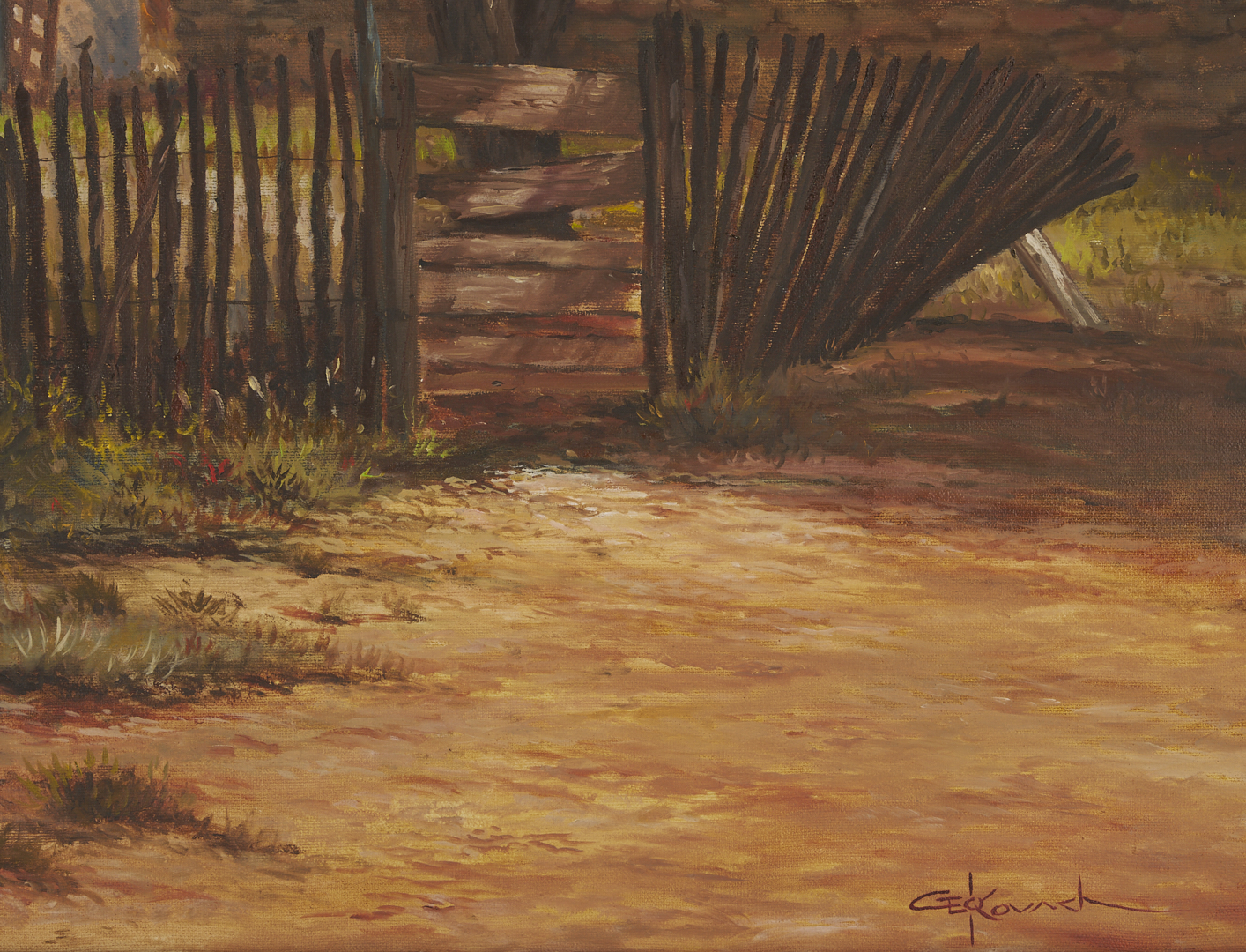 George Kovach (American/Texas, b. 1942) oil on canvas Texas landscape painting depicting a farmyard with an old fence that runs before a barn. A few chickens stand in the yard before the barn and the branches of two trees fill the blue, cloudless sky. Signed lower right. Housed in a painted wood frame with textile liner. Sight: 21 1/4 in. H x 27 in. W. Framed: 29 1/4 in. H x 35 1/4 in. W.