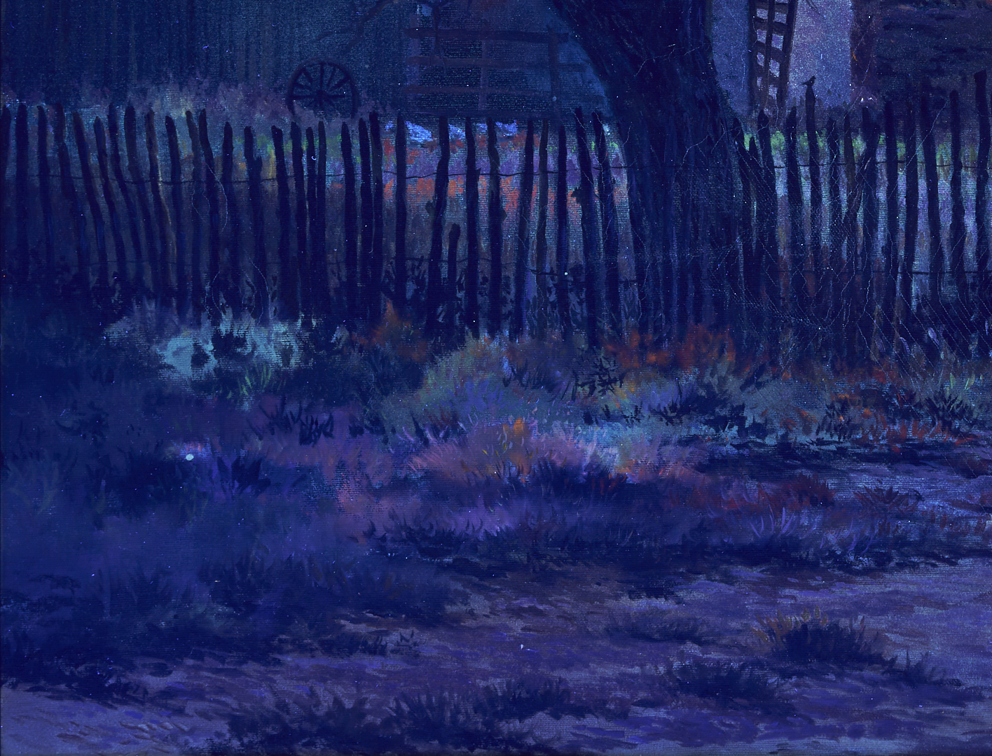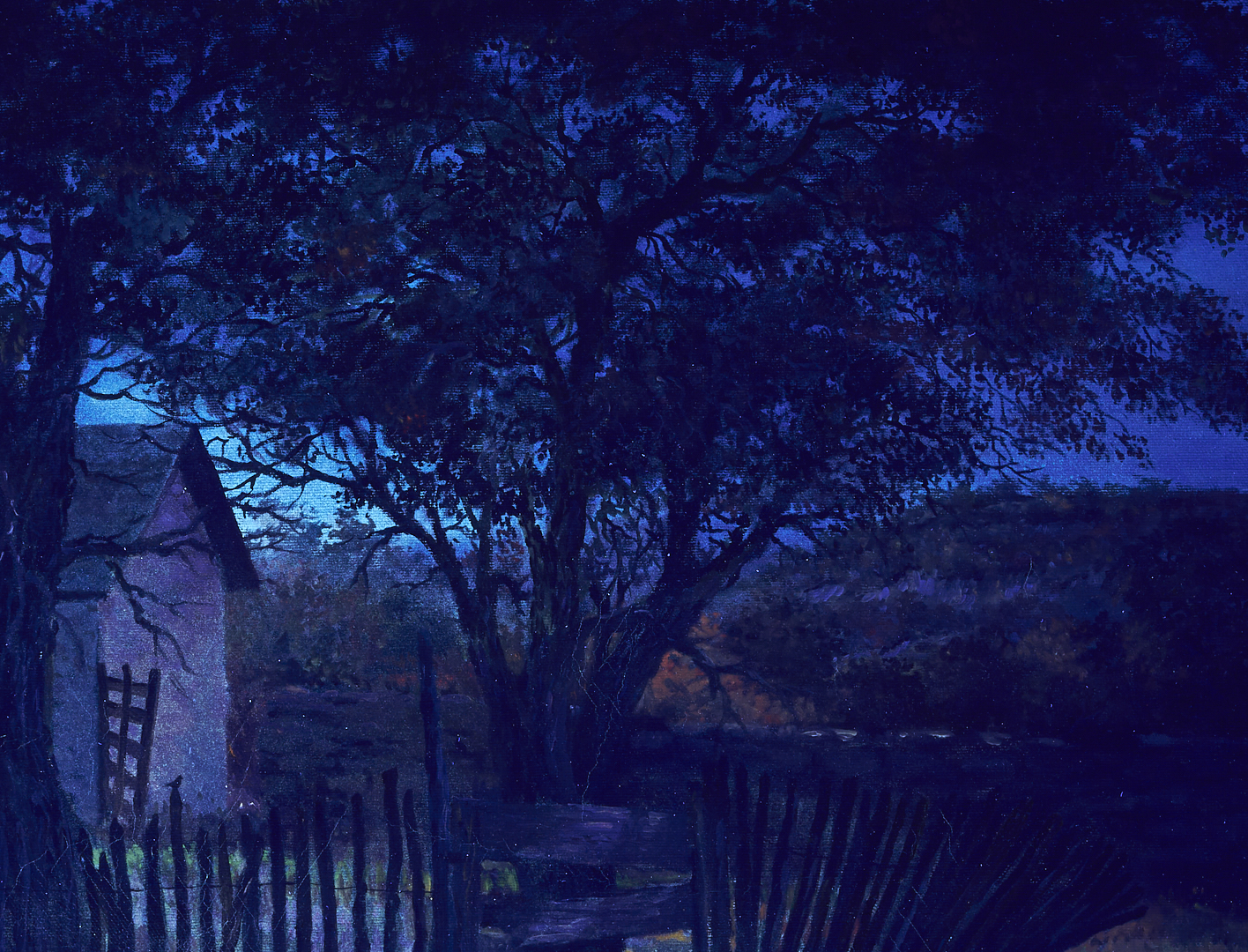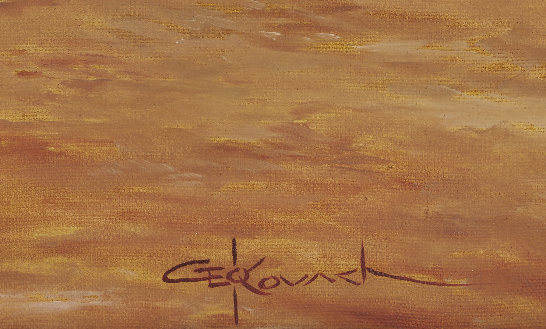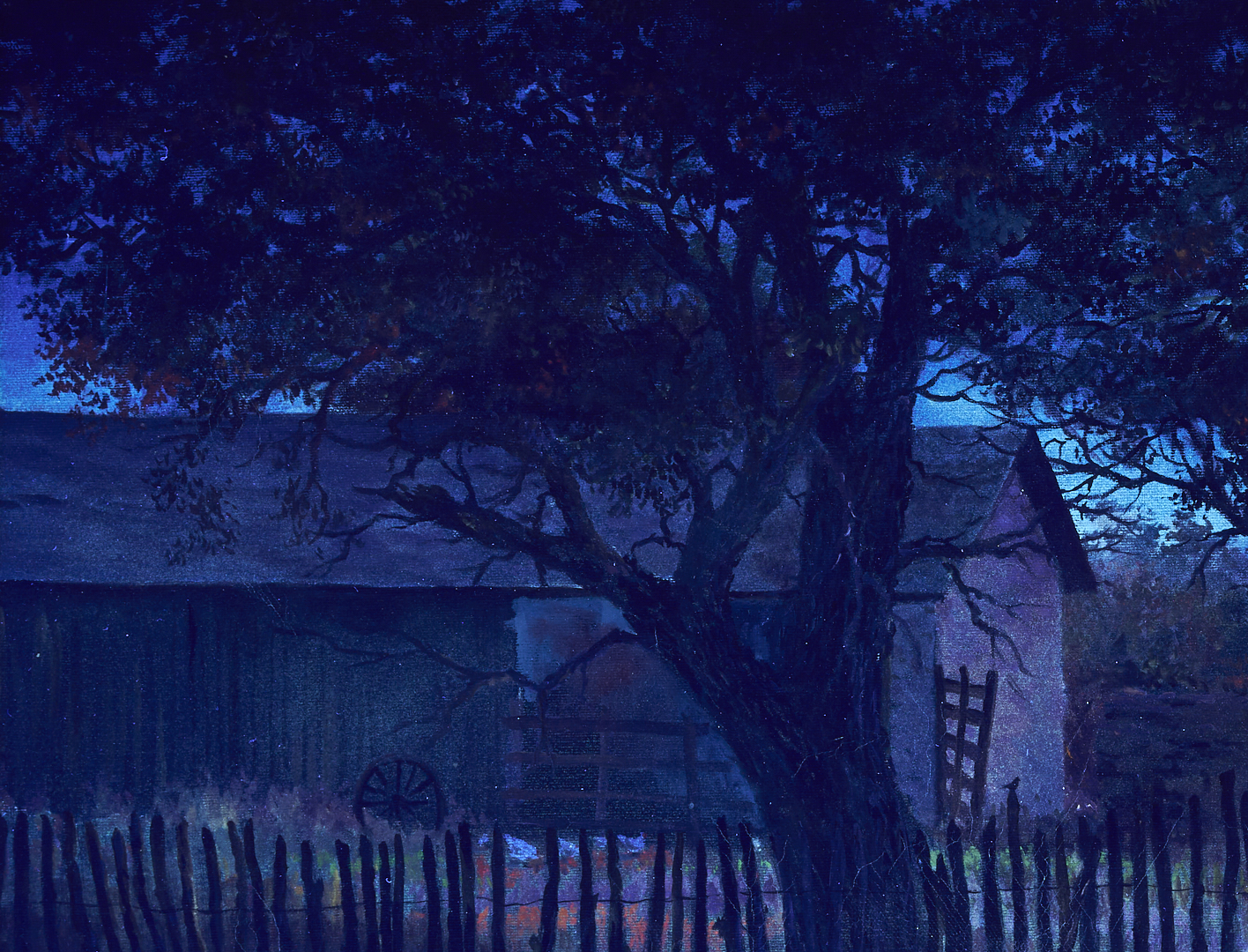 George Kovach (American/Texas, b. 1942) oil on canvas Texas landscape painting depicting a farmyard with an old fence that runs before a barn. A few chickens stand in the yard before the barn and the branches of two trees fill the blue, cloudless sky. Signed lower right. Housed in a painted wood frame with textile liner. Sight: 21 1/4 in. H x 27 in. W. Framed: 29 1/4 in. H x 35 1/4 in. W.