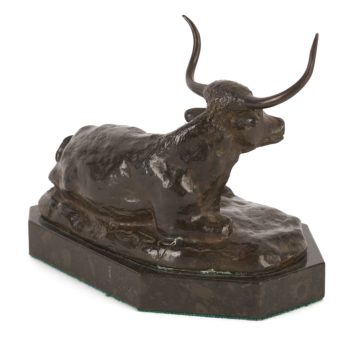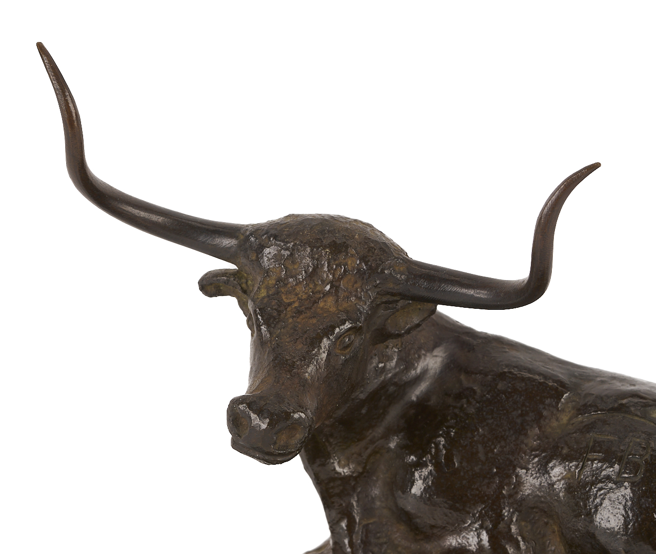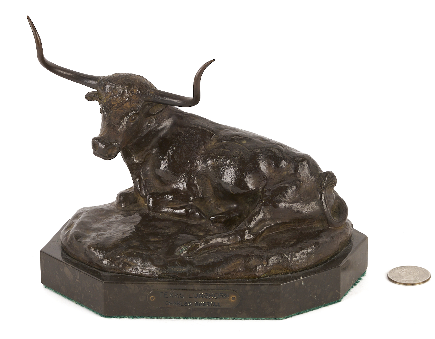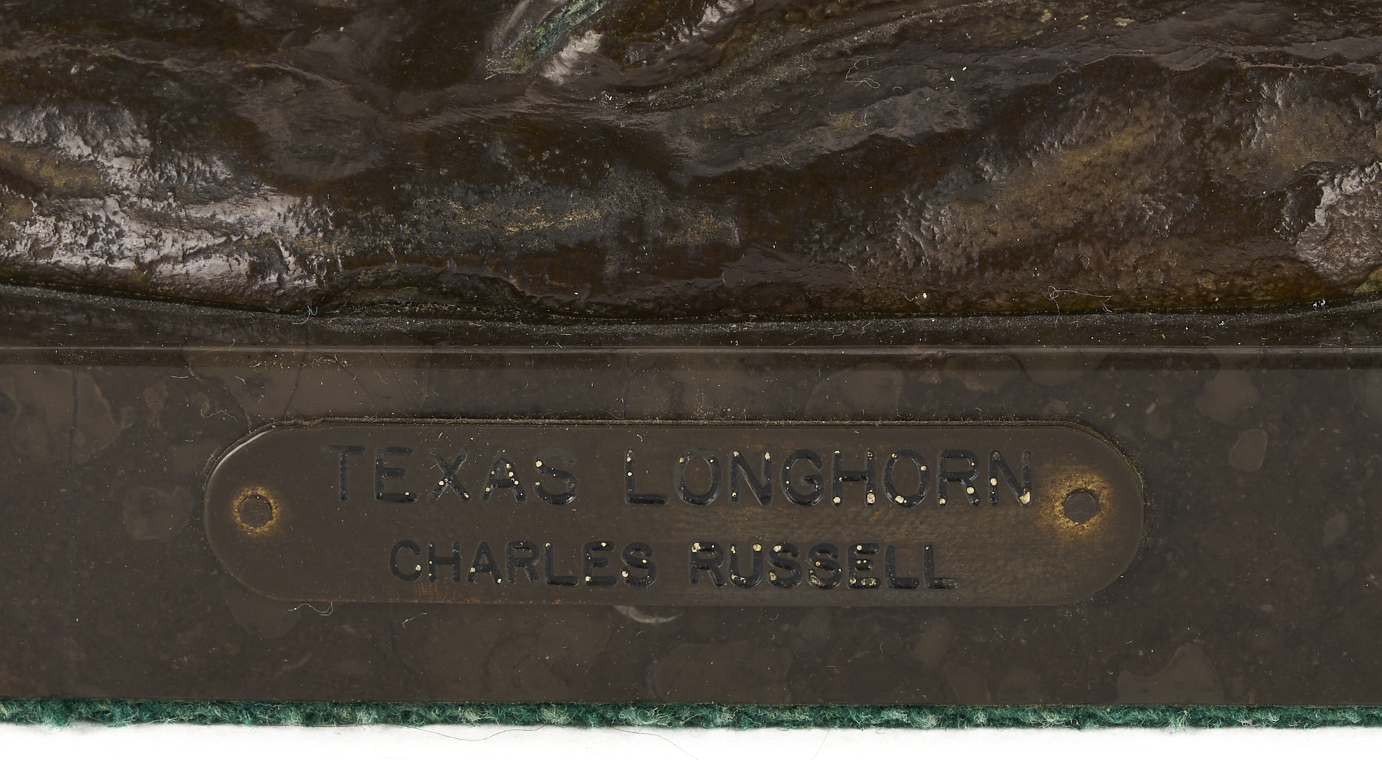 Harry A. Jackson (American, 1924-2011) after Charles Russell (1864-1926), “Texas Longhorn,” number 39, signed CMR with skull. One of approximately 60 cast by Jackson in 1972 for James Fowler from a plaster model originally made by Russell. The steer is branded FB for rancher Frank Bogart and rests atop a naturalistic ground. Mounted on an irregular 8-sided polished stone base (3/4 in. H) with bronze title plaque. Sculpture (not including stone base): 5 1/4 in. H x 6 1/2 in. W x 3 3/4 in. D. Overall: 6 in. H x 7 1/2 in. W x 4 1/4 in. D. Ref.: R-45 in Rick Stewart, “Charles M. Russell, Sculptor,” 1994, p. 355. Biography: Artist Harry Jackson was born in Chicago, but at age 14 hopped a freight train to Wyoming to become a cowboy. He worked as a combat artist in World War II and studied art at the Academy of Fine Arts and Chicago Art Institute under the GI Bill after returning. In New York he befriended painters including Jackson Pollock and Willem de Kooning and was married briefly to Grace Hartigan. In the early 1950s he traveled to Europe to study the Old Masters. Although he produced a number of abstract works, he is most noted for his representational bronze sculptures that illustrate life in the Old West. (Source: Buffalo Bill Center of the West, the Smithsonian American Art Museum).
