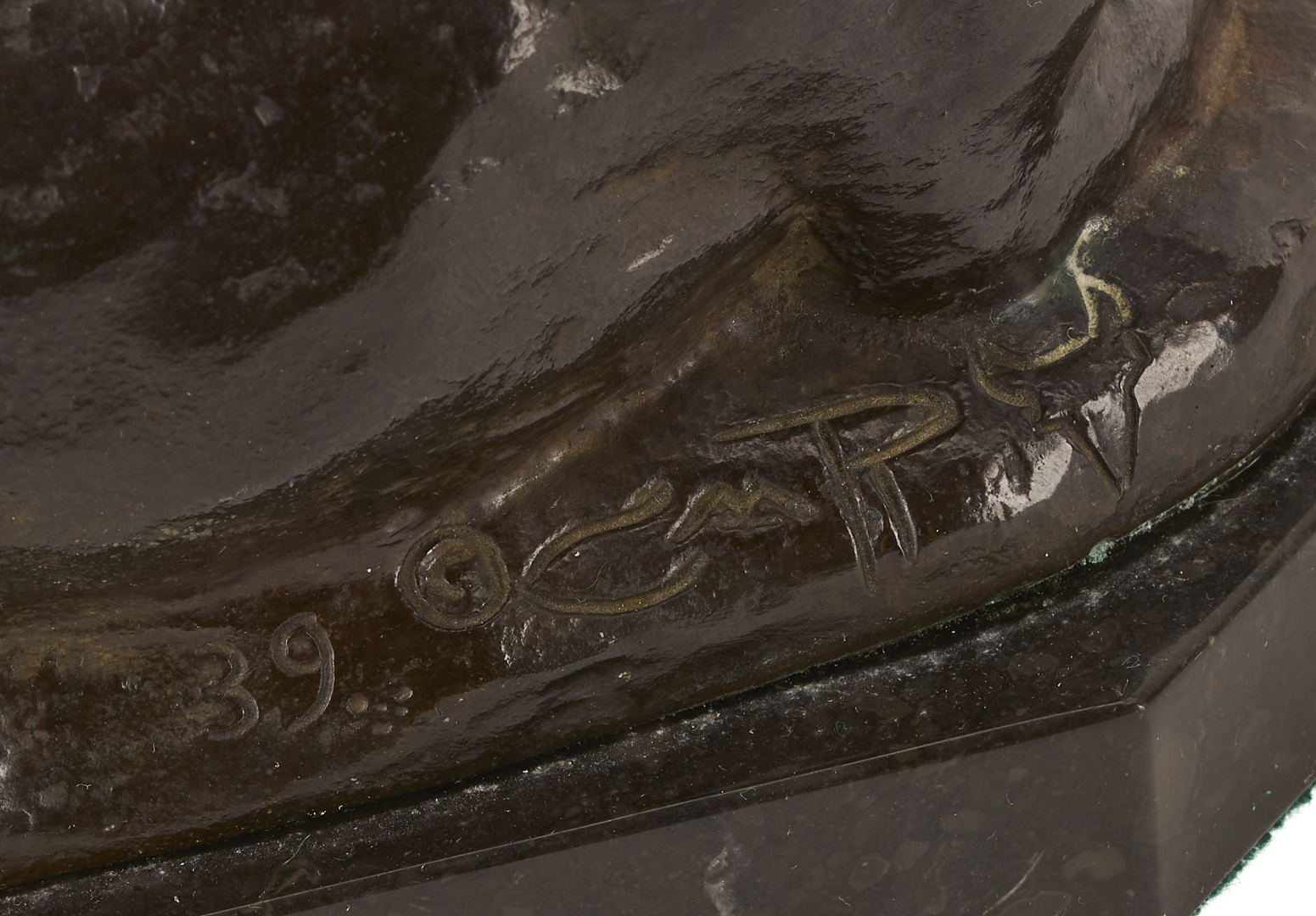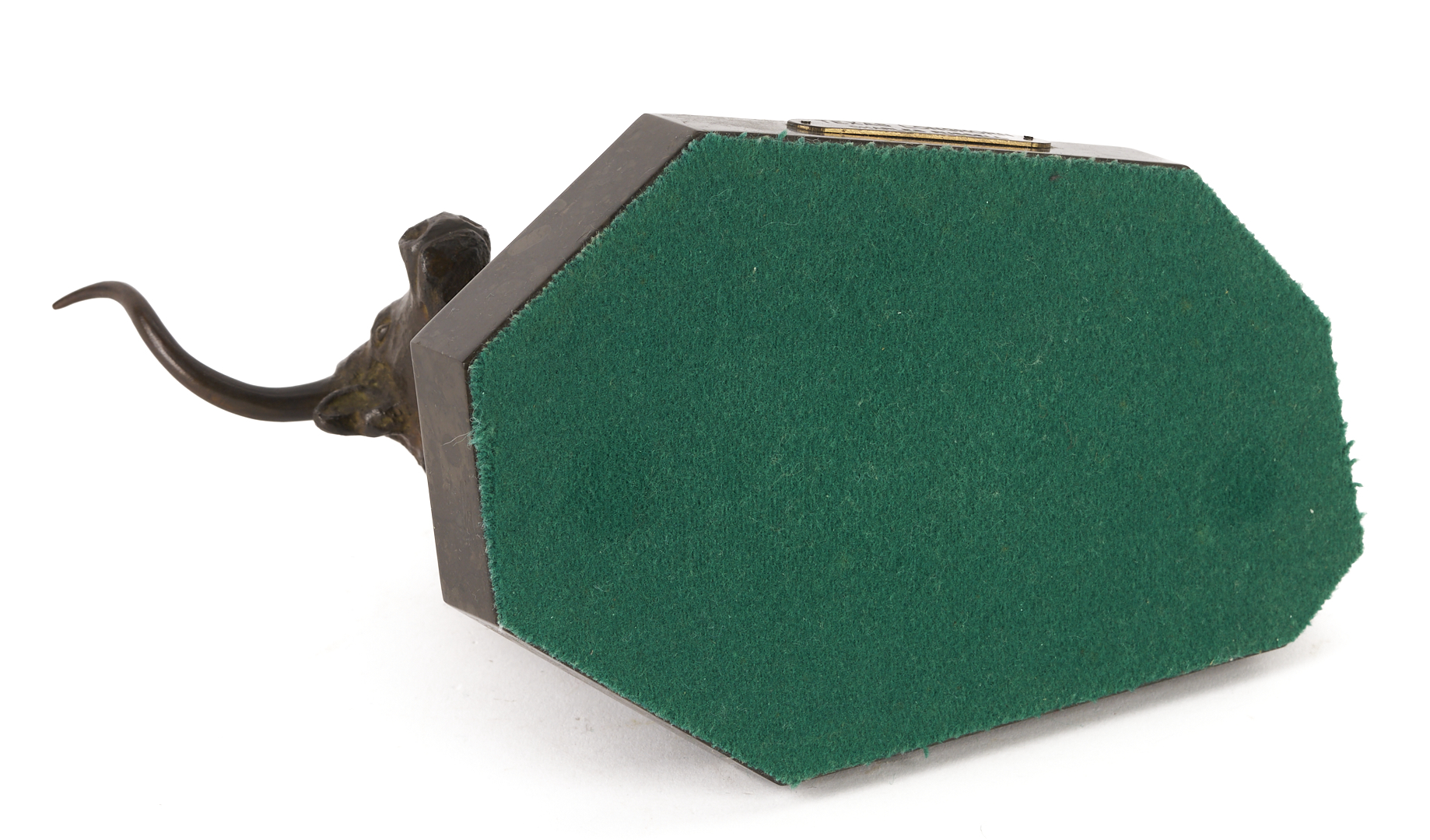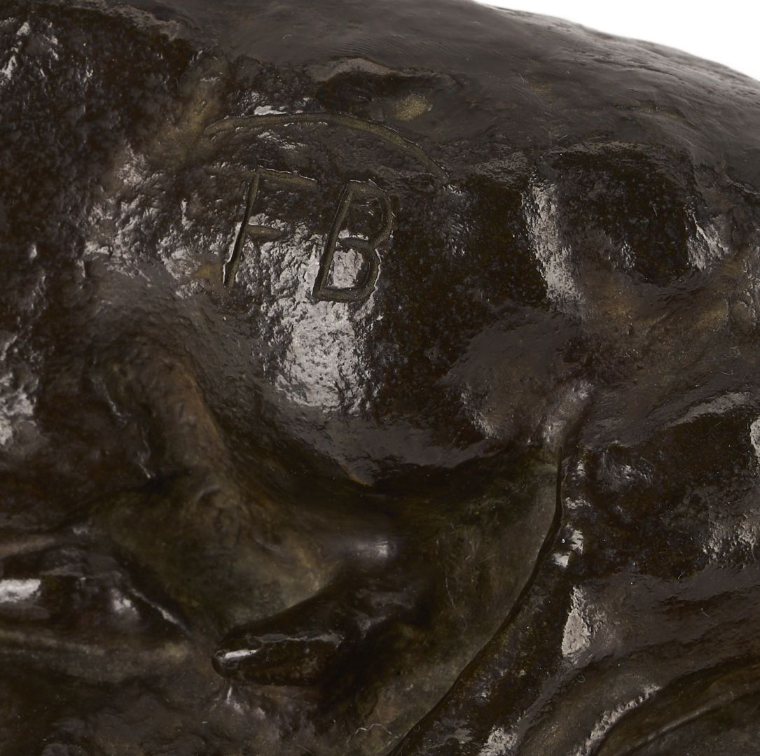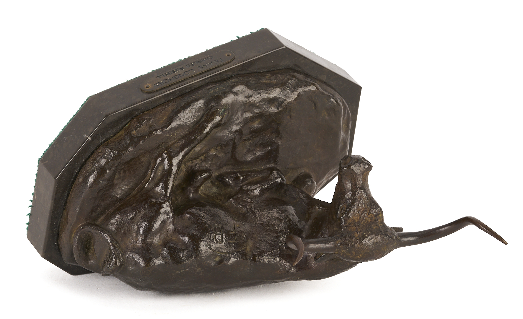 Harry A. Jackson (American, 1924-2011) after Charles Russell (1864-1926), “Texas Longhorn,” number 39, signed CMR with skull. One of approximately 60 cast by Jackson in 1972 for James Fowler from a plaster model originally made by Russell. The steer is branded FB for rancher Frank Bogart and rests atop a naturalistic ground. Mounted on an irregular 8-sided polished stone base (3/4 in. H) with bronze title plaque. Sculpture (not including stone base): 5 1/4 in. H x 6 1/2 in. W x 3 3/4 in. D. Overall: 6 in. H x 7 1/2 in. W x 4 1/4 in. D. Ref.: R-45 in Rick Stewart, “Charles M. Russell, Sculptor,” 1994, p. 355. Biography: Artist Harry Jackson was born in Chicago, but at age 14 hopped a freight train to Wyoming to become a cowboy. He worked as a combat artist in World War II and studied art at the Academy of Fine Arts and Chicago Art Institute under the GI Bill after returning. In New York he befriended painters including Jackson Pollock and Willem de Kooning and was married briefly to Grace Hartigan. In the early 1950s he traveled to Europe to study the Old Masters. Although he produced a number of abstract works, he is most noted for his representational bronze sculptures that illustrate life in the Old West. (Source: Buffalo Bill Center of the West, the Smithsonian American Art Museum).