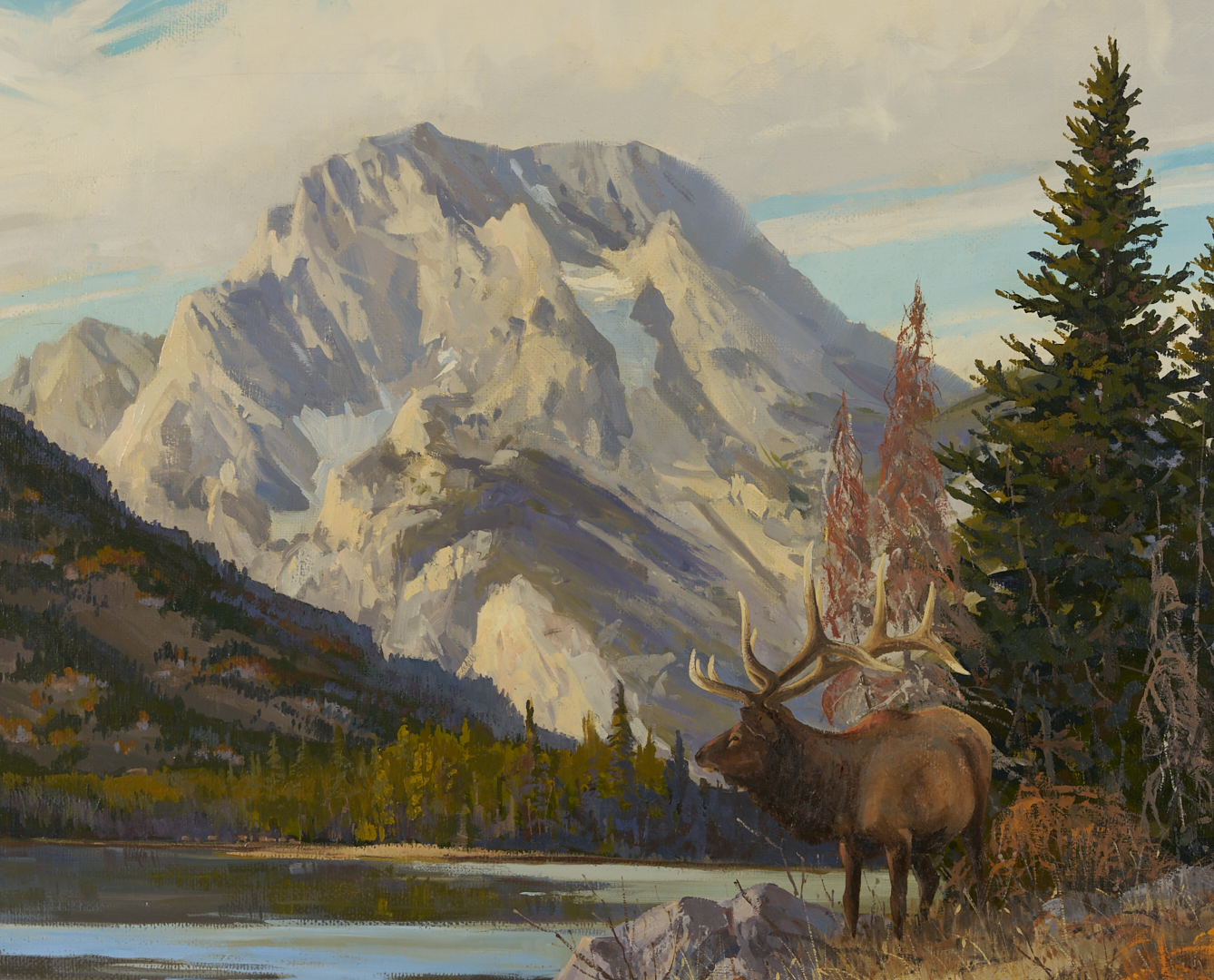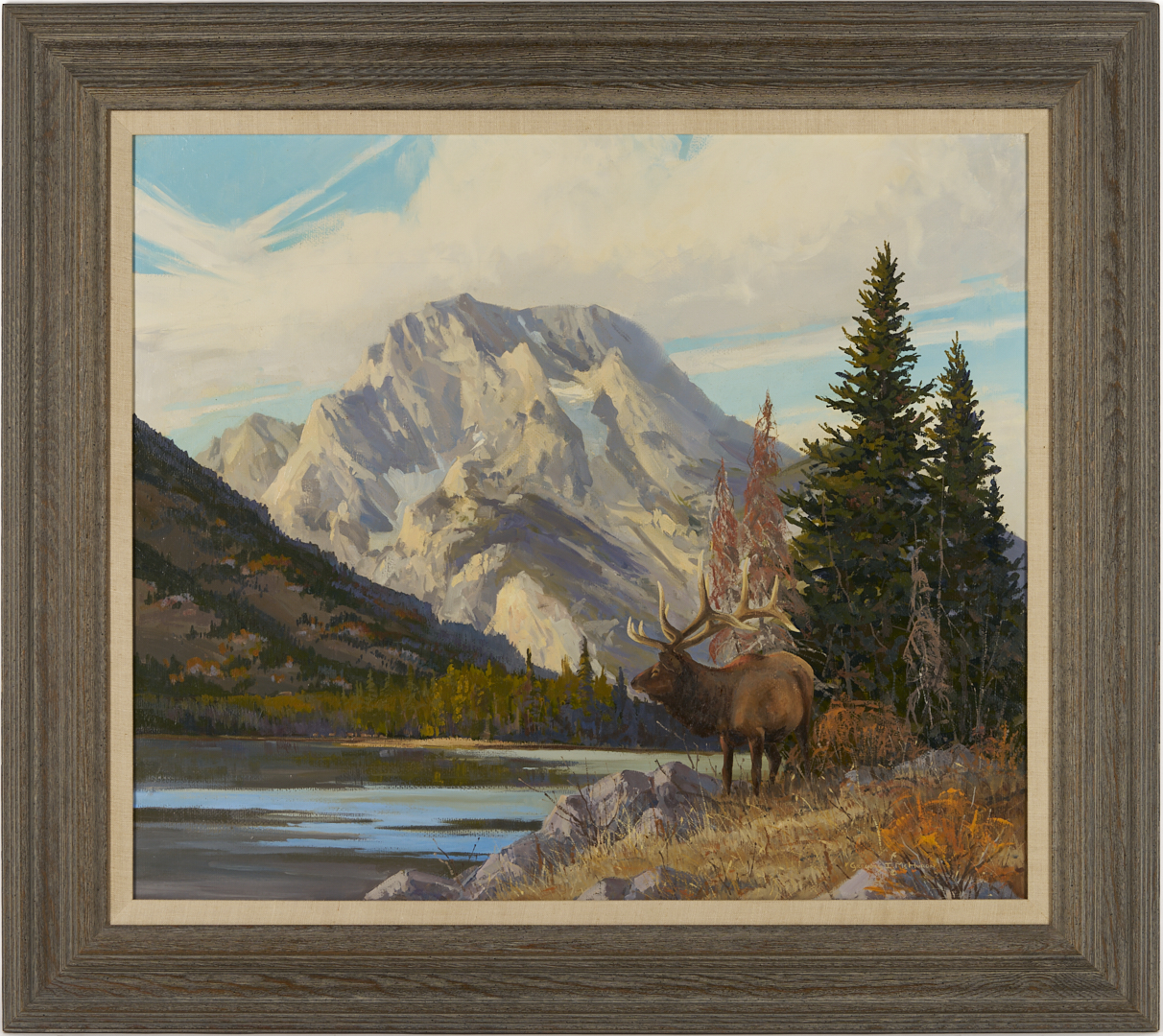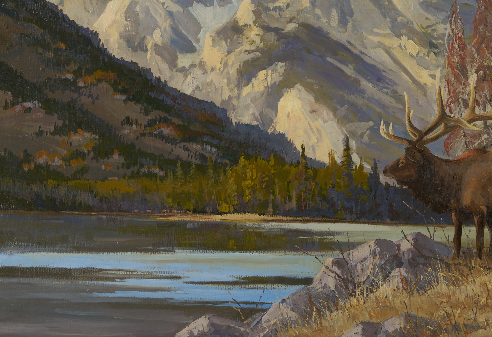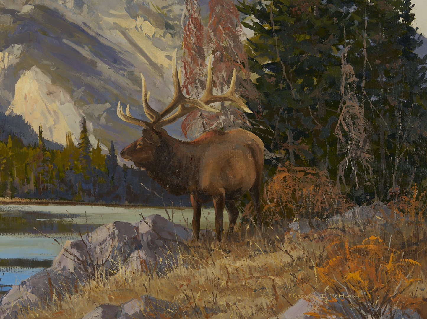 Gregory I. McHuron (American/Wyoming, 1945-2012), “Time to Gather,” oil on canvas landscape painting depicting an elk standing beside a placid body of water. Light illumines mountains rising in the background under a partly cloudy sky. Signed “Gregory I. McHuron” lower right. Housed in a green/gray painted wooden frame with narrow linen mat. Old label en verso containing title. Sight: 23 1/2 H x 27 1/2 W. Frame: 32 in. H x 36 in. W. Biography: Greg McHuron is known for his plein-aire paintings depicting the terrain and wildlife of the American West. He earned a degree in art from Oregon State University and studied extensively with Conrad Schwiering. He was named Wyoming Artist Association-Artist of the Year in 1999 and In January of 2002 he was the Artist In Residence at the National Wildlife Art Museum. McHuron’s work has been profiled in “Wildlife Art News”, “Southwest Art”, and “Art of the West”, and his paintings are in the collections of the National Wildlife Art Museum, Jackson, Wyoming; Bennington Center for The Arts, Bennington, Vermont; Grand Teton National Park, Wyoming; Leighton Foundation, Calgary, Alberta, Canada.