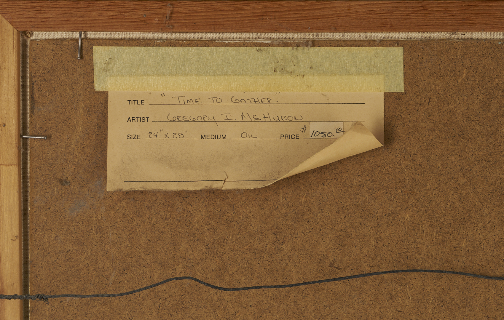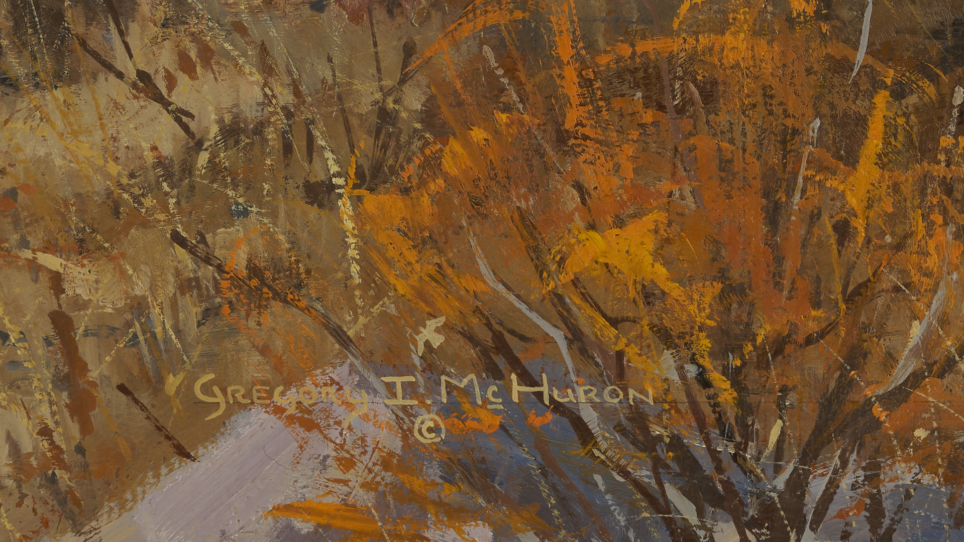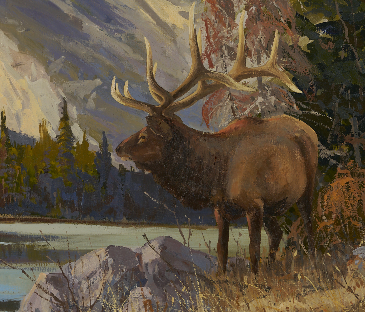Gregory I. McHuron (American/Wyoming, 1945-2012), “Time to Gather,” oil on canvas landscape painting depicting an elk standing beside a placid body of water. Light illumines mountains rising in the background under a partly cloudy sky. Signed “Gregory I. McHuron” lower right. Housed in a green/gray painted wooden frame with narrow linen mat. Old label en verso containing title. Sight: 23 1/2 H x 27 1/2 W. Frame: 32 in. H x 36 in. W. Biography: Greg McHuron is known for his plein-aire paintings depicting the terrain and wildlife of the American West. He earned a degree in art from Oregon State University and studied extensively with Conrad Schwiering. He was named Wyoming Artist Association-Artist of the Year in 1999 and In January of 2002 he was the Artist In Residence at the National Wildlife Art Museum. McHuron’s work has been profiled in “Wildlife Art News”, “Southwest Art”, and “Art of the West”, and his paintings are in the collections of the National Wildlife Art Museum, Jackson, Wyoming; Bennington Center for The Arts, Bennington, Vermont; Grand Teton National Park, Wyoming; Leighton Foundation, Calgary, Alberta, Canada.