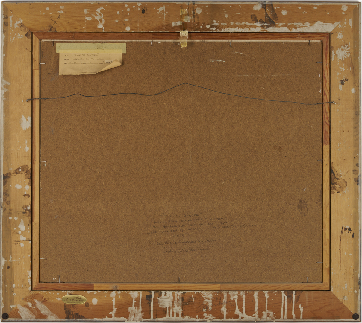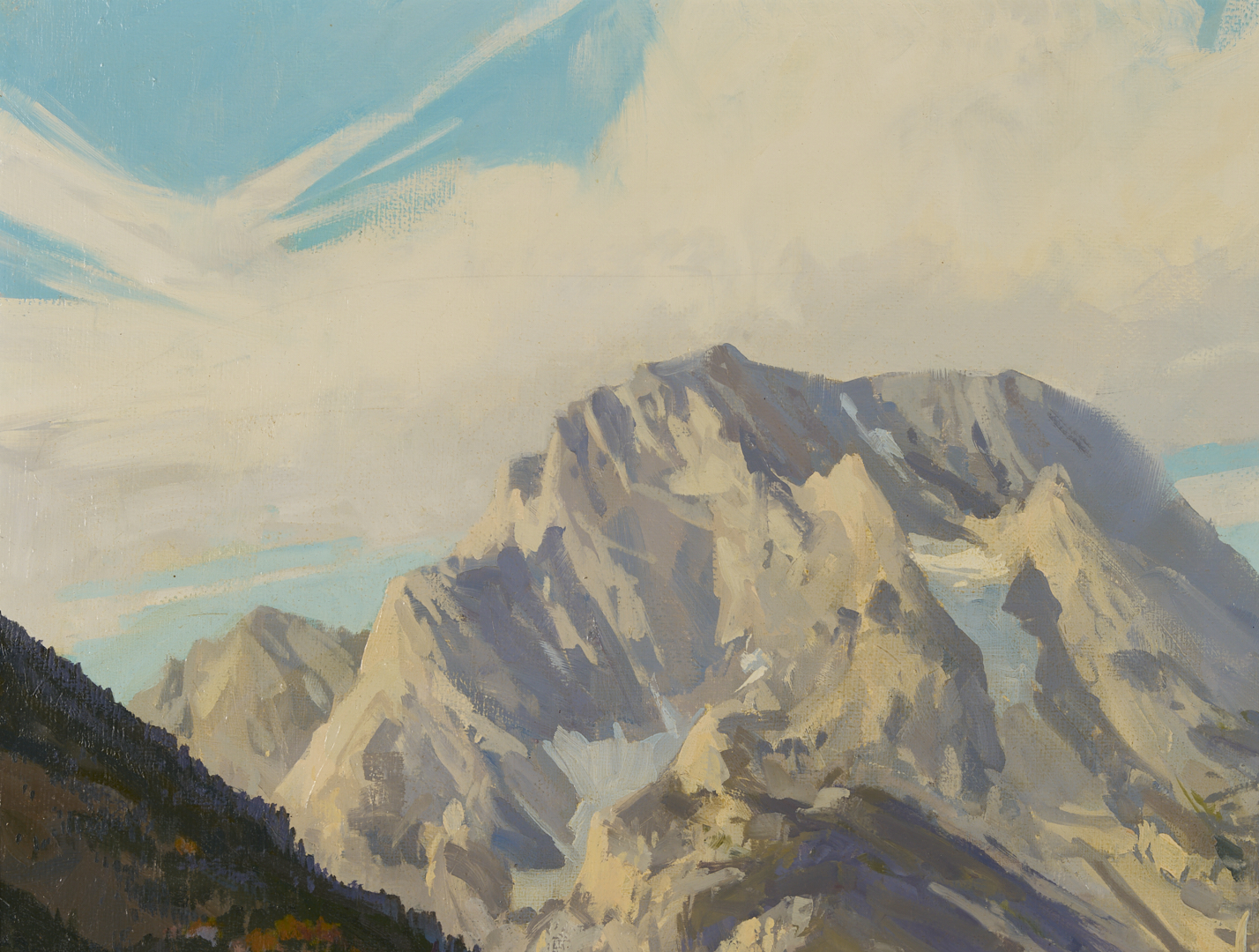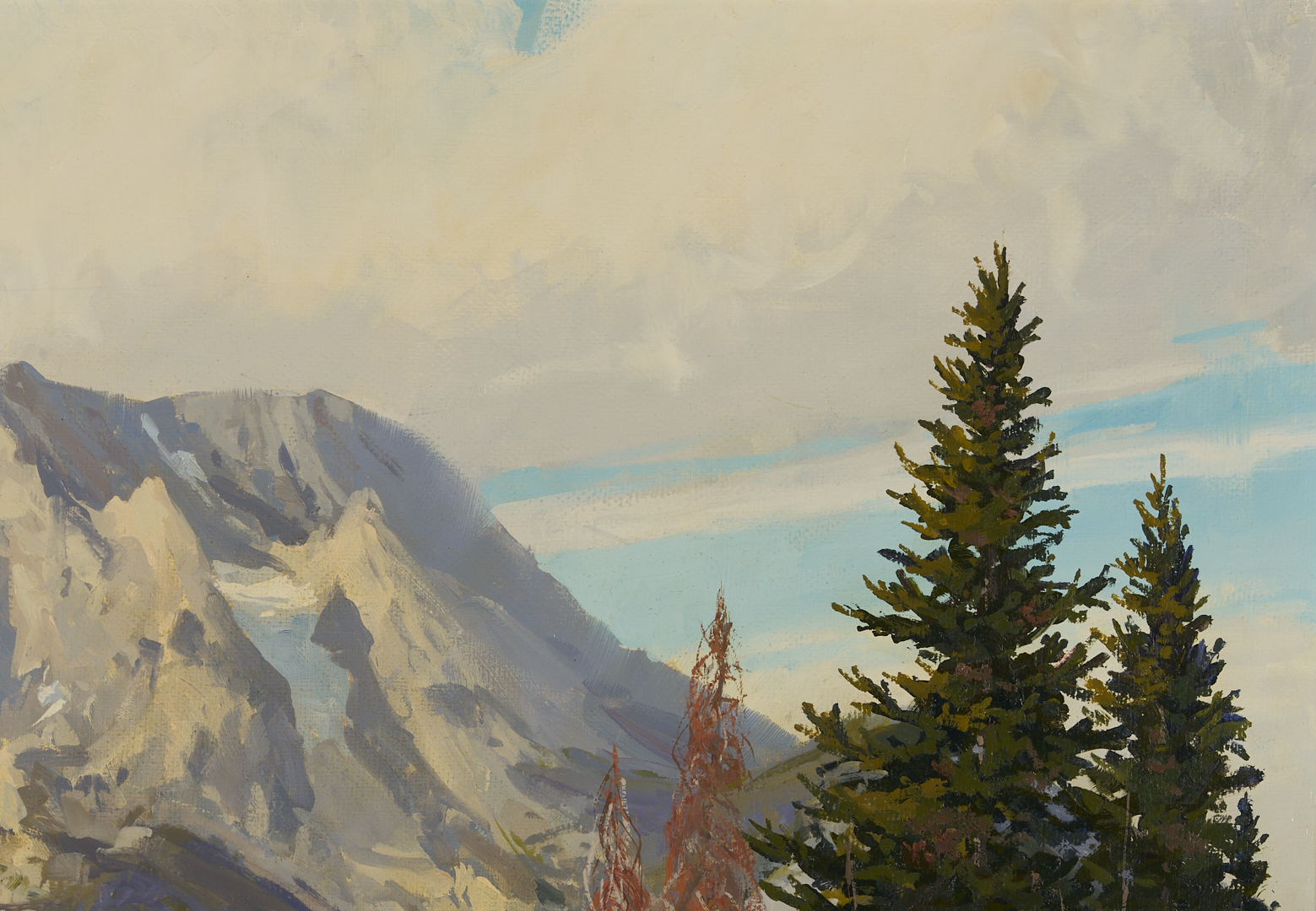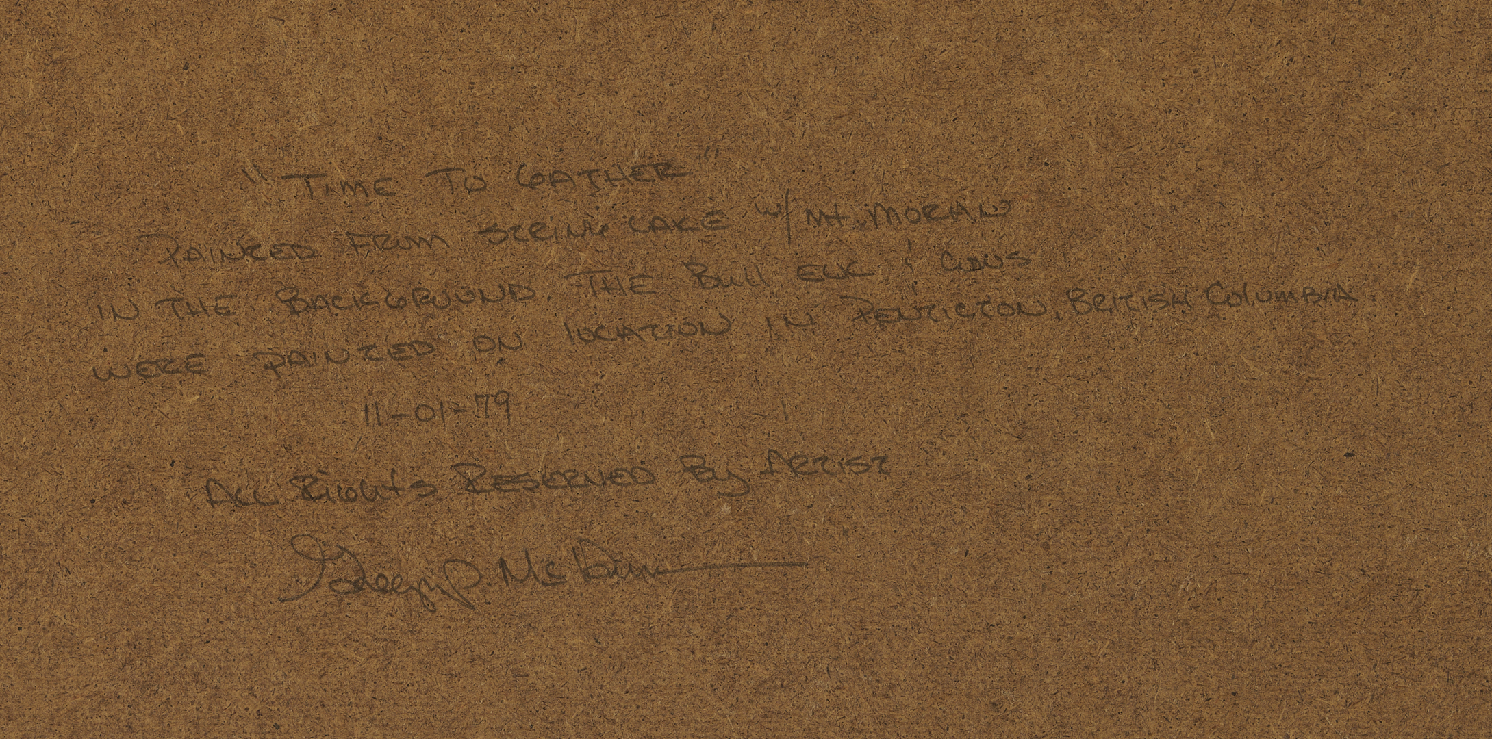 Gregory I. McHuron (American/Wyoming, 1945-2012), “Time to Gather,” oil on canvas landscape painting depicting an elk standing beside a placid body of water. Light illumines mountains rising in the background under a partly cloudy sky. Signed “Gregory I. McHuron” lower right. Housed in a green/gray painted wooden frame with narrow linen mat. Old label en verso containing title. Sight: 23 1/2 H x 27 1/2 W. Frame: 32 in. H x 36 in. W. Biography: Greg McHuron is known for his plein-aire paintings depicting the terrain and wildlife of the American West. He earned a degree in art from Oregon State University and studied extensively with Conrad Schwiering. He was named Wyoming Artist Association-Artist of the Year in 1999 and In January of 2002 he was the Artist In Residence at the National Wildlife Art Museum. McHuron’s work has been profiled in “Wildlife Art News”, “Southwest Art”, and “Art of the West”, and his paintings are in the collections of the National Wildlife Art Museum, Jackson, Wyoming; Bennington Center for The Arts, Bennington, Vermont; Grand Teton National Park, Wyoming; Leighton Foundation, Calgary, Alberta, Canada.