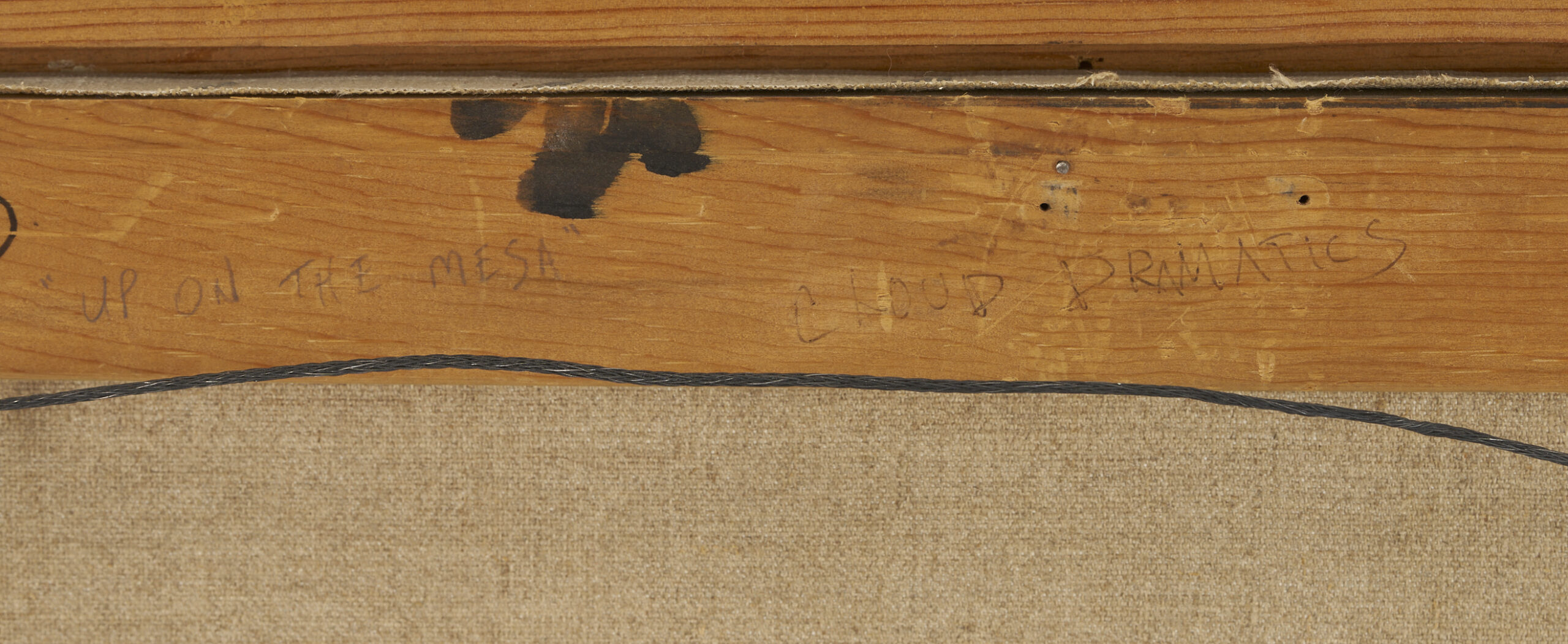 Harold L. Hopkinson (American, 1918-2000) oil on canvas Western landscape titled “Up on the Mesa: Cloud Dramatics,” depicting a cowboy on horseback peering down over a valley as storm clouds form overhead. Signed lower right. Titled and dated 1974 en verso, with artist stamps. Weathered wood frame with beige linen mat and gilt fillet. Sight: 19 1/2 in. W x 15 1/2 in. H. Frame: 28 in. W x 24 in. H.