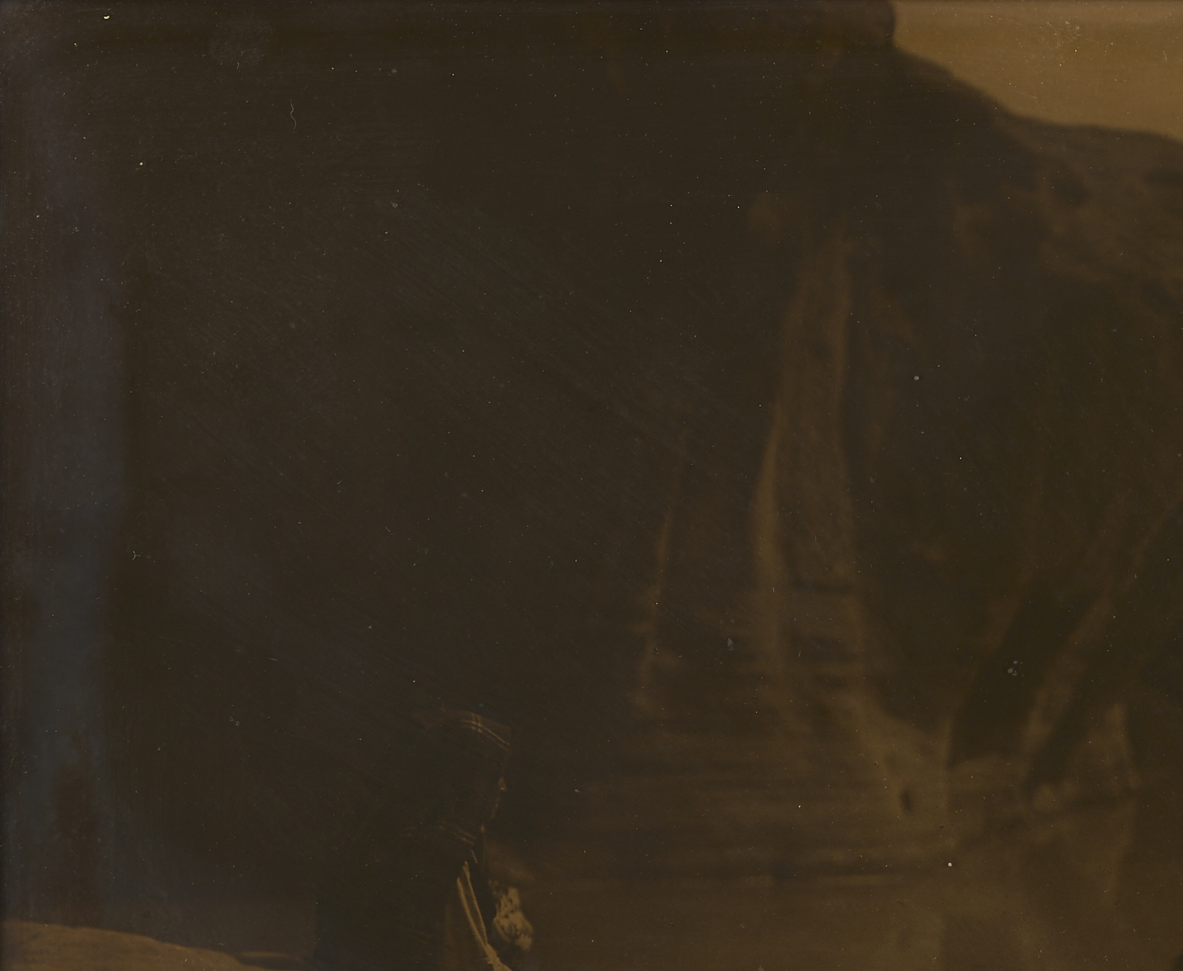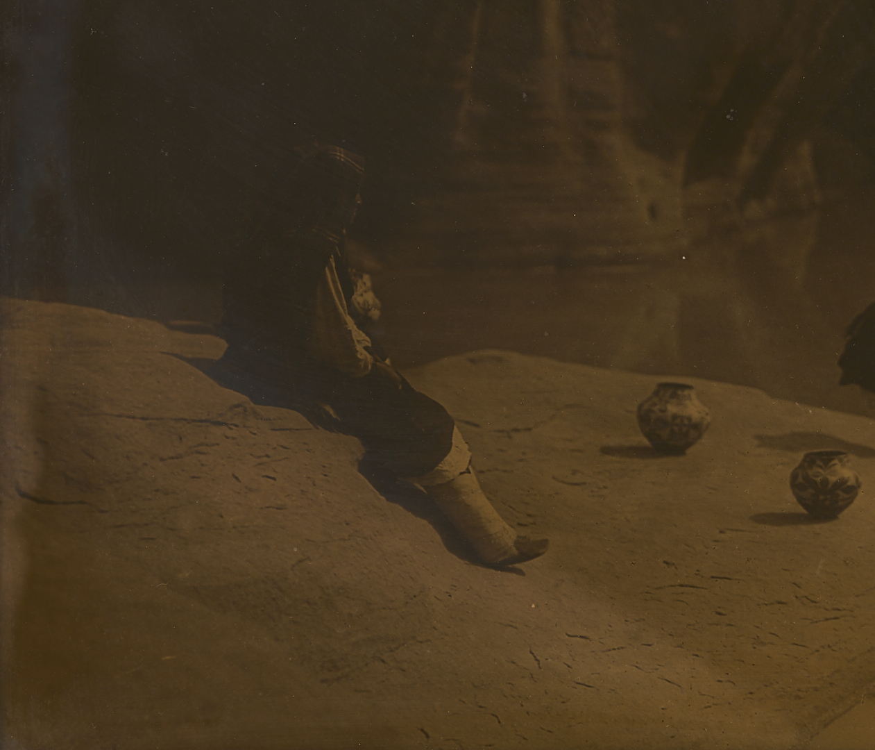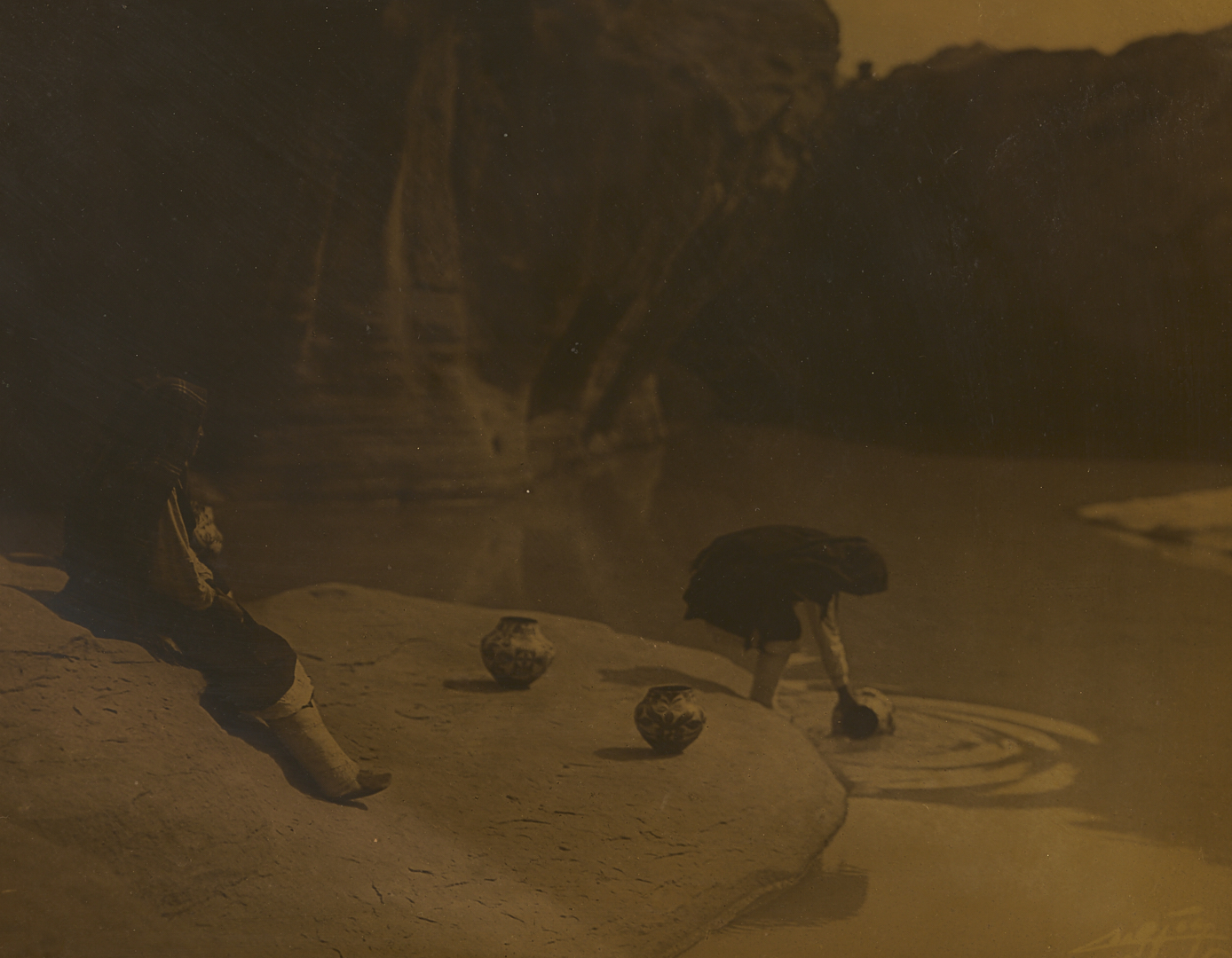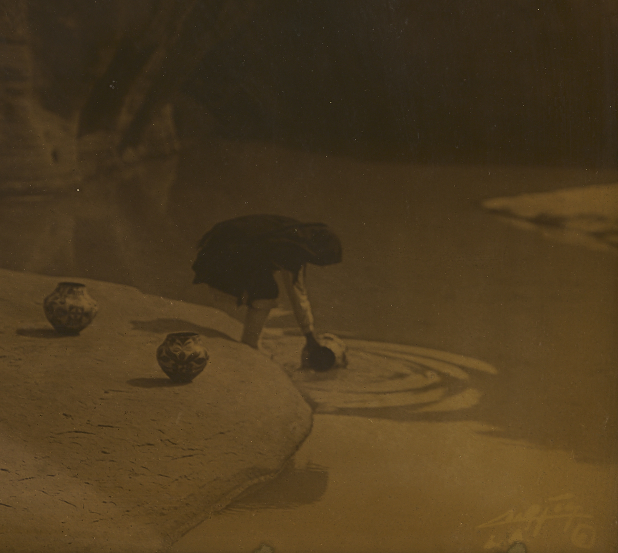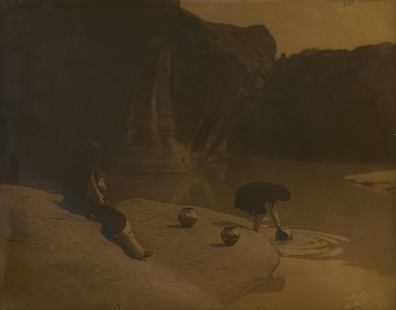 Edward S. Curtis (American, 1868-1952), “At the Old Well of Acoma,” gold tone AKA Curt-Tone photograph on glass. An Acoma Pueblo, New Mexico, woman or girl sits on a rock and watches as a second figure dips a pottery vessel into a body of water, with rocky cliffs beyond. Signed and with Los Angeles (“LA”) copyright insignia lower right. Housed in the original Curtis-designed “batwing” frame. Glass: 11 in. H x 14 in. W. Frame: 15 in. H x 18 3/4 in W. Negative date 1904. Note: This image was reproduced in “The North American Indian 1907-1930,” portfolio 16, p. 571. Curtis’s original caption in that publication reads: “Members of Coronado’s army of explorers in 1540 and Espejo in 1583 noted the ‘cisterns to collect snow and water’ on the rock of Acoma.”