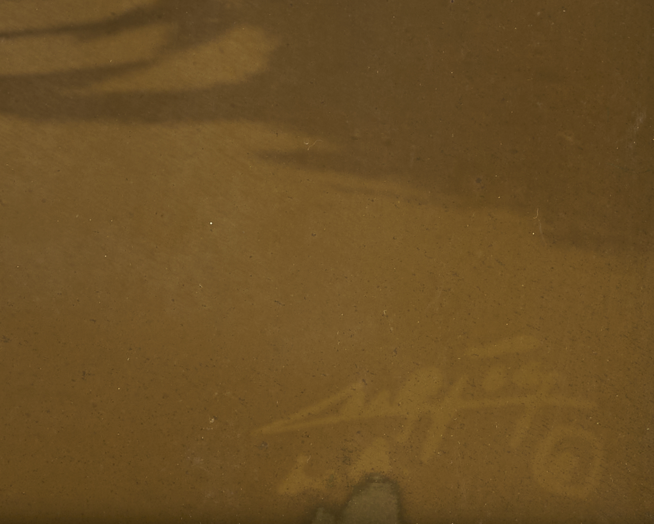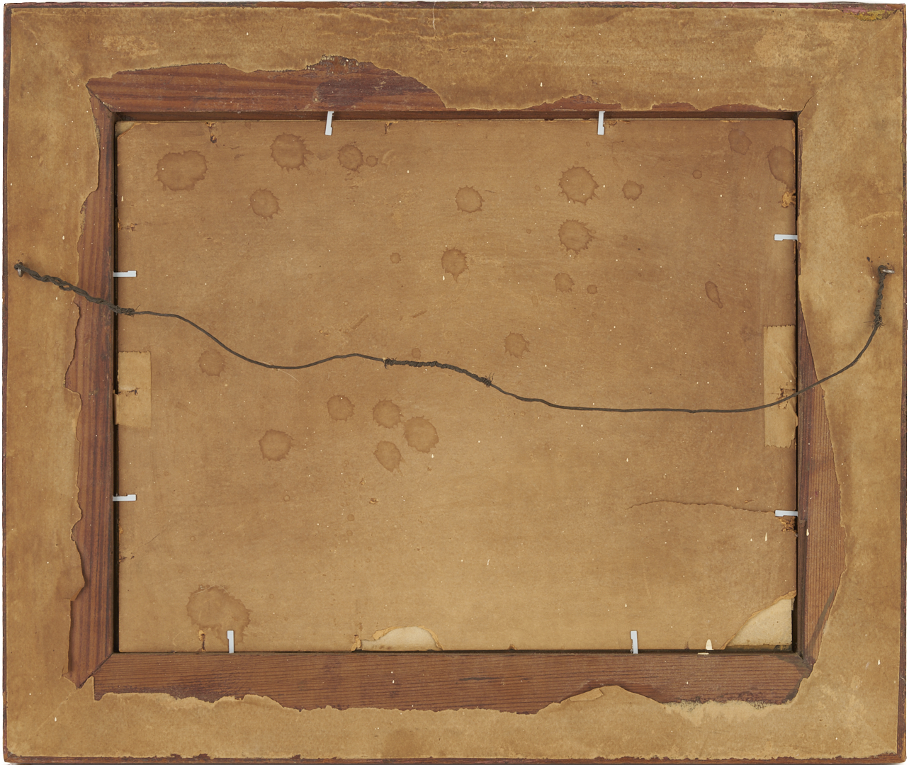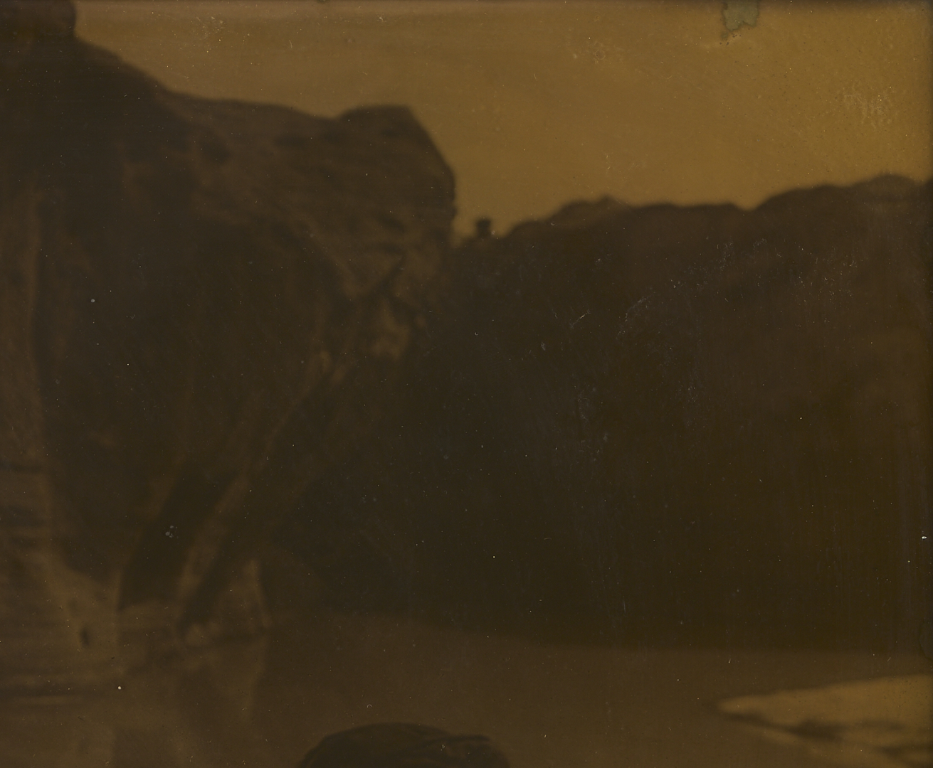 Orotone with minor abrasions with losses to edges, largest to lower left, 3/4 inch x 1/2 inch, plus fogginess along left edge that extends 1-inch into image. Minor cracking to frame, primarily to the corners, plus white pigment spatter along upper edge, primarily visible from above.