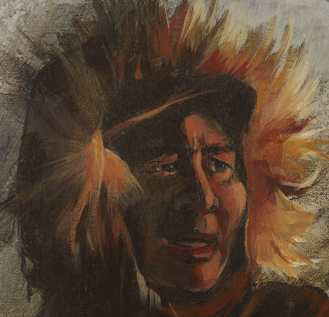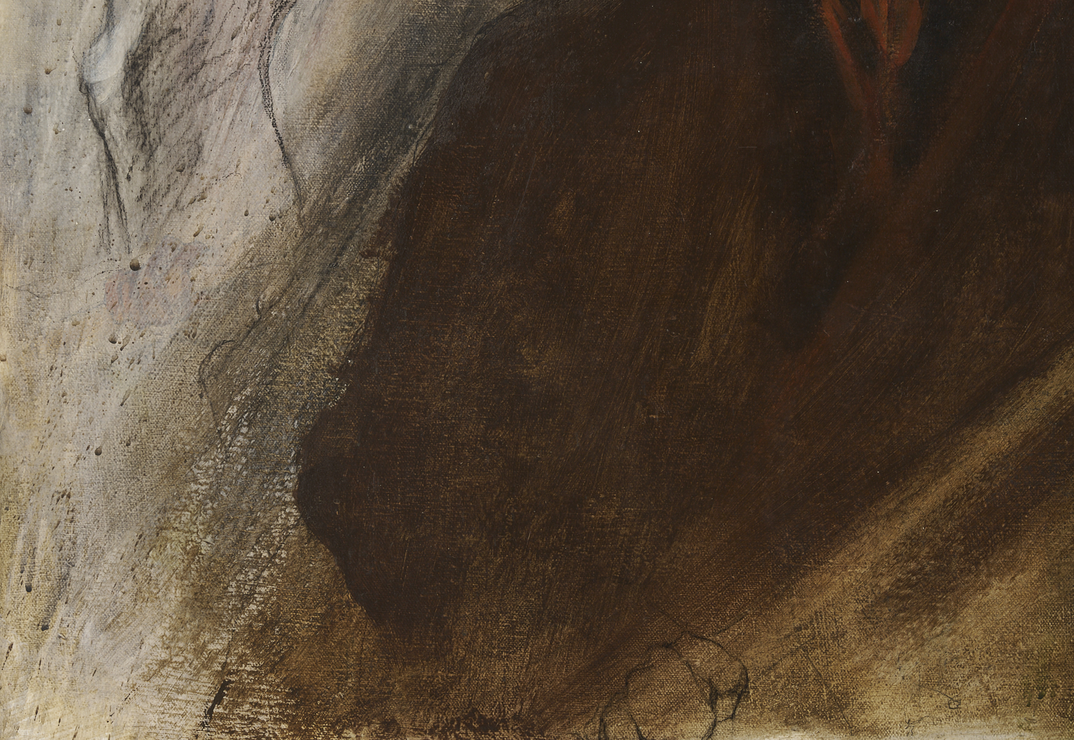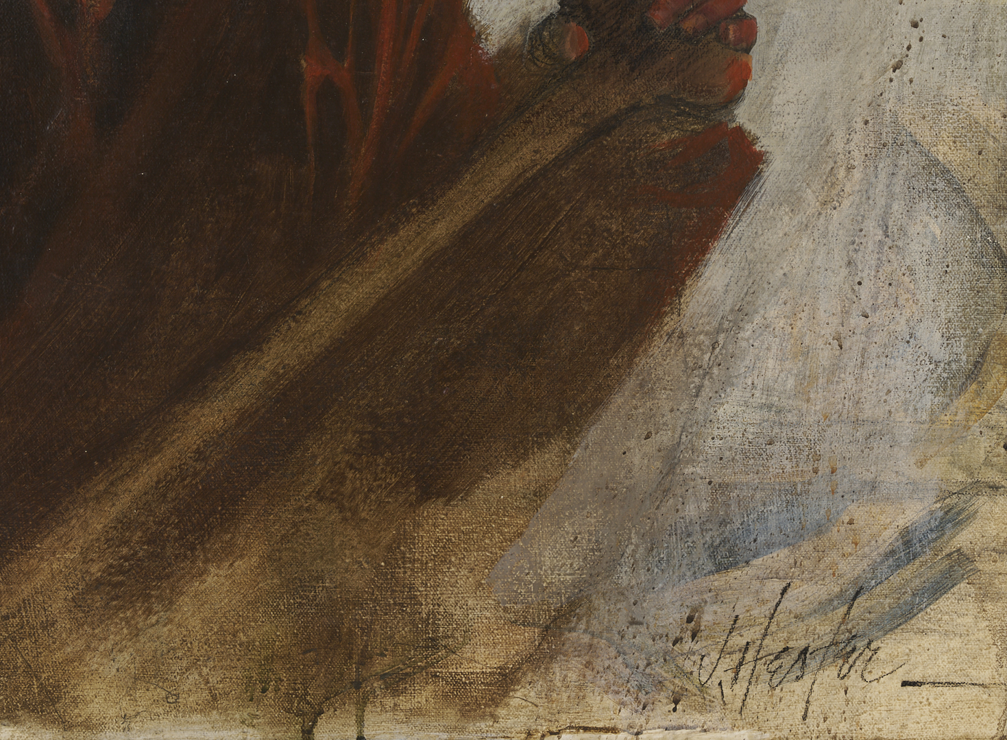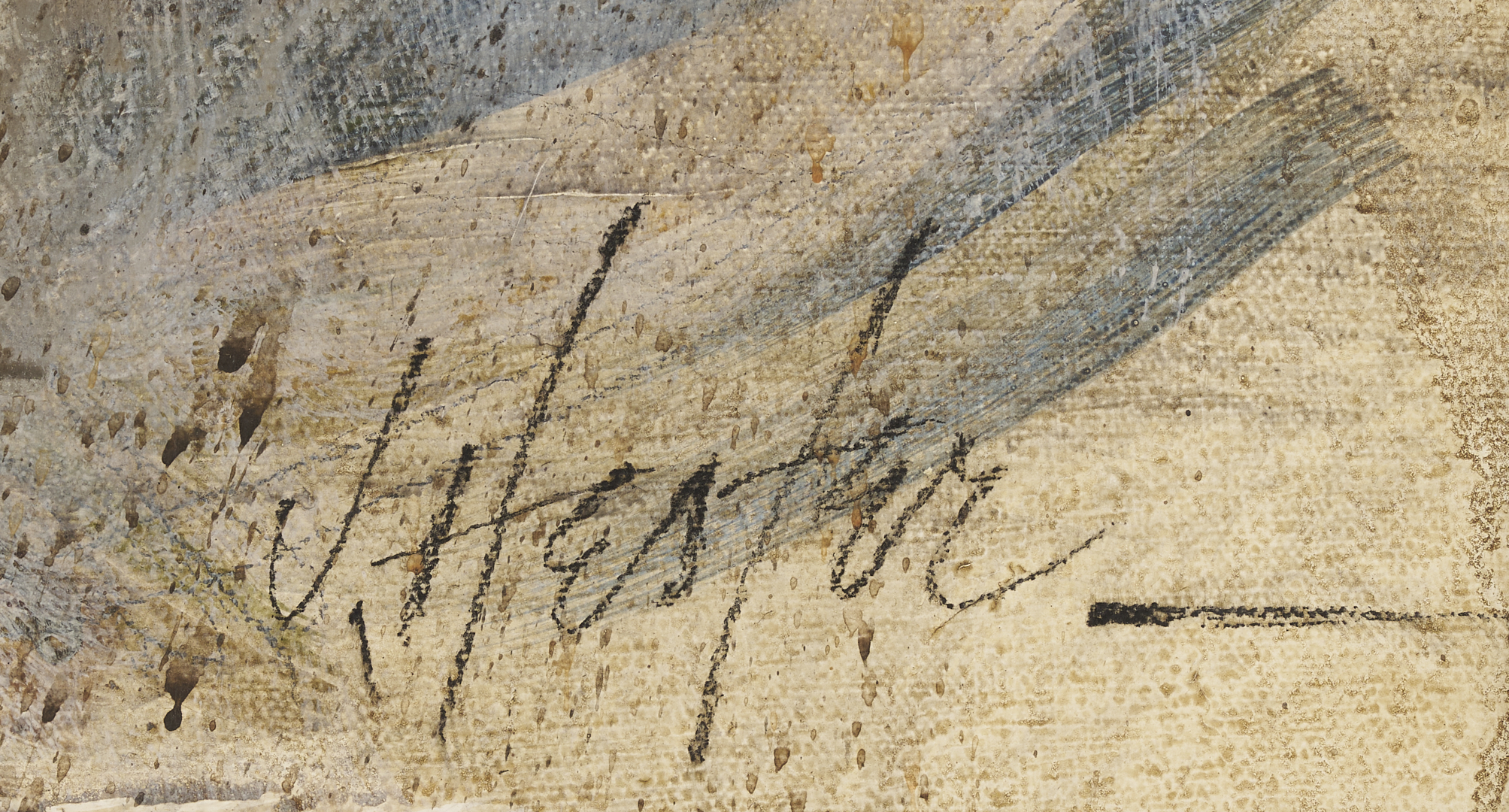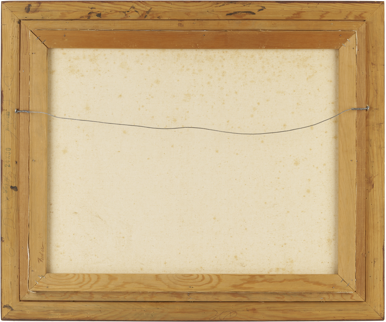 The painting exhibits several watery splatter stains throughout, although these may be part of the artist’s technique. Some minor abrasions to frame.