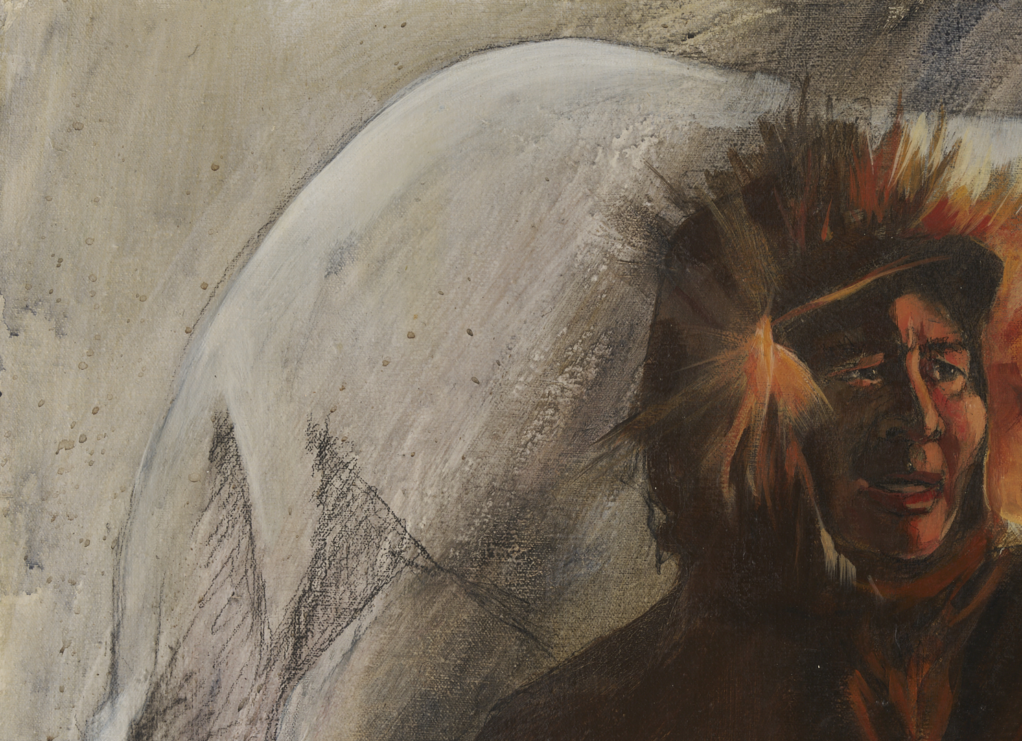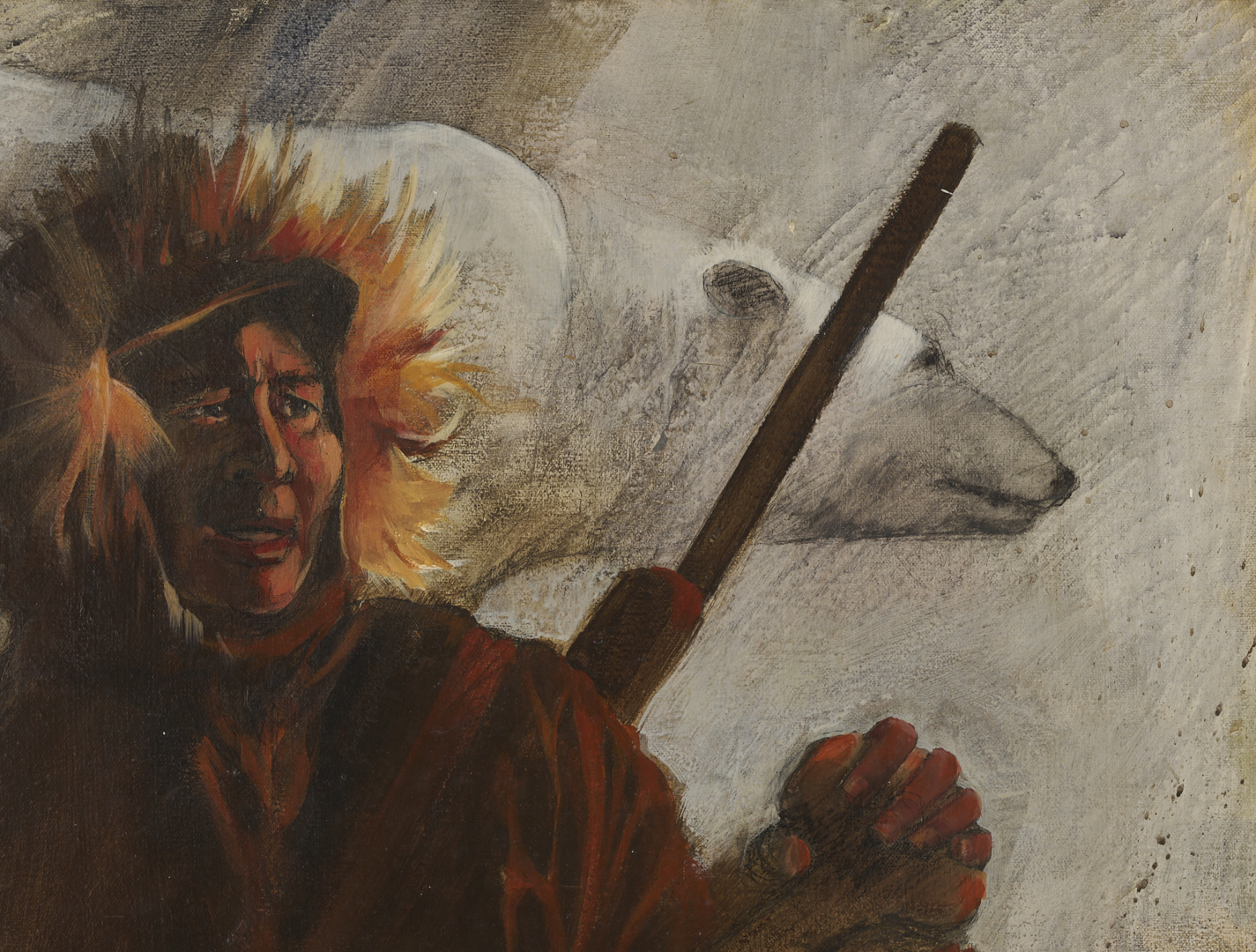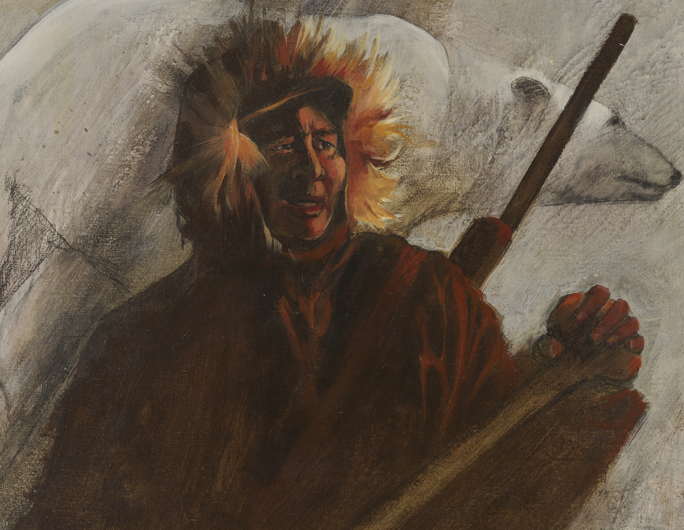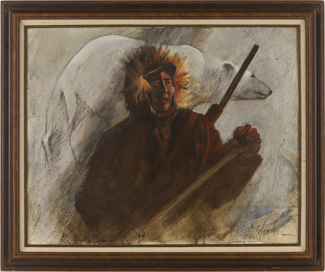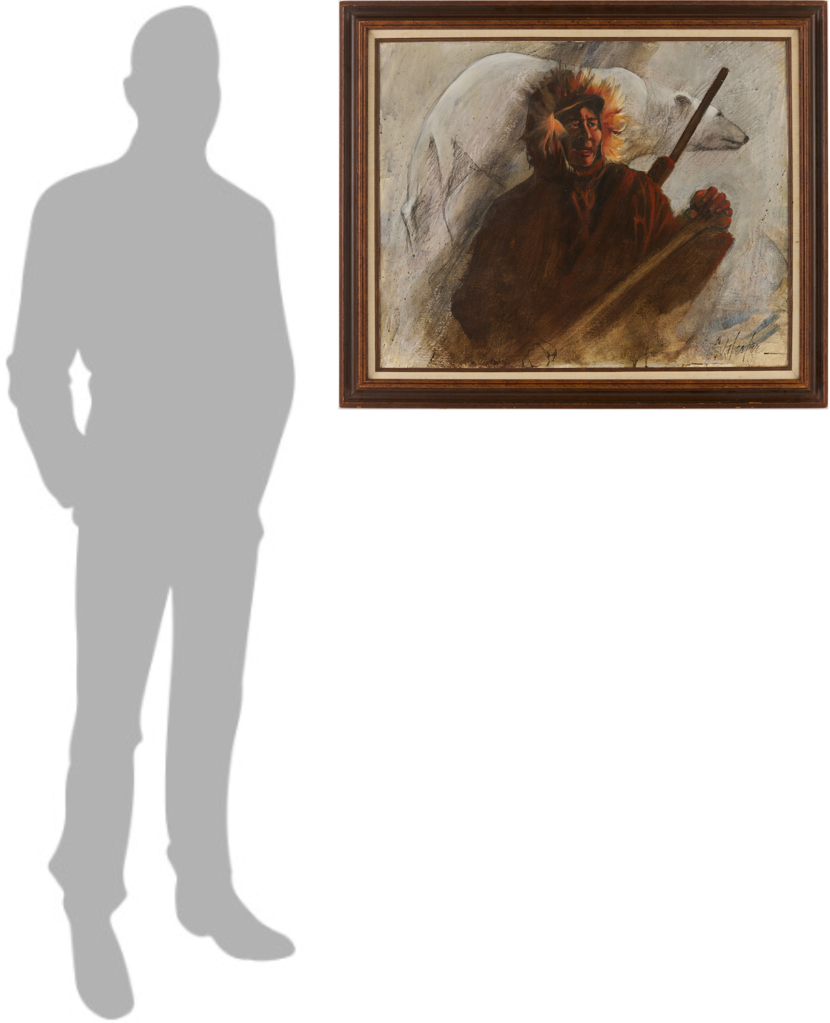 Jay Hester (American, b. 1940) oil on canvas painting depicting a Native American hunter before a polar bear. Signed lower right and housed in a molded wood frame. Stretcher: 24 in. H x 30 in. W. Frame: 29 in. H x 36 in. W. Biography: Jay Hester was born in Louisville, KY and grew up in Birmingham. After graduating from Samford University, Jay studied at the Art Center College of Design in Los Angeles. He worked as an illustrator for Lockheed Aircraft before deciding to pursue a full time art career. Lured by the appeal of Native American culture and the Southwest, he moved to Santa Fe in 1980. He studied with Howard Terpning and undertook research trips to enable him to authentically depict his subjects. Hester finally settled in Texas, where he produced commissioned paintings for Texas Tech University and Methodist Hospital in Lubbock, the Zaragosa Theater at Six Flags Fiesta Texas, USAA in San Antonio, as well as many other public collections. His work has also earned honors and awards at several national juried exhibitions.