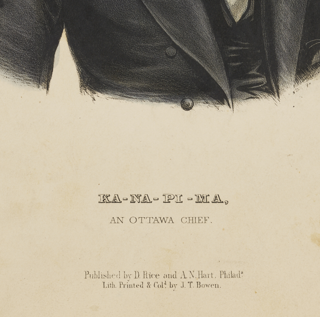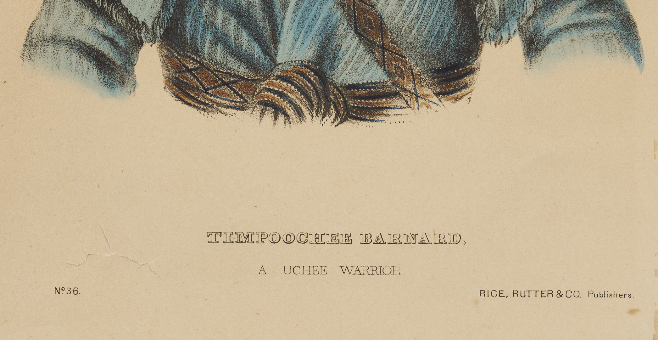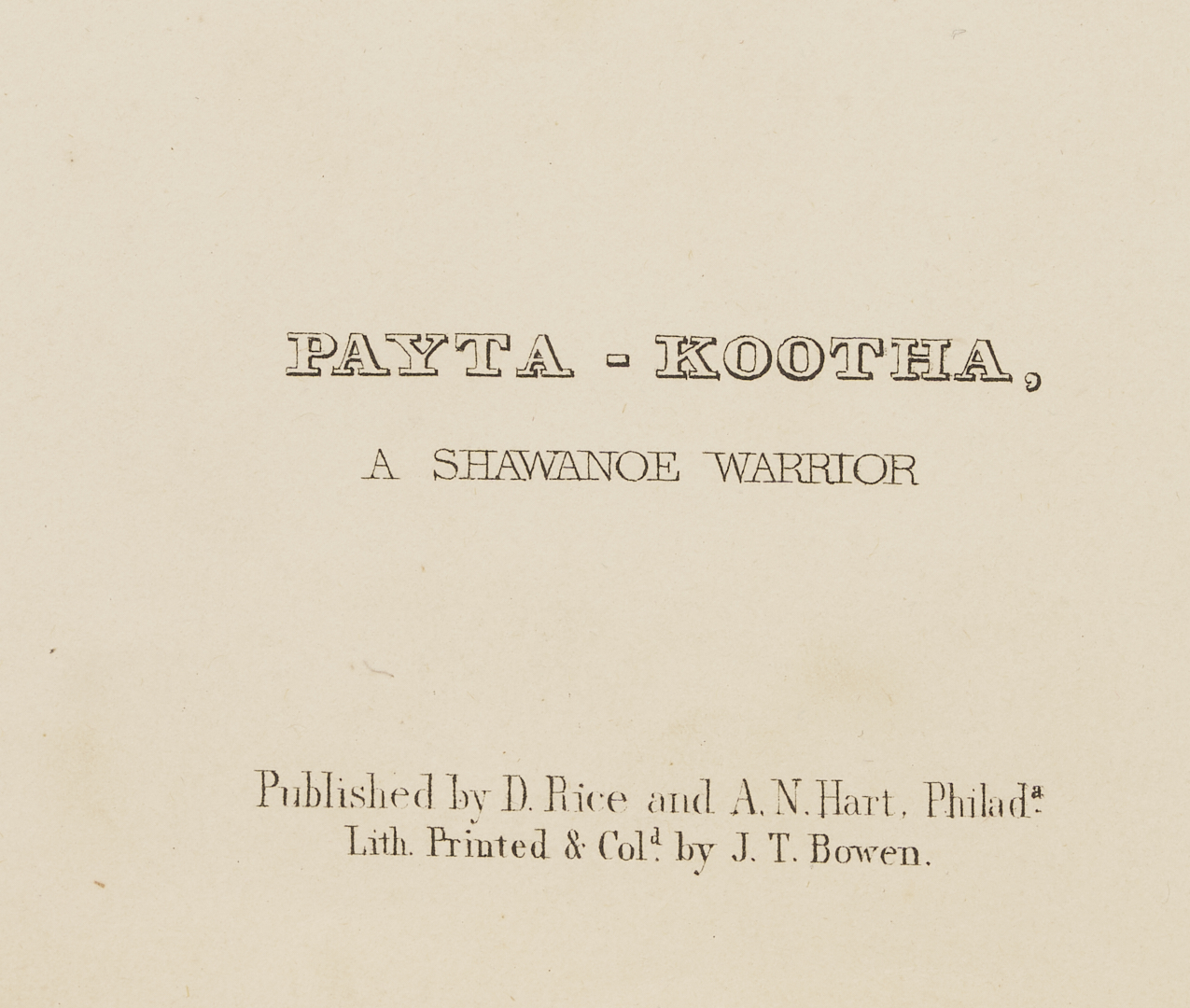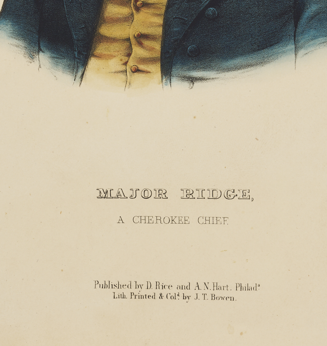 “Payta-Kootha” and “Ka-Na-Pi-Ma” with possible retouch or overpaint to faces. “Ka-Na-Pi-Ma” also with soiling to sheet outside of image and 1/2 inch tear without loss to left edge. “Payta-Kootha” also with 1/4 inch tear without loss to right edge. “Timpoochee Barnard” with toning to sheet and tear without loss to 1 inch x 1/4 inch area at lower left, outside of image, plus negligible adhesive residue to right edge. “Major Ridge” with adhesive residue to right edge and a few spots of soiling outside of image. “John Ross” with adhesive residue to left edge. All D. Rice and A.N. Hart prints with negligible foxing. Some with minor handling wear to edges.