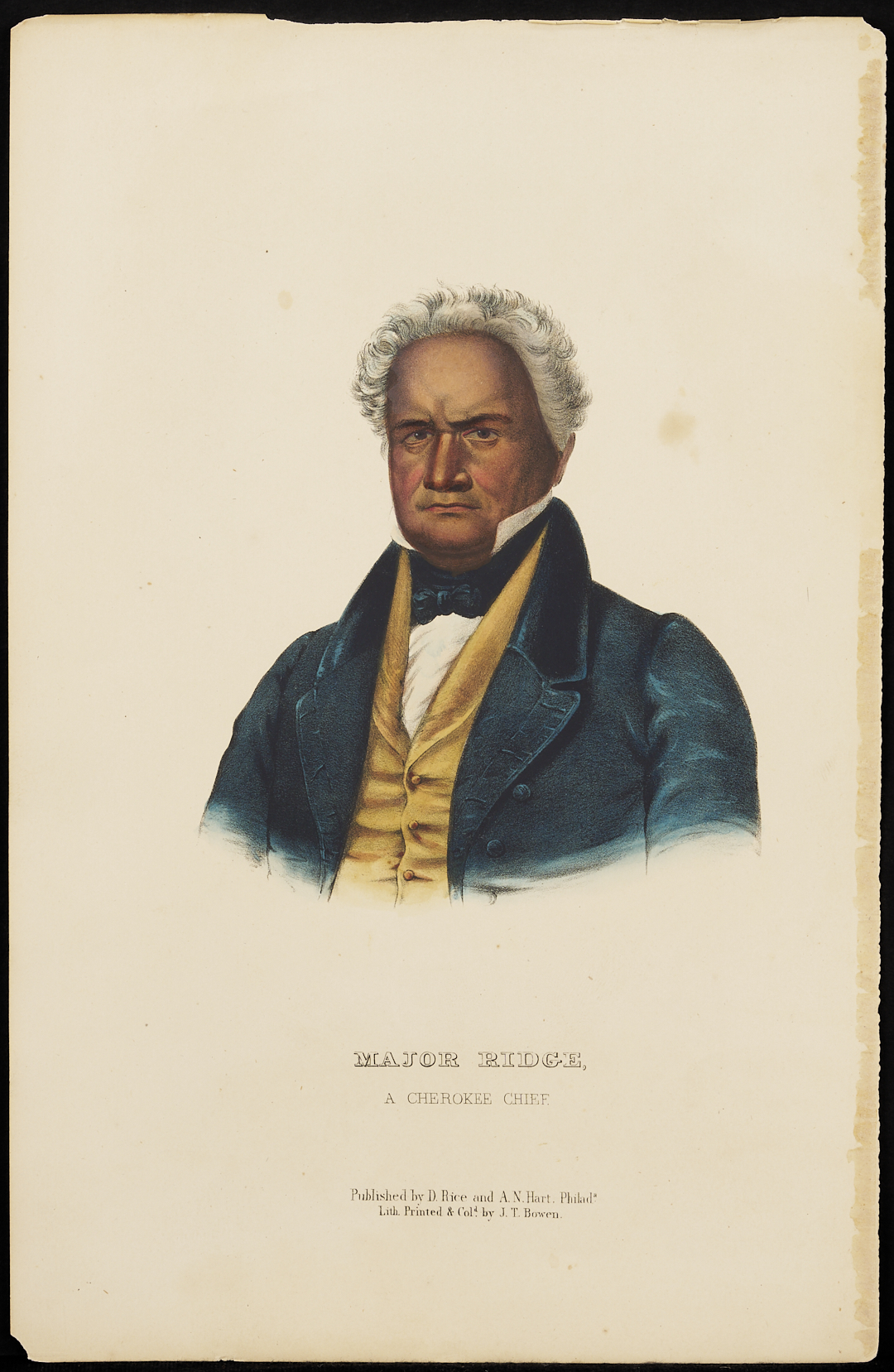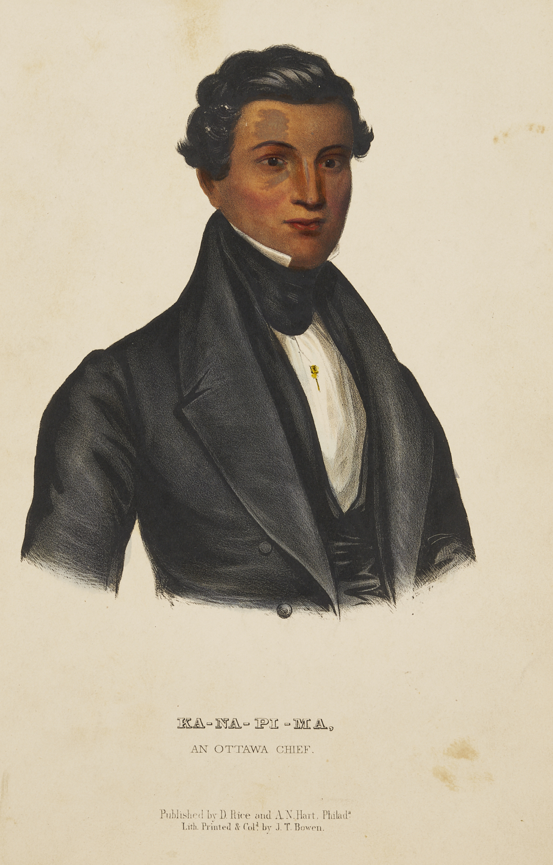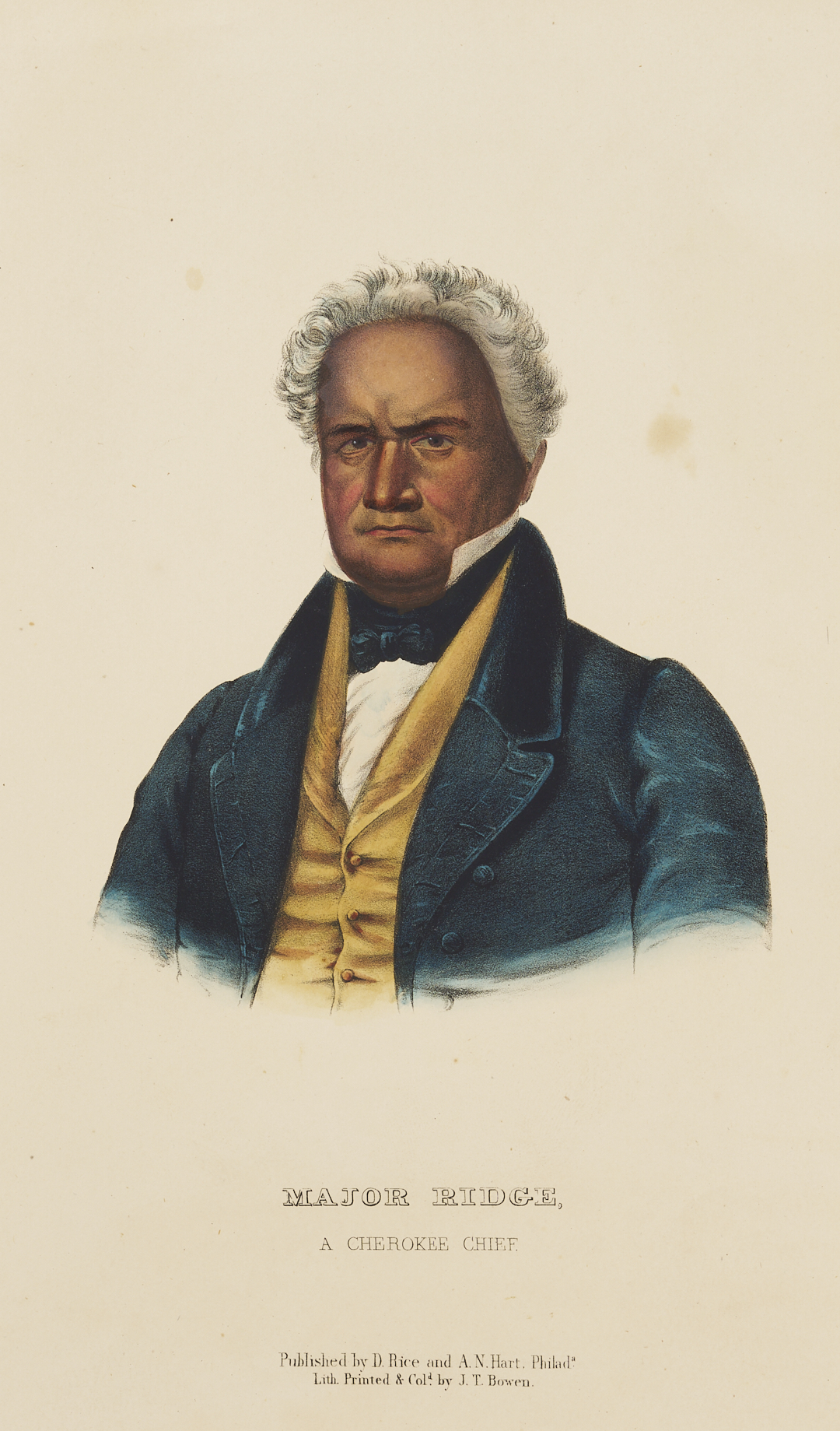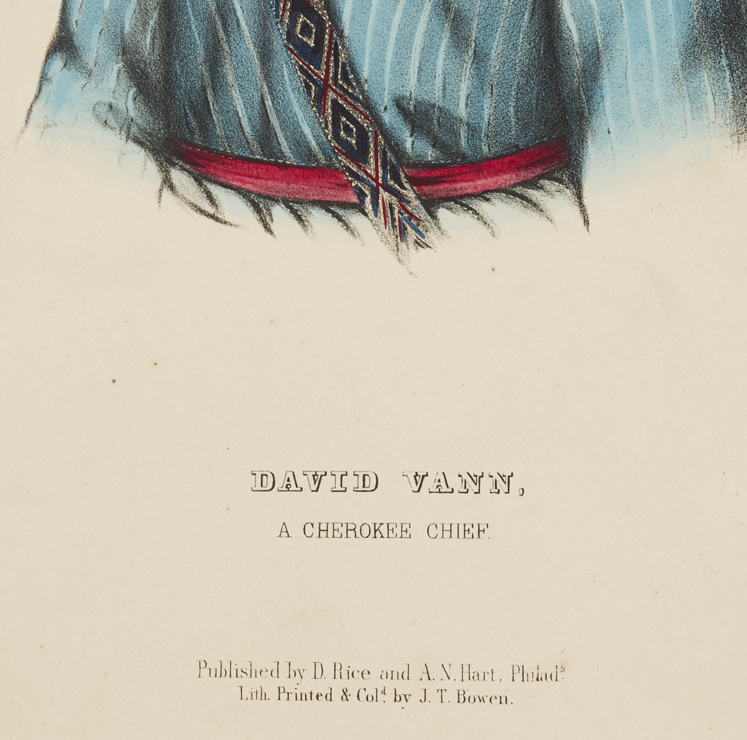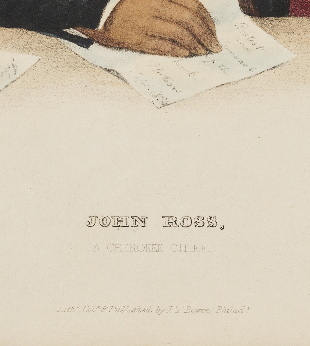 “Payta-Kootha” and “Ka-Na-Pi-Ma” with possible retouch or overpaint to faces. “Ka-Na-Pi-Ma” also with soiling to sheet outside of image and 1/2 inch tear without loss to left edge. “Payta-Kootha” also with 1/4 inch tear without loss to right edge. “Timpoochee Barnard” with toning to sheet and tear without loss to 1 inch x 1/4 inch area at lower left, outside of image, plus negligible adhesive residue to right edge. “Major Ridge” with adhesive residue to right edge and a few spots of soiling outside of image. “John Ross” with adhesive residue to left edge. All D. Rice and A.N. Hart prints with negligible foxing. Some with minor handling wear to edges.