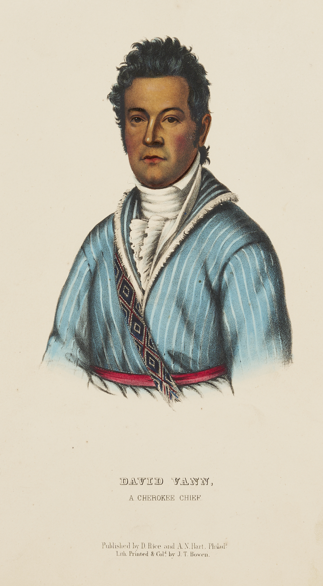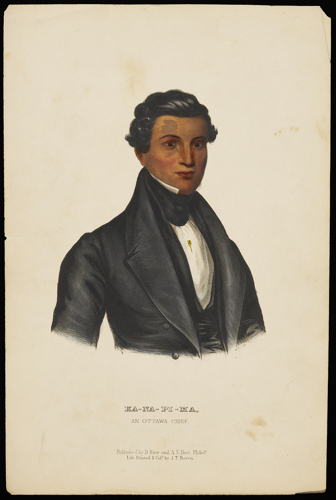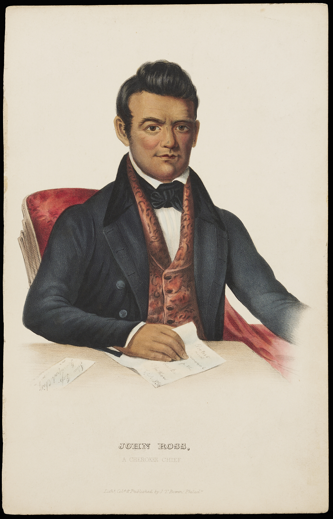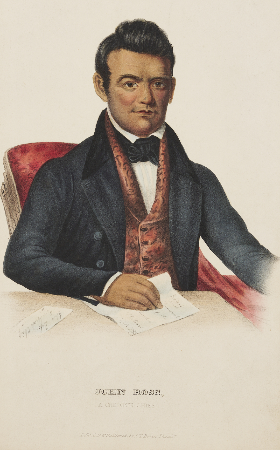 “Payta-Kootha” and “Ka-Na-Pi-Ma” with possible retouch or overpaint to faces. “Ka-Na-Pi-Ma” also with soiling to sheet outside of image and 1/2 inch tear without loss to left edge. “Payta-Kootha” also with 1/4 inch tear without loss to right edge. “Timpoochee Barnard” with toning to sheet and tear without loss to 1 inch x 1/4 inch area at lower left, outside of image, plus negligible adhesive residue to right edge. “Major Ridge” with adhesive residue to right edge and a few spots of soiling outside of image. “John Ross” with adhesive residue to left edge. All D. Rice and A.N. Hart prints with negligible foxing. Some with minor handling wear to edges.