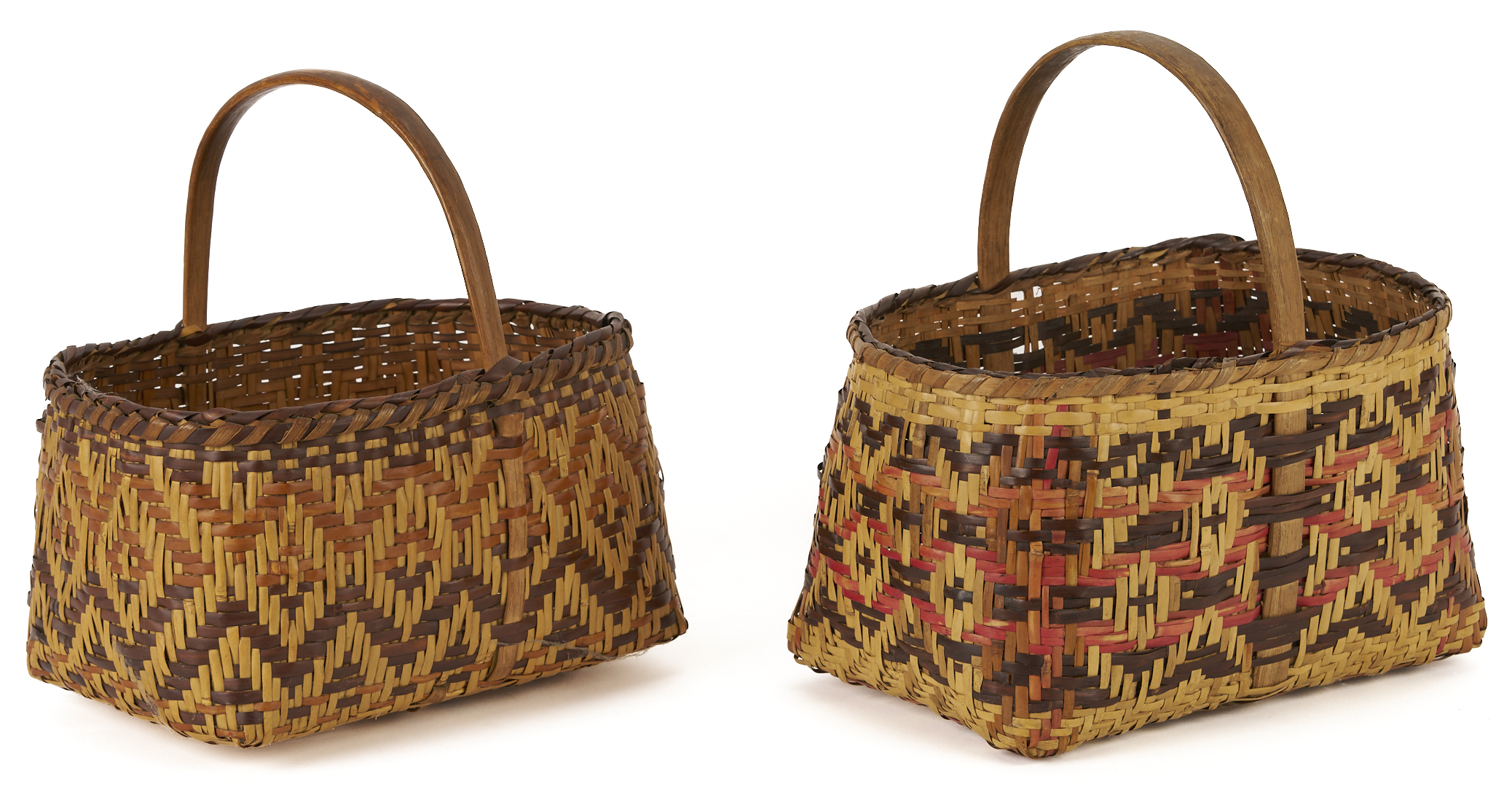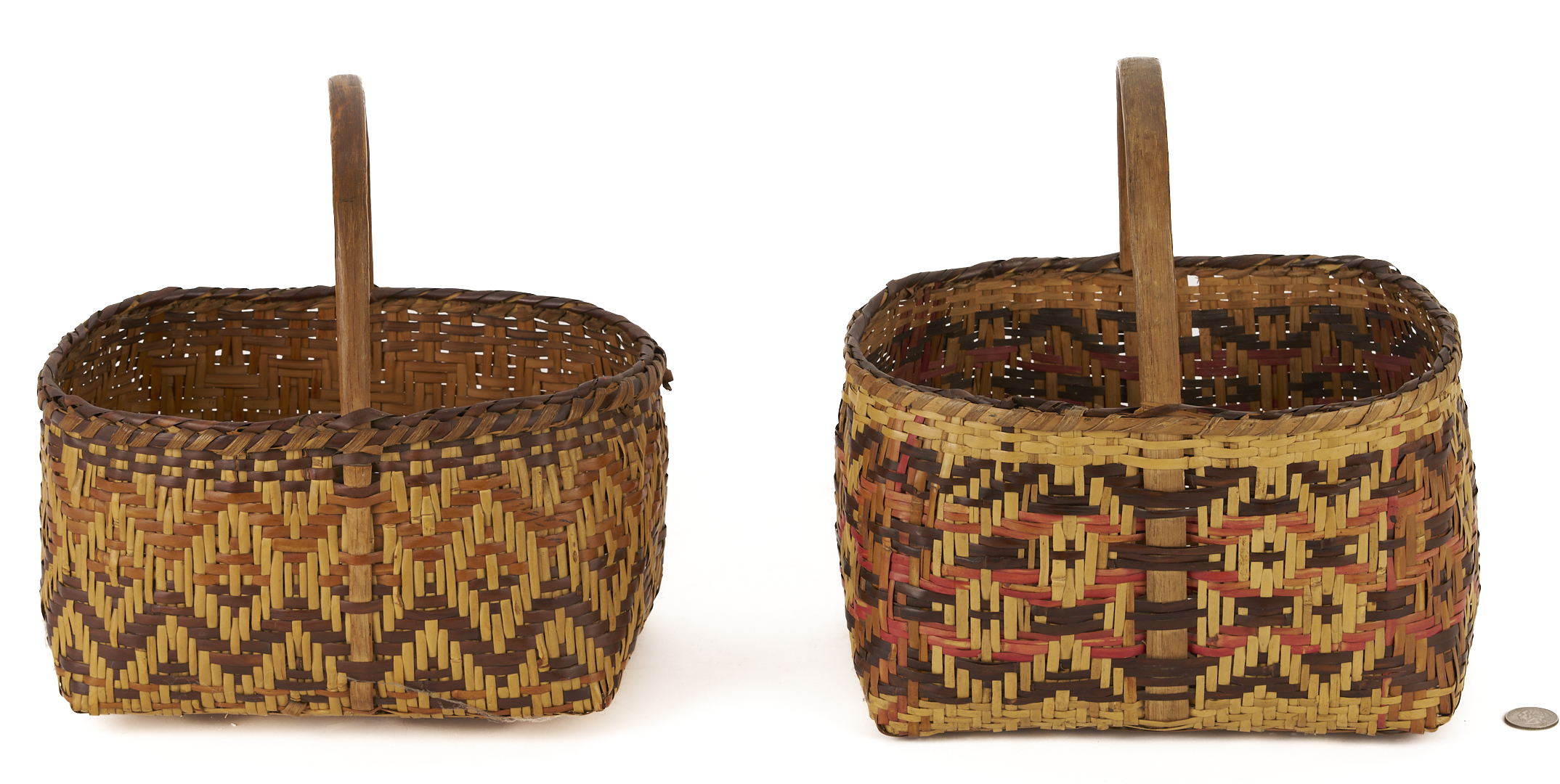 Two (2) Native American Cherokee rivercane market baskets, both woven in the Chief’s Daughter pattern, one with butternut and walnut weavers and one with bloodroot, walnut, and butternut weavers. 11 in. H x 10 1/2 in. W and 11 3/4 in. H x 10 1/2 in. W. Early 20th century.