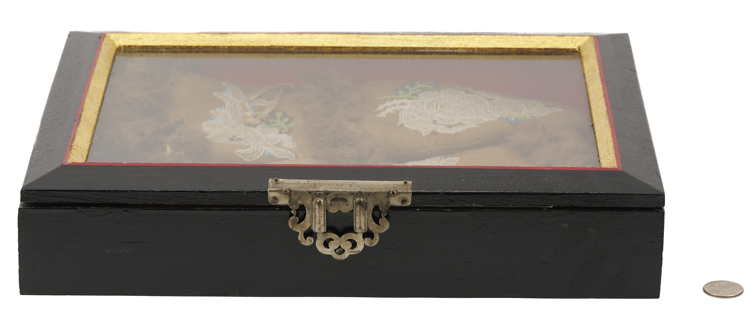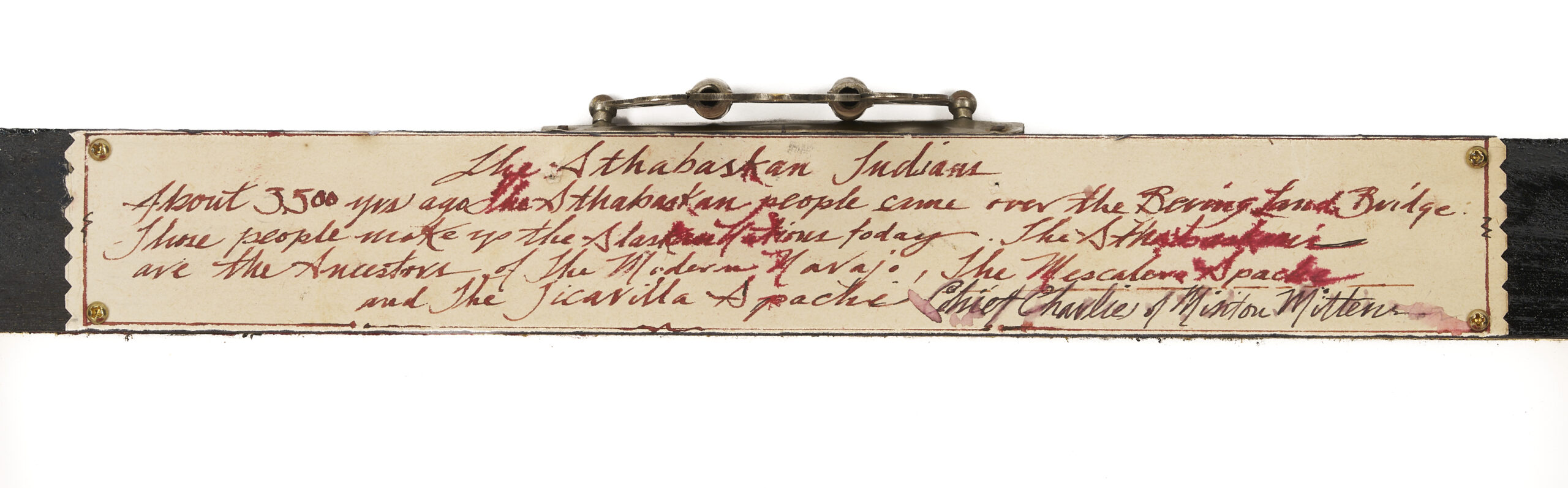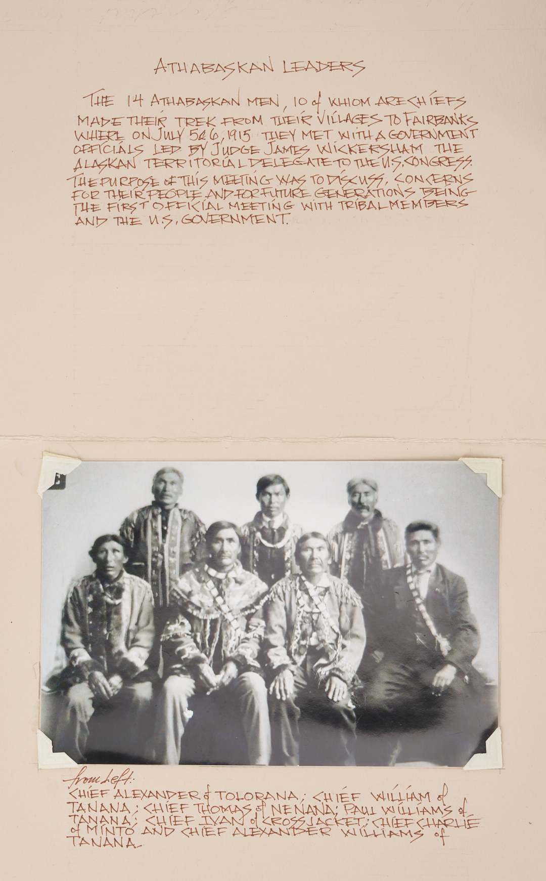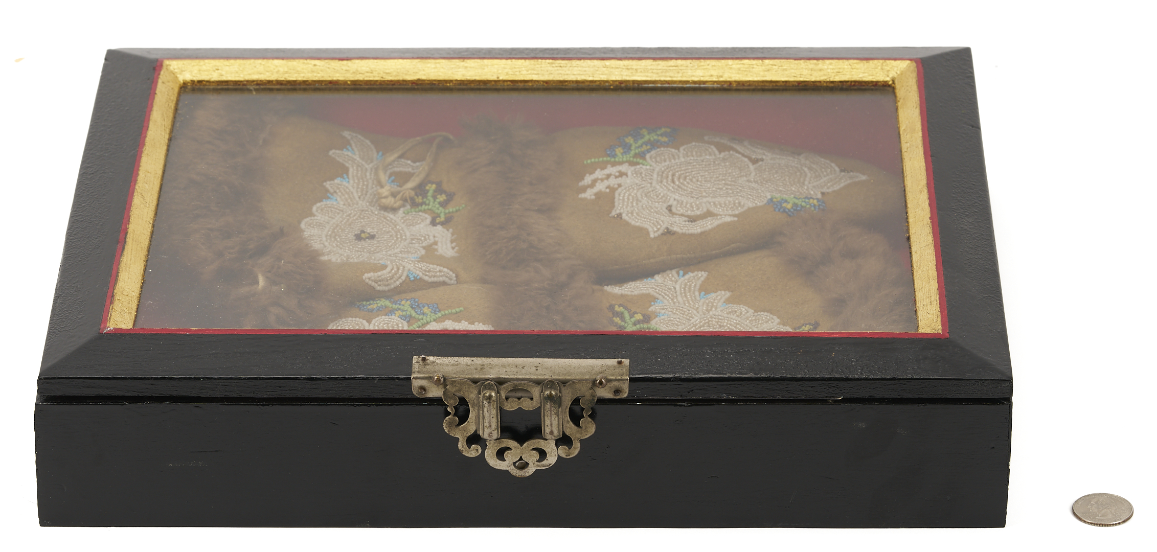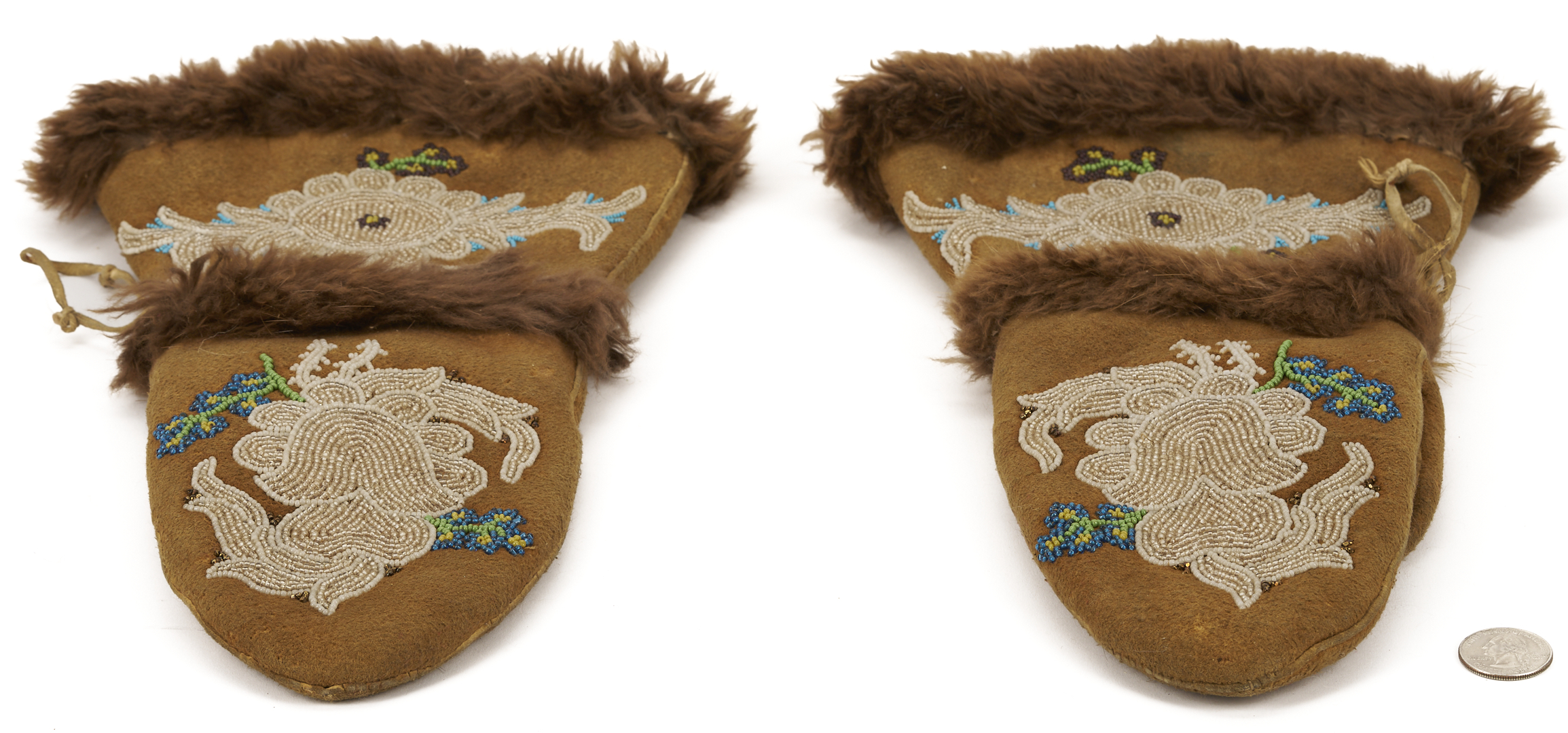 Pair Native American Alaskan Athabaskan beaded gloves or gauntlets with white floral decoration and fur trim. Circa 1930s. With new custom display case, 13 in. L x 7 3/4 in. W. Together with a reproduction of a 1919 photograph depicting Athabascan Chiefs adorned with traditional garments and ornaments.